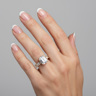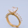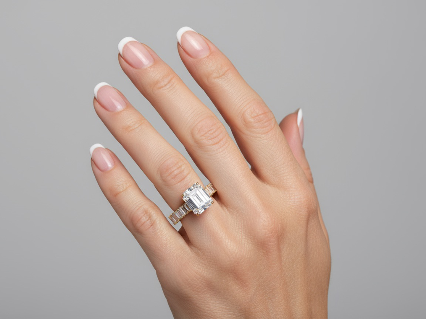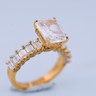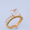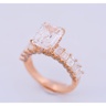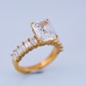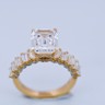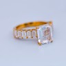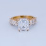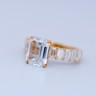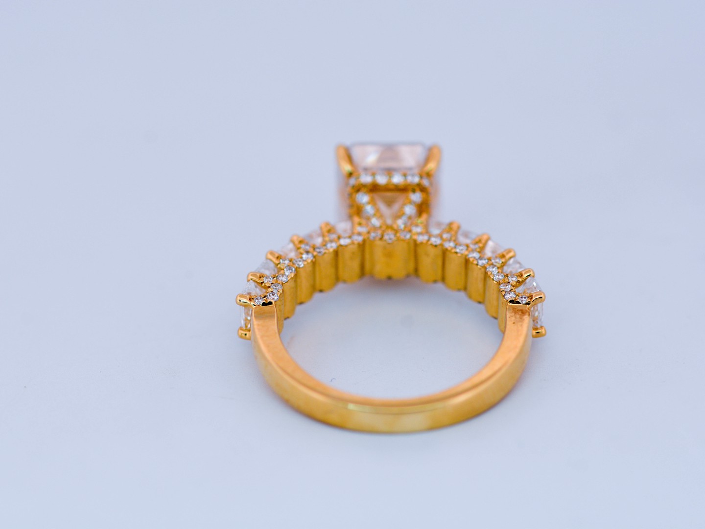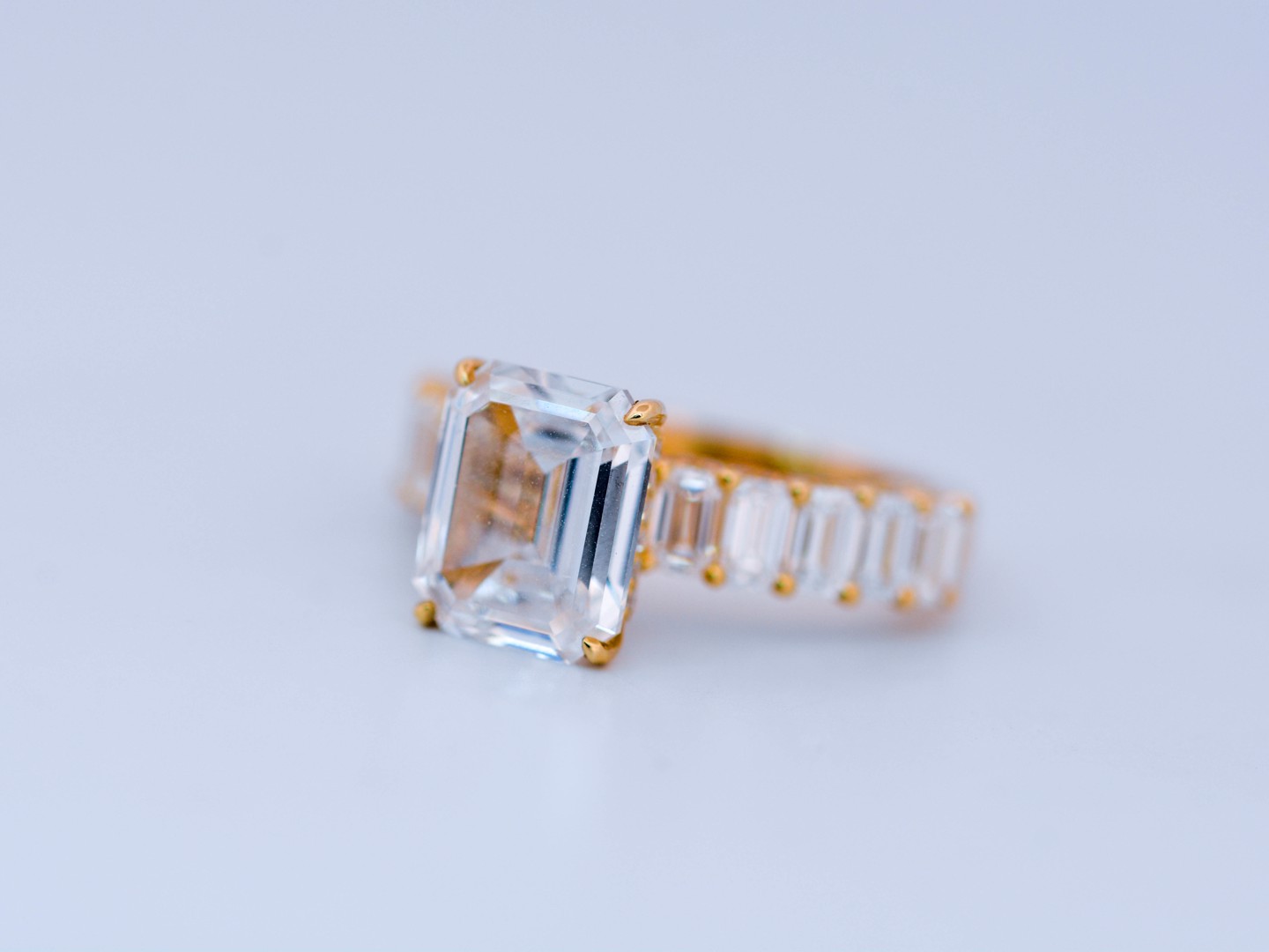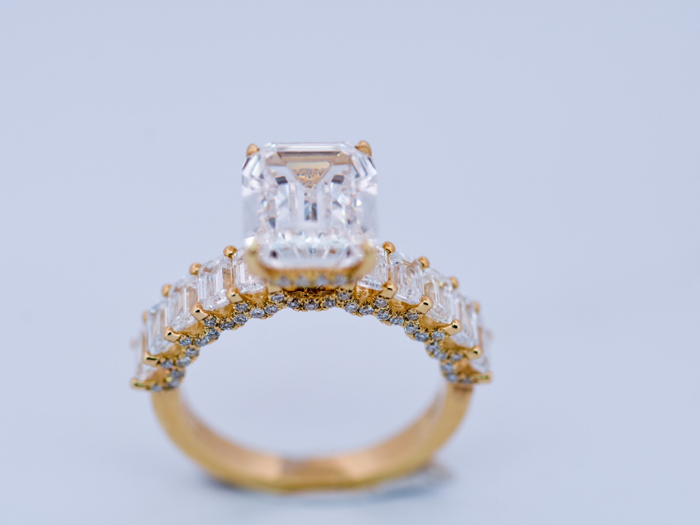 Bague exclusive avec 1 diamant taillé en émeraude de +-4.00CT, couleur : F-G et pureté : VS. Entourée de diamants taillés en émeraude + brillant, total : 2.00CT, couleur : D-F-G et pureté : VS. Montée en or jaune 14kt (marqué 585). Taille de bague : 51-53