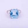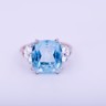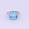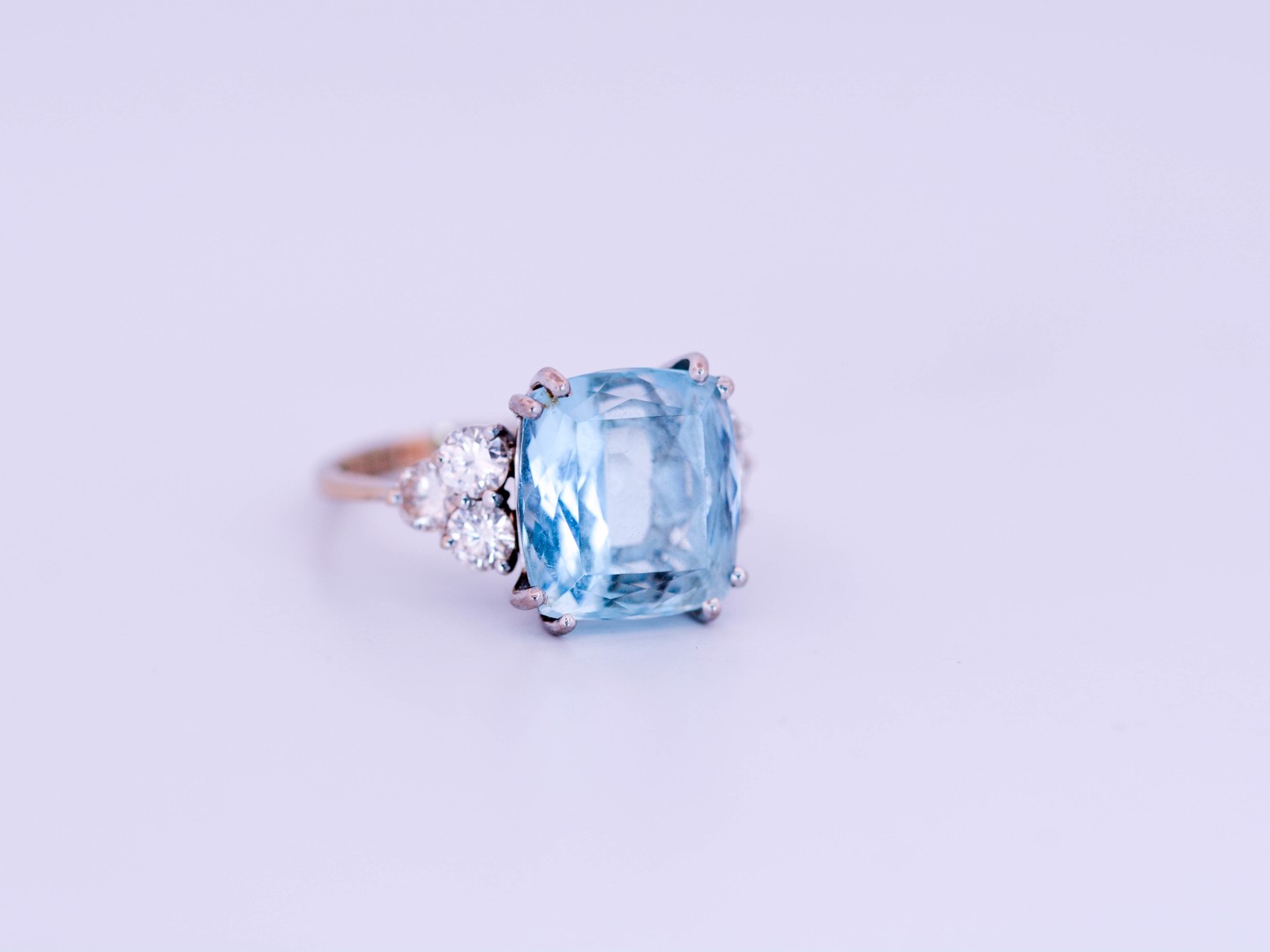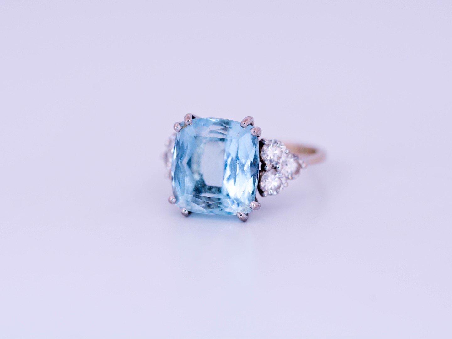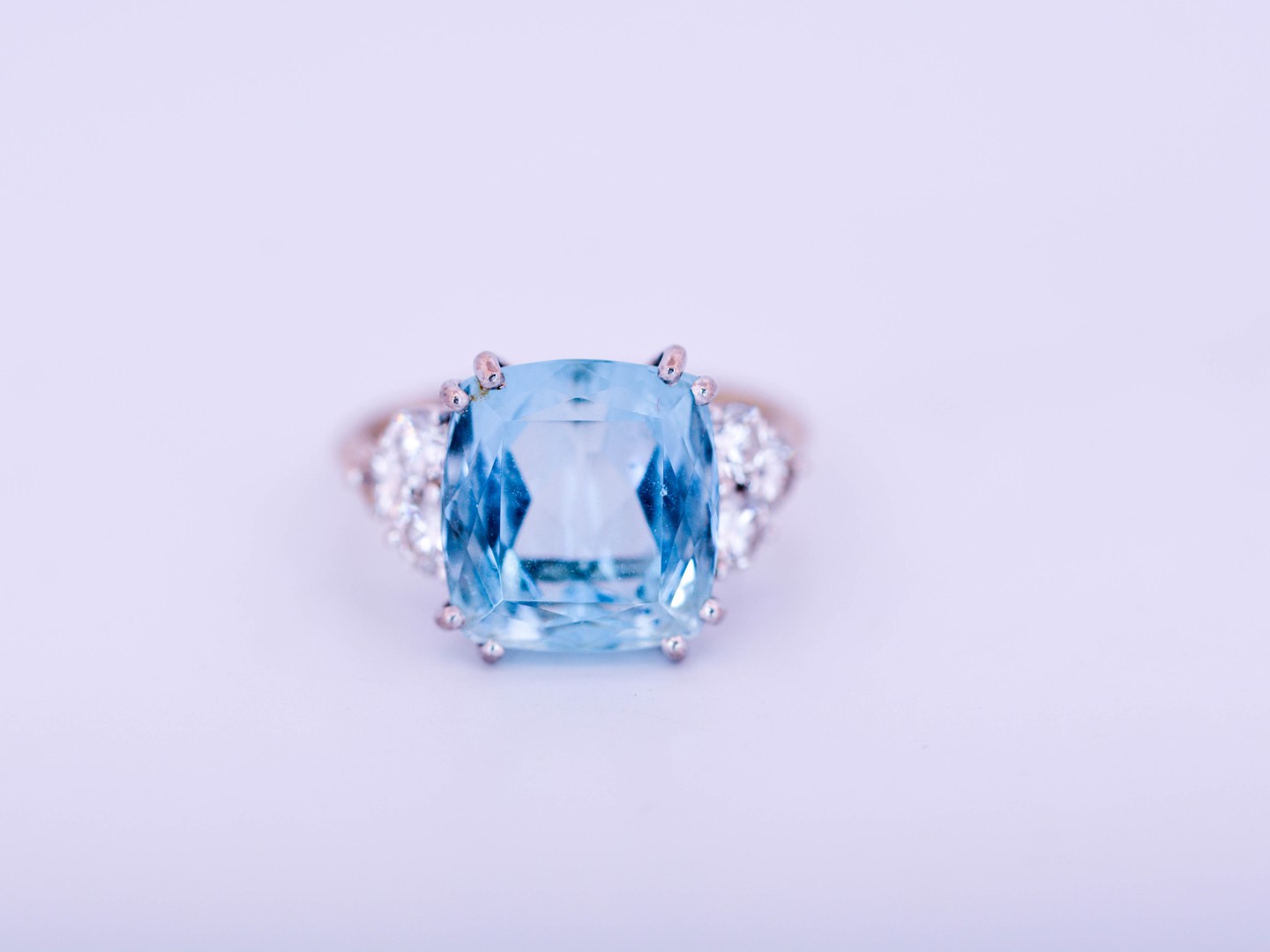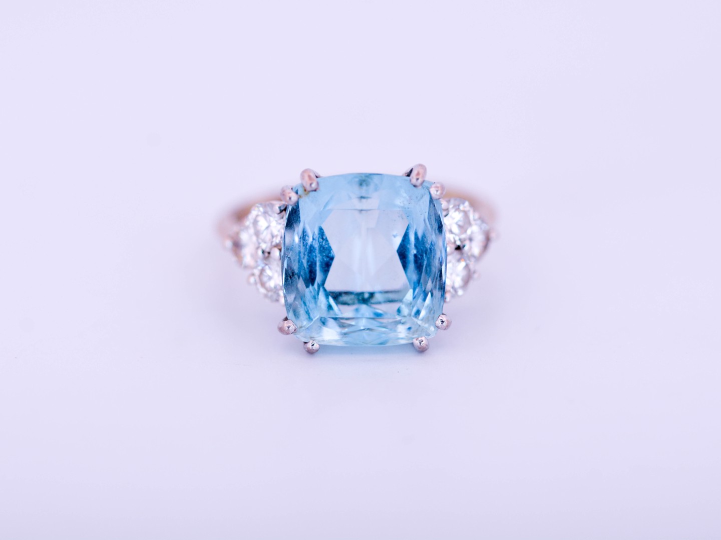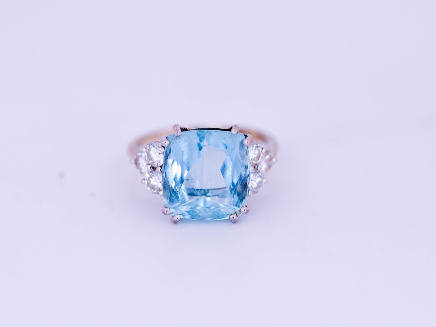Cette bague délicate en or blanc 18 carats met en valeur une aigue-marine d’environ 9 carats, dont la teinte bleue évoque la mer cristalline. Elle est entourée de 6 diamants taille brillant (total env. 0,60 ct, couleur G–H, pureté VS) qui en soulignent l’éclat. Taille de bague : 63–65. Une création élégante où la fraîcheur de la pierre s’allie au raffinement éternel des diamants.