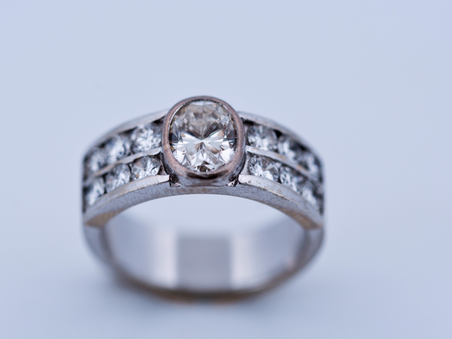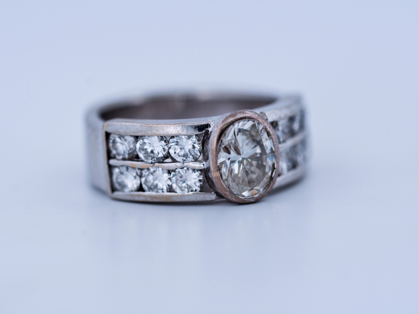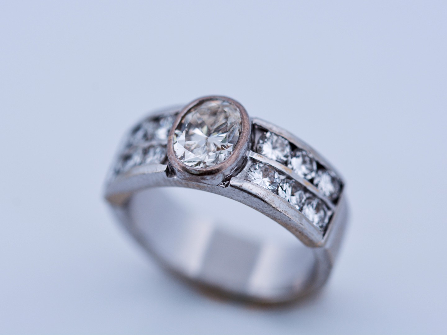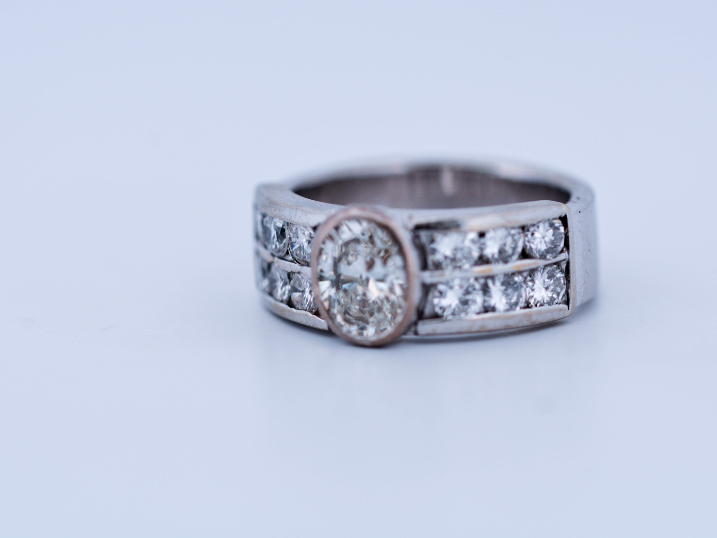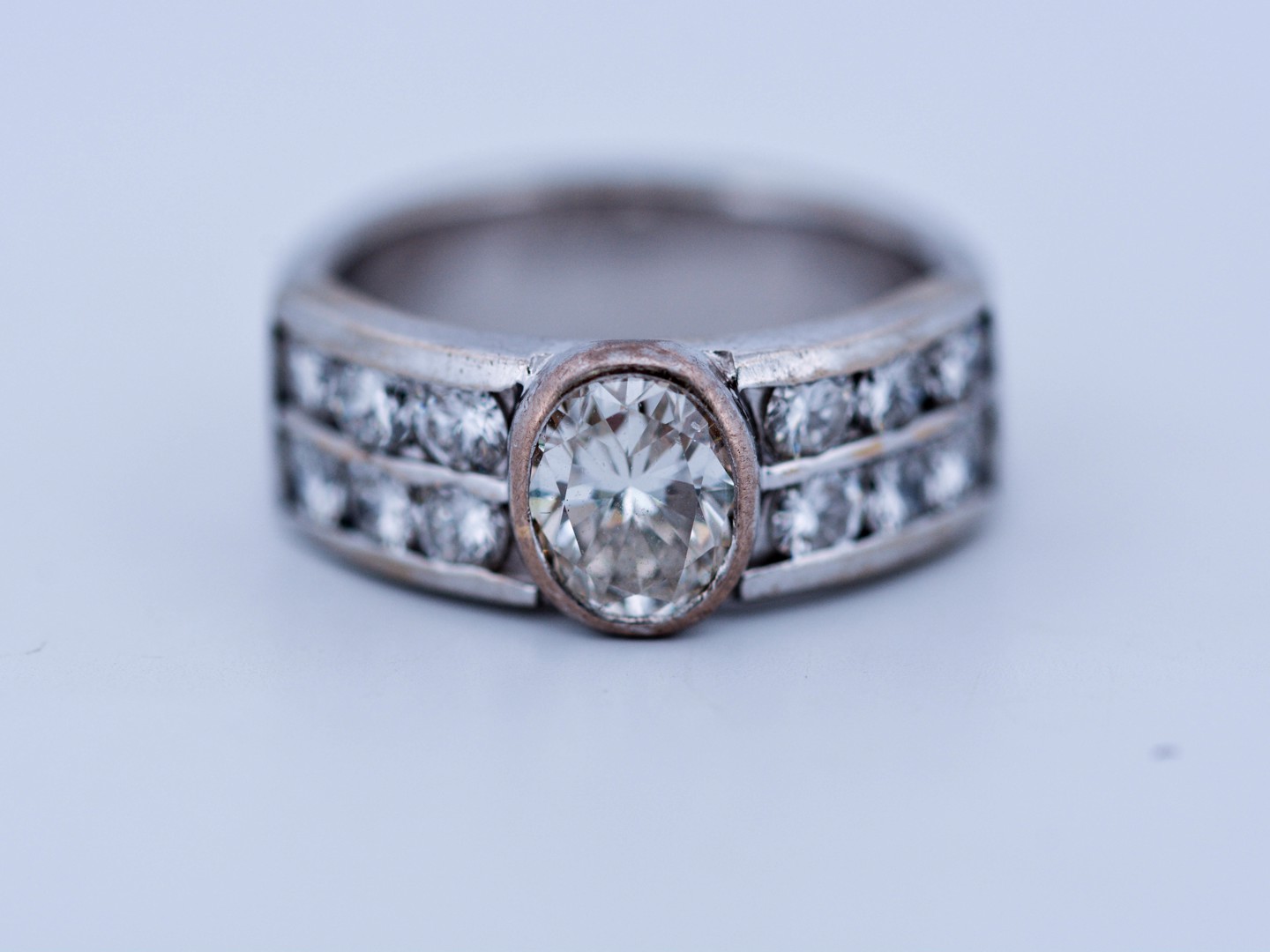 Cette bague raffinée en or blanc 18 carats incarne l’élégance intemporelle. En son centre brille un diamant taille ovale de 1,20 ct (couleur G–H, pureté VS), sublimé par 6 diamants taille brillant totalisant env. 1,20 ct (couleur G–H, pureté VS). Taille de bague : 55–57. Une pièce qui unit harmonie et éclat dans une composition exquise.