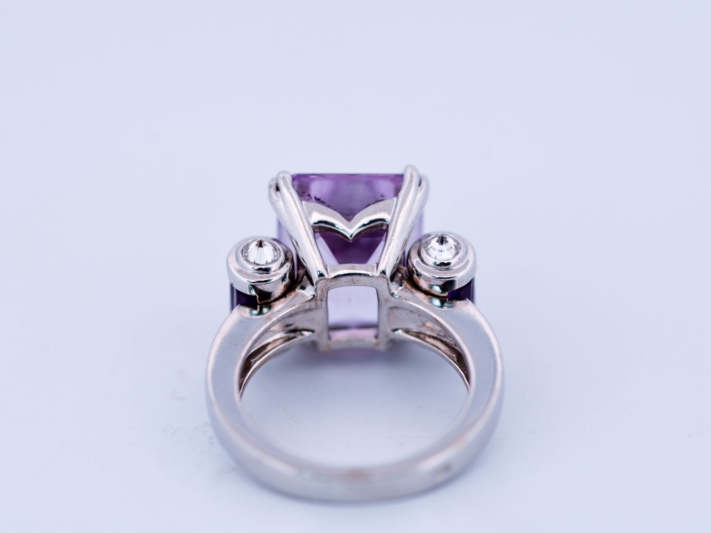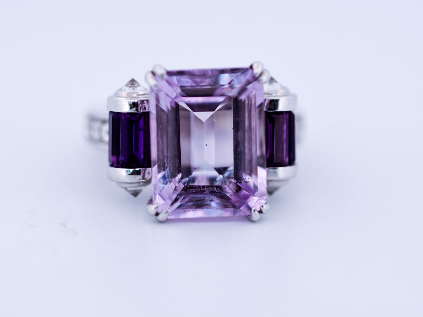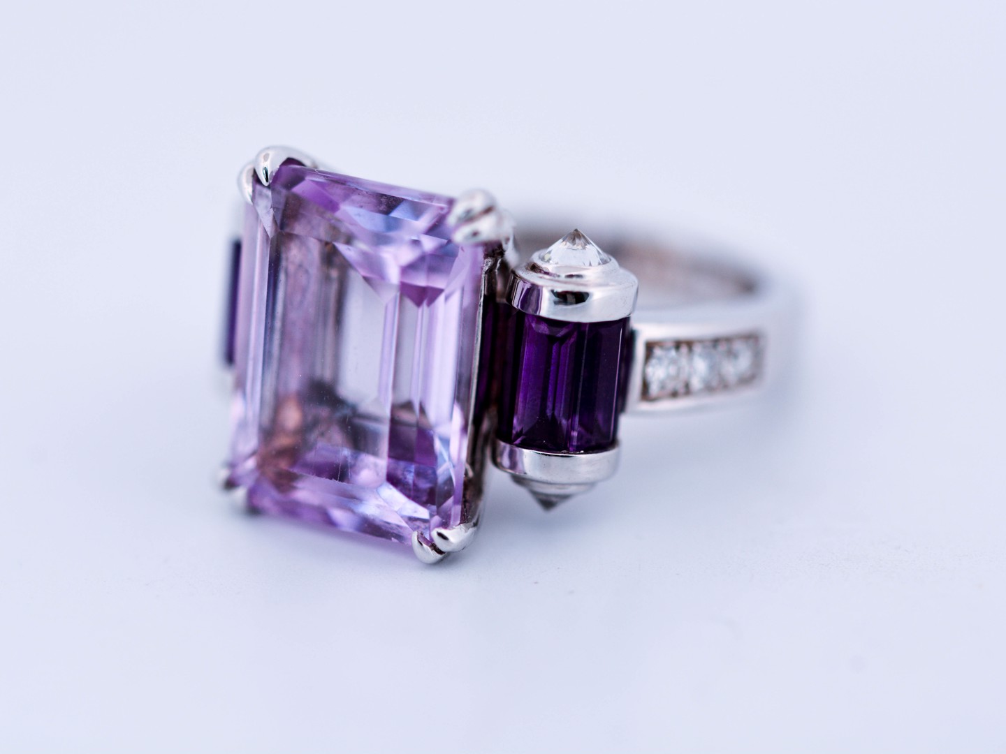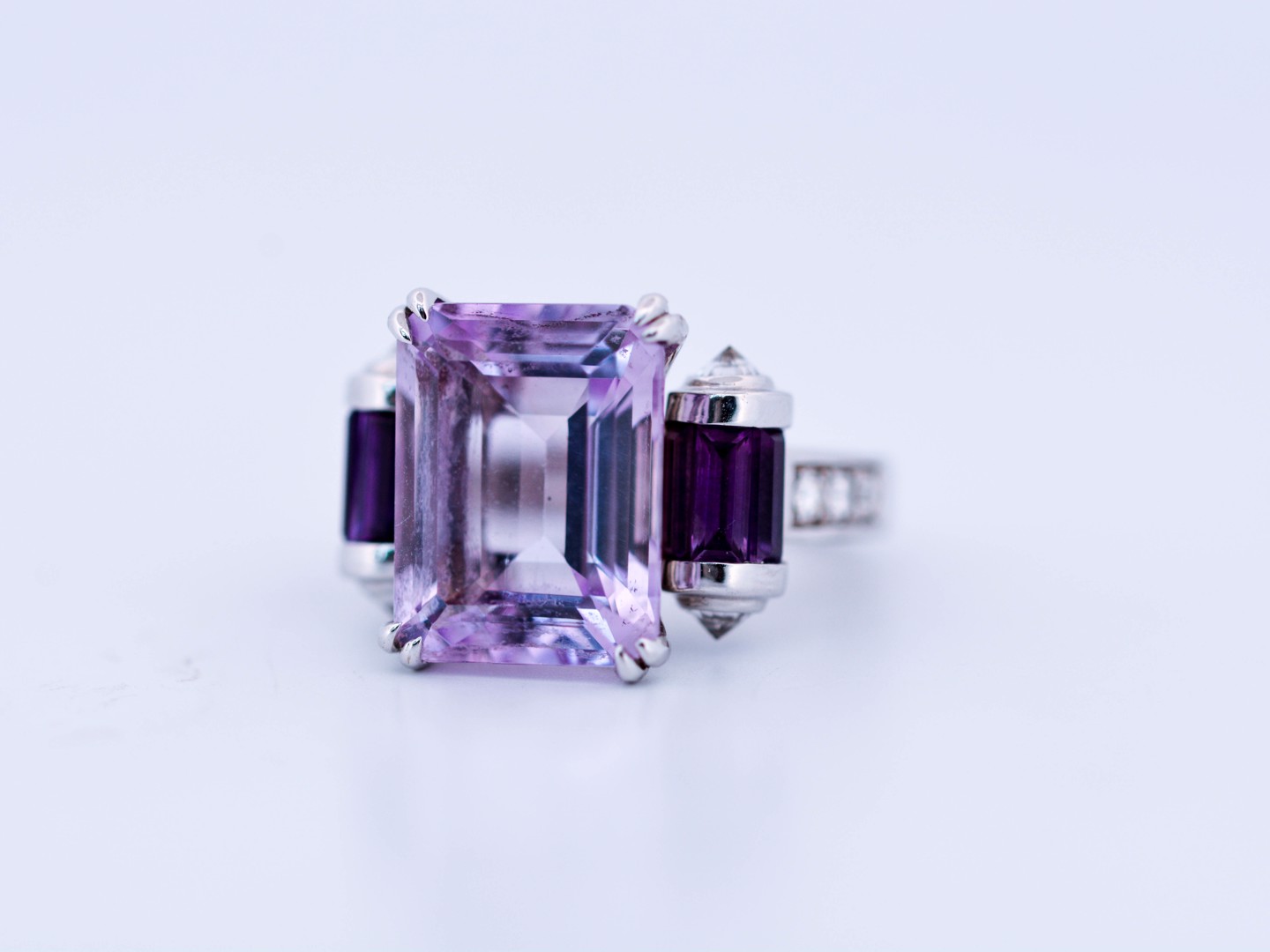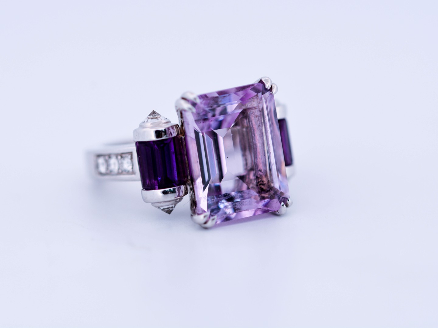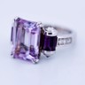 Cette bague exceptionnelle de la maison prestigieuse Mauboussin célèbre la couleur et le savoir-faire. En son centre, une améthyste d’environ 7 carats, sublimée par 8 améthystes taille baguette et rehaussée de 10 diamants taille brillant. Réalisée en or blanc 18 carats et poinçonnée à l’intérieur « Mauboussin Paris » avec numéro de série. Une création rare qui incarne l’élégance et l’exclusivité françaises.