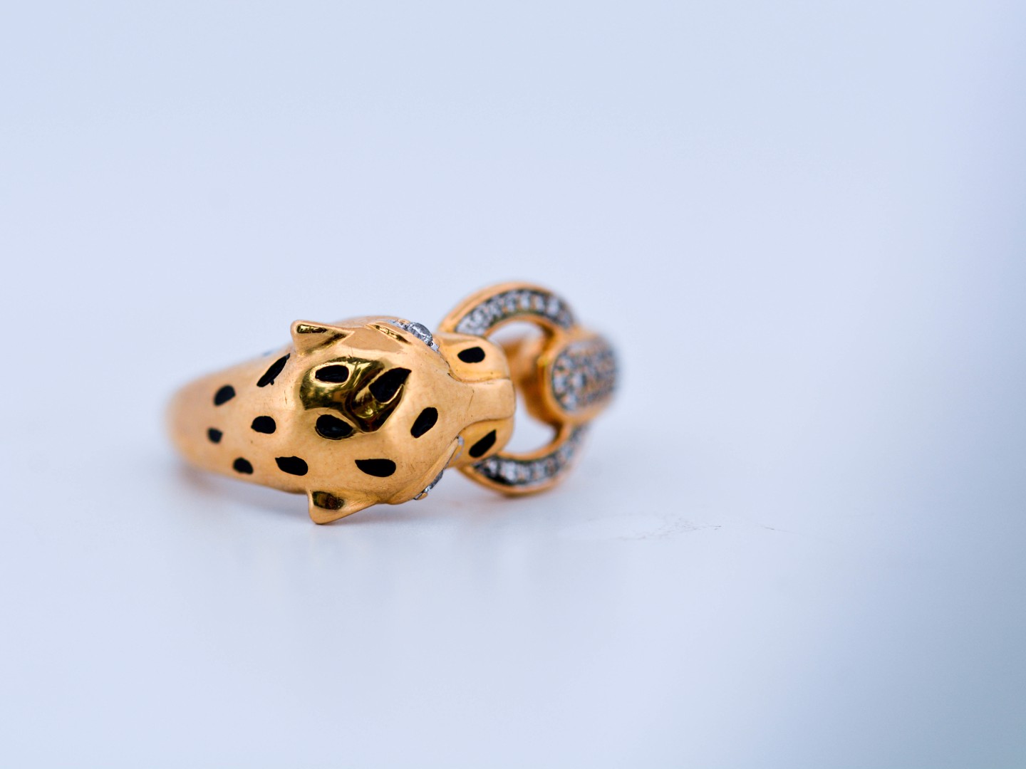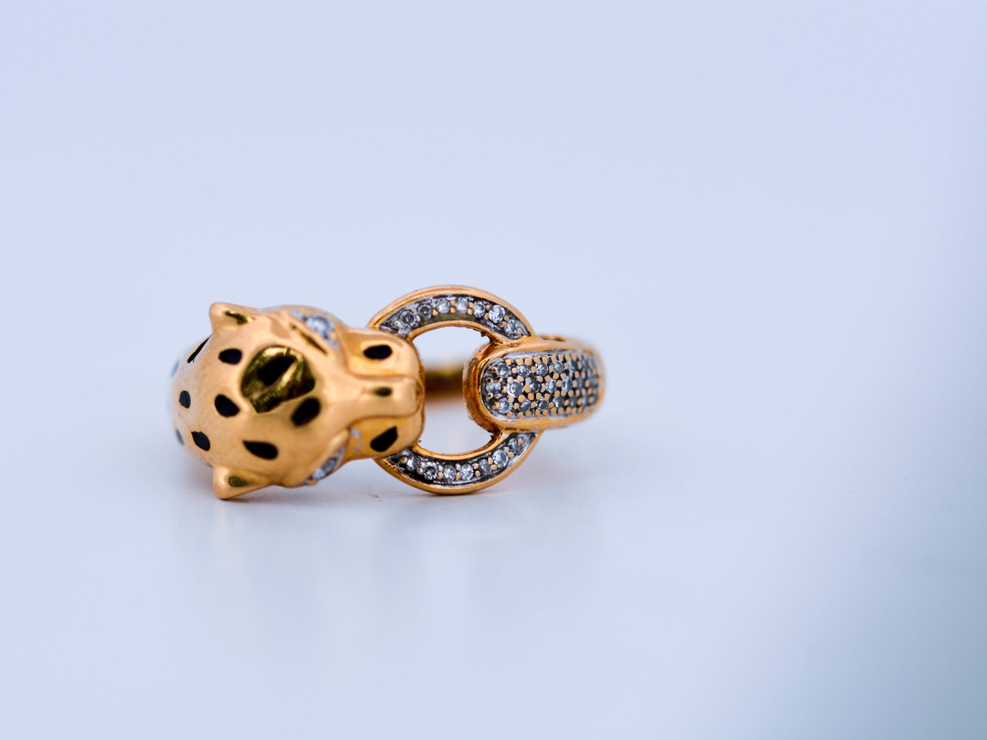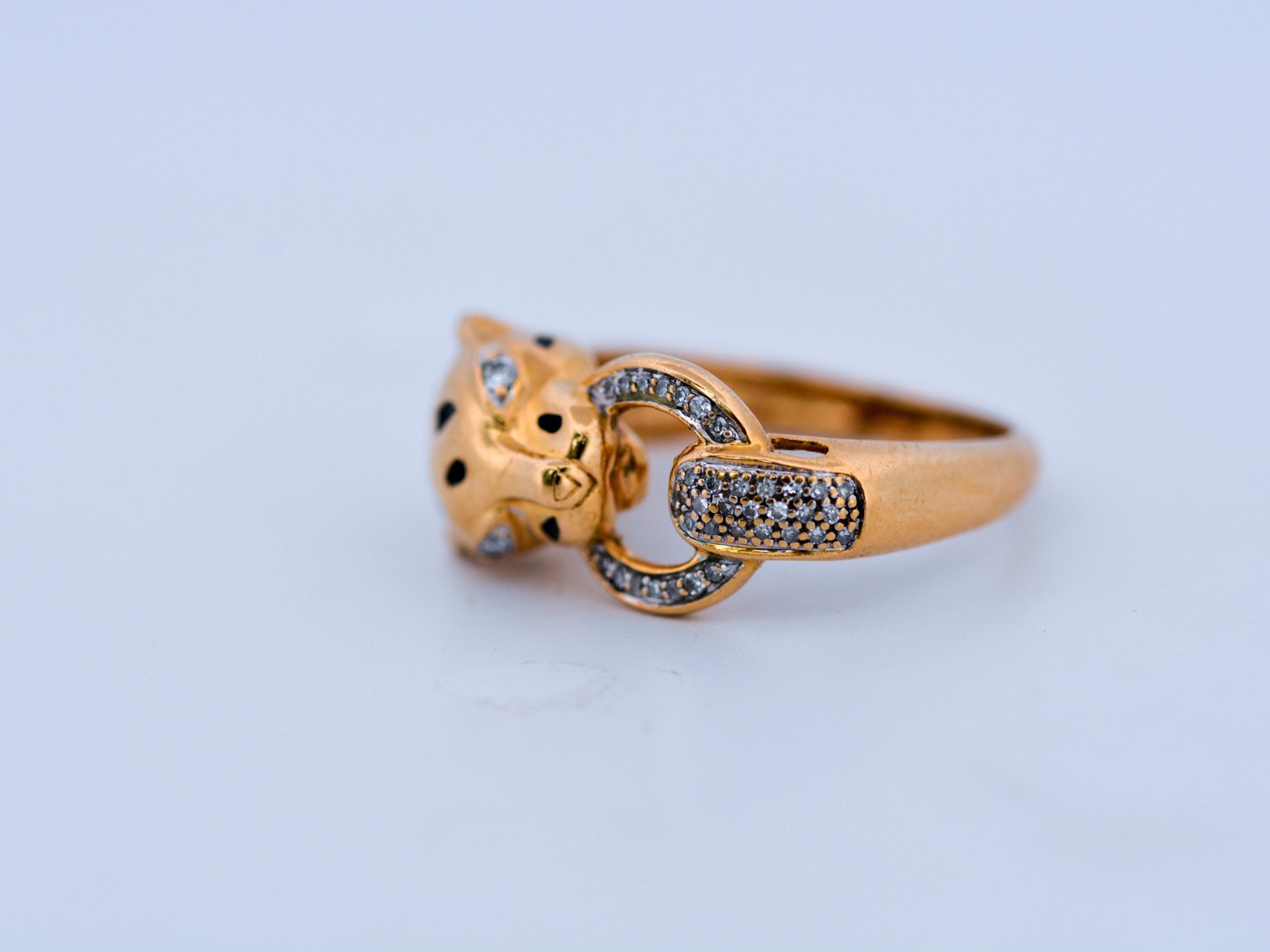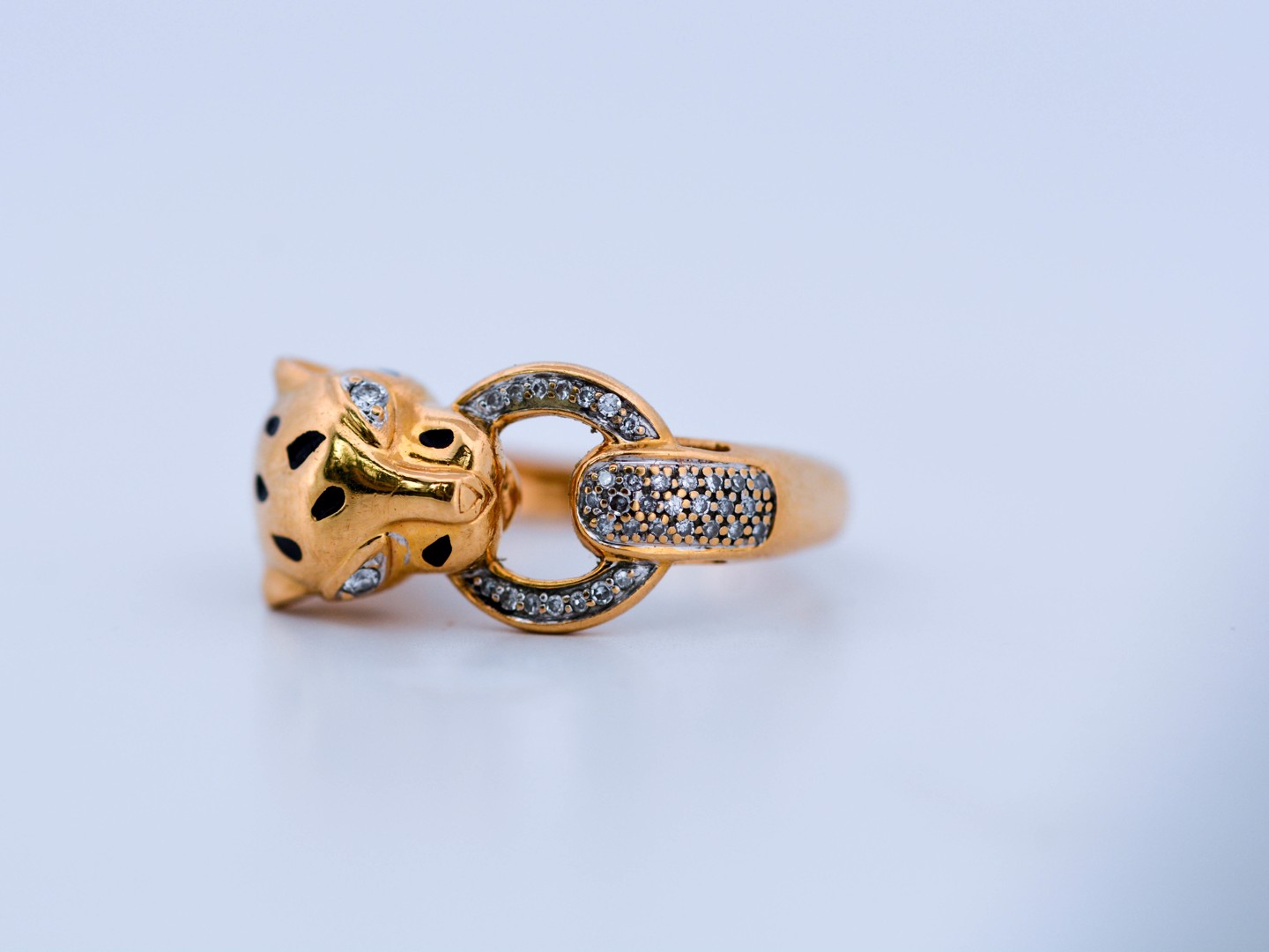 Cette bague panthère emblématique en or jaune 18 carats est sertie de 36 diamants taille brillant (couleur F–G, pureté VS). Son design puissant allie élégance et caractère, faisant de la panthère un symbole intemporel de force et de raffinement. Poinçon 750. Poids : 4,13 g. Taille de bague : 52–54. Un bijou qui marie éclat et audace.