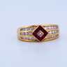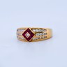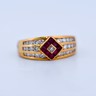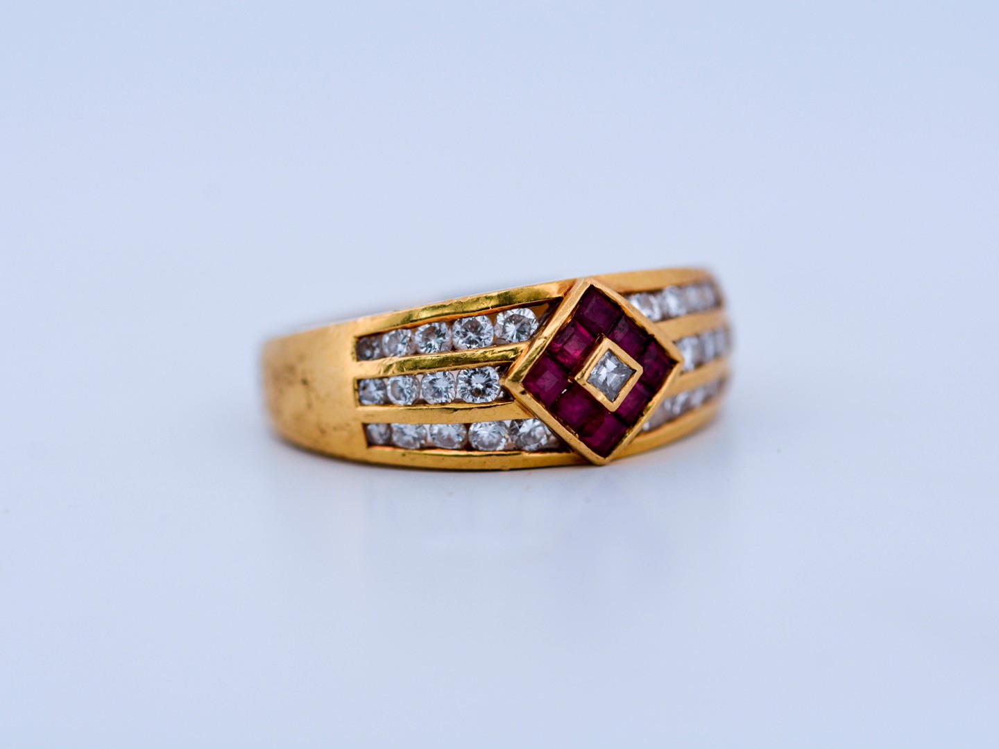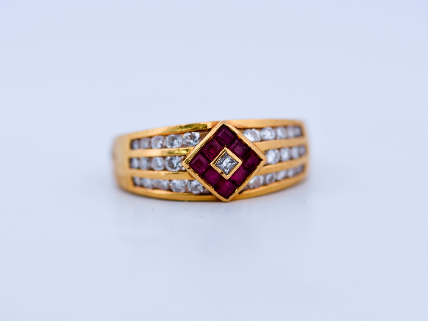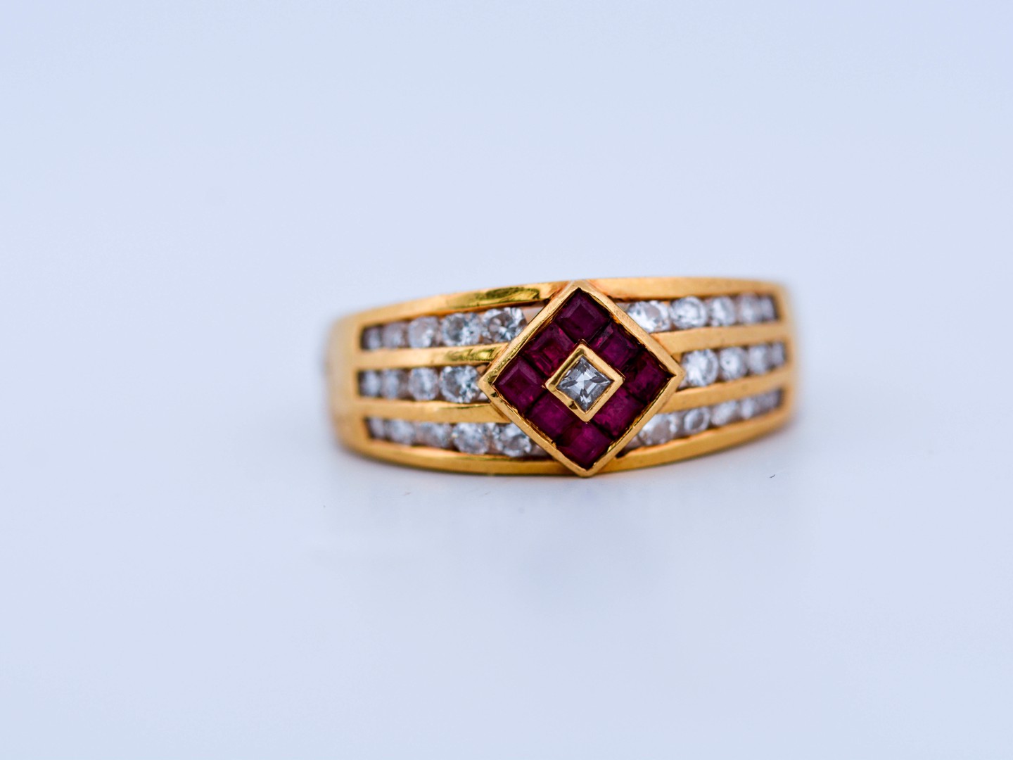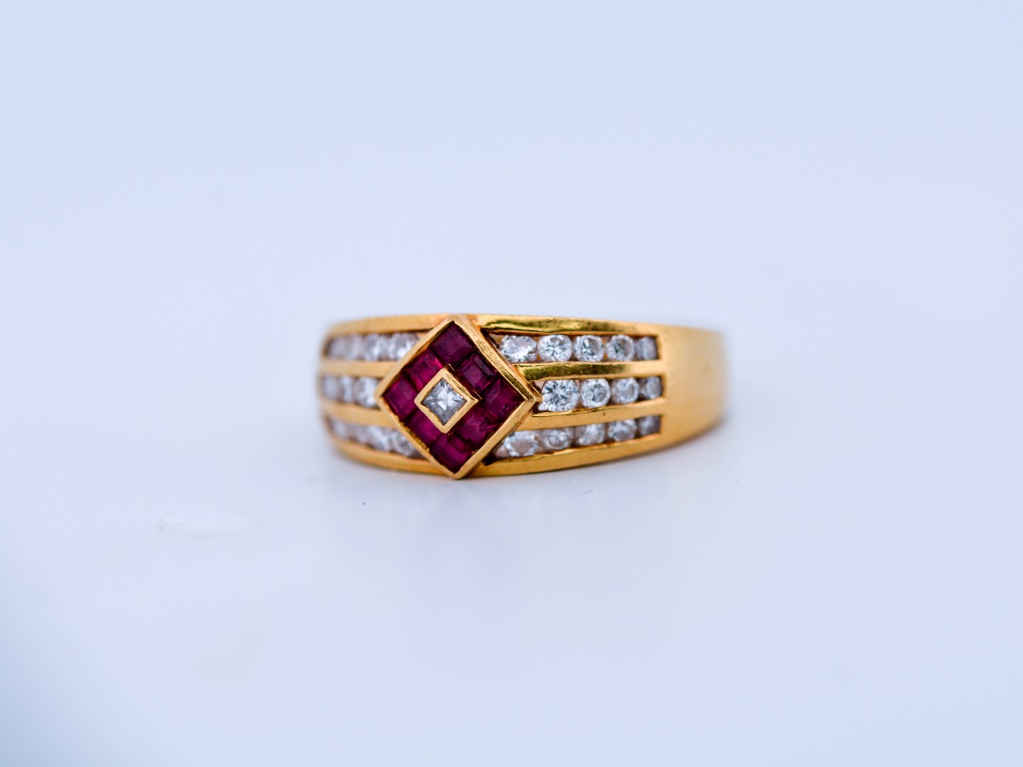 Bague de caractère en or blanc 18 ct, ornée en son centre de 8 rubis d’env. 0,50 ct, entouré de 28 diamants taille brillant et une princesse (total env. 0,70 ct, couleur F–G, pureté VS). Taille : 56–58. Poids : 6,04 g. Une création pleine de charme qui marie l’éclat ardent du rubis à la brillance intemporelle du diamant.