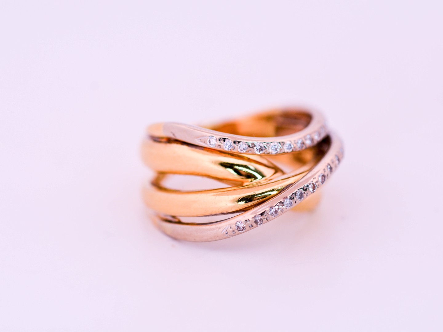 Bague exclusive en or jaune et blanc 18 ct, sertie de 24 diamants taille brillant totalisant env. 0,48 ct (couleur F–G, pureté VS). Taille : 53–55. Poids : 11,17 g. Une création luxueuse où éclat et élégance s’unissent en parfaite harmonie.
