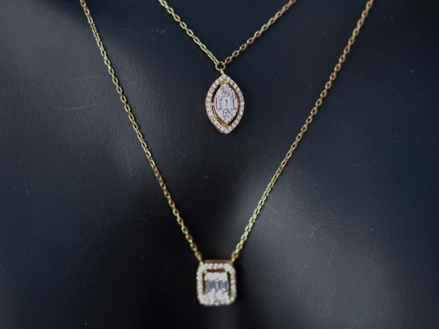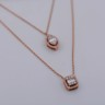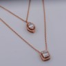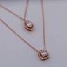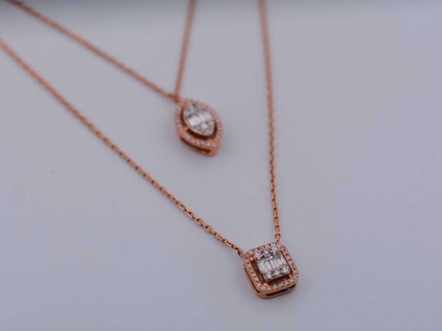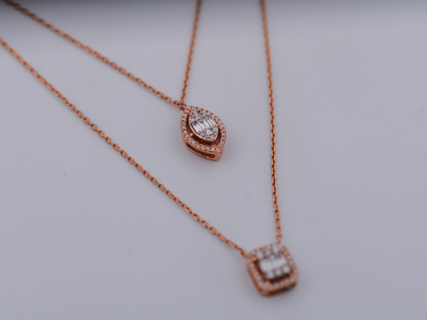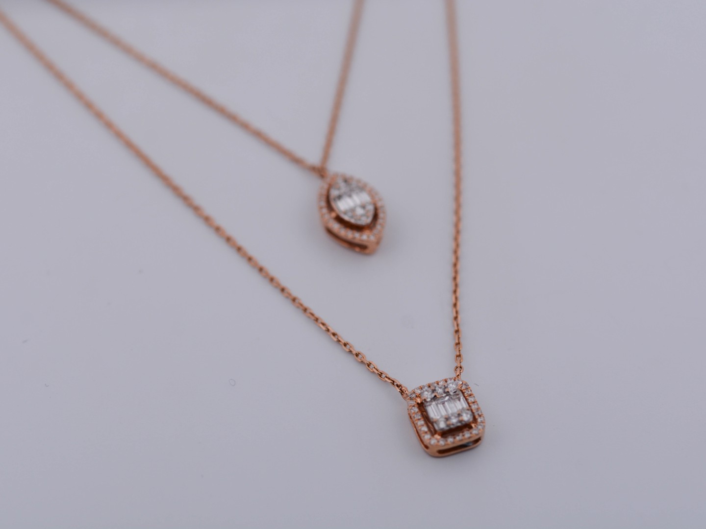Un collier double raffiné en or rose 18 ct (poinçon 750), orné d’un pendentif serti de 32 diamants taille brillant et de 3 diamants taille baguette. Total env. 0,80 ct (couleur D–F, pureté VS). Le collier principal mesure 45 cm et le plus court 38 cm. Une création élégante qui marie design moderne et luxe intemporel.