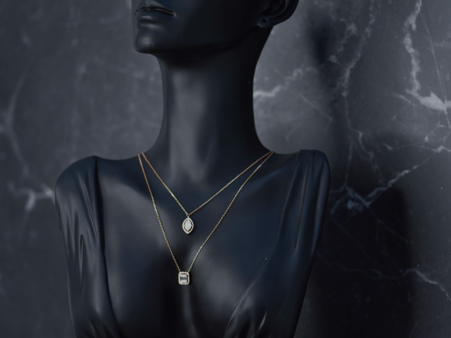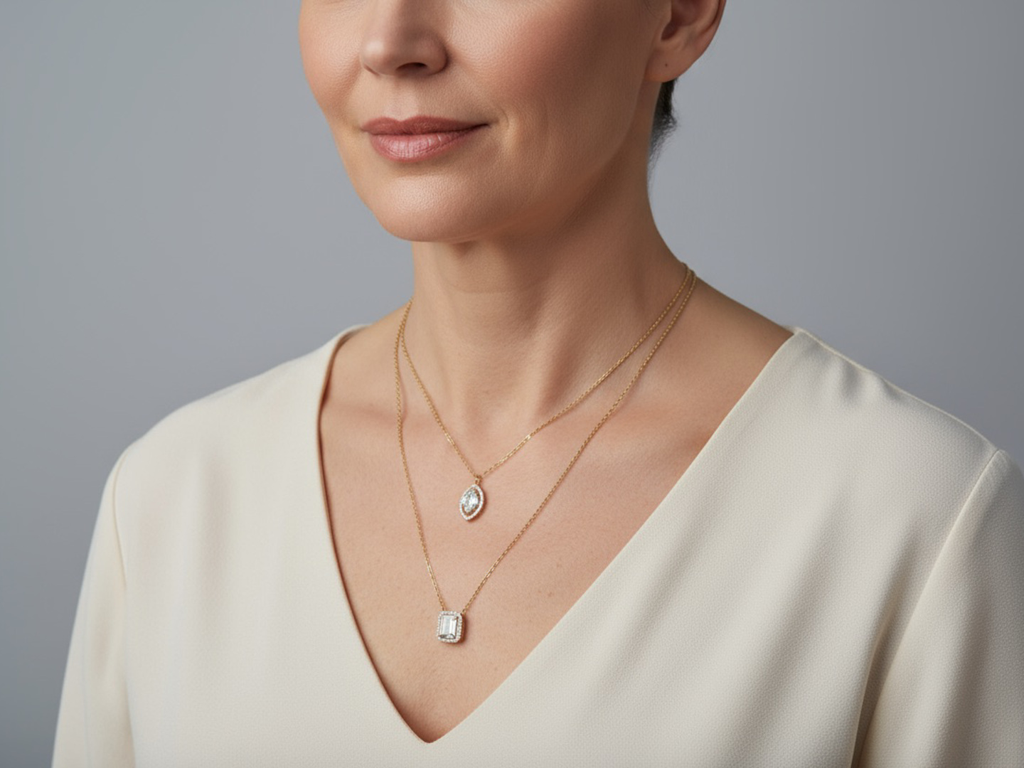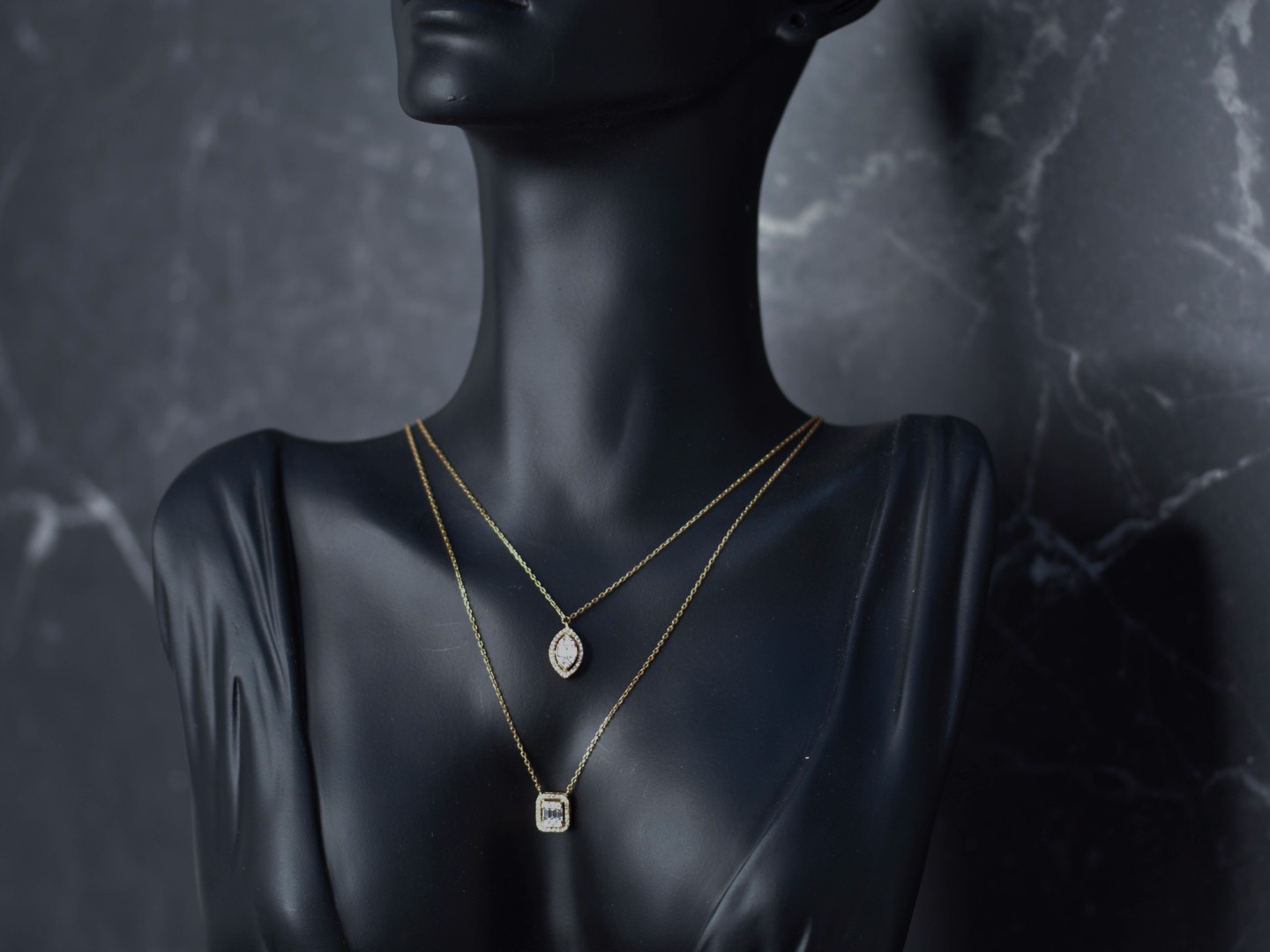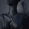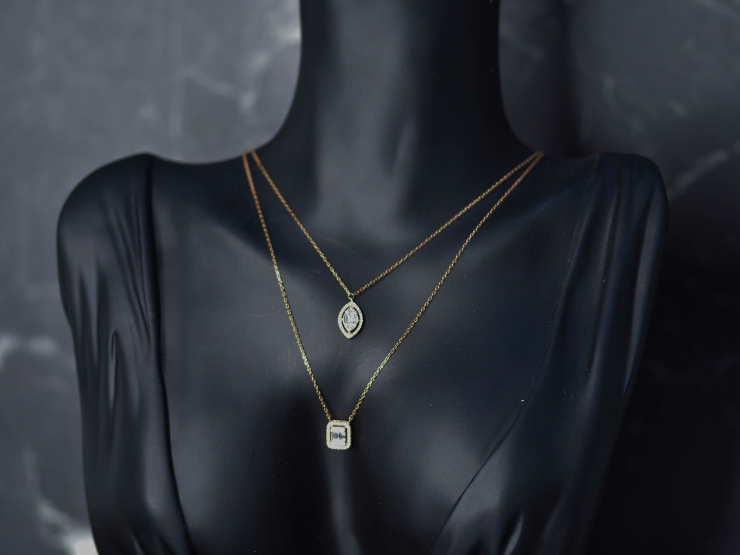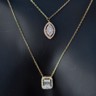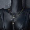 Un collier double raffiné en or rose 18 ct (poinçon 750), orné d’un pendentif serti de 32 diamants taille brillant et de 3 diamants taille baguette. Total env. 0,80 ct (couleur D–F, pureté VS). Le collier principal mesure 45 cm et le plus court 38 cm. Une création élégante qui marie design moderne et luxe intemporel.