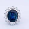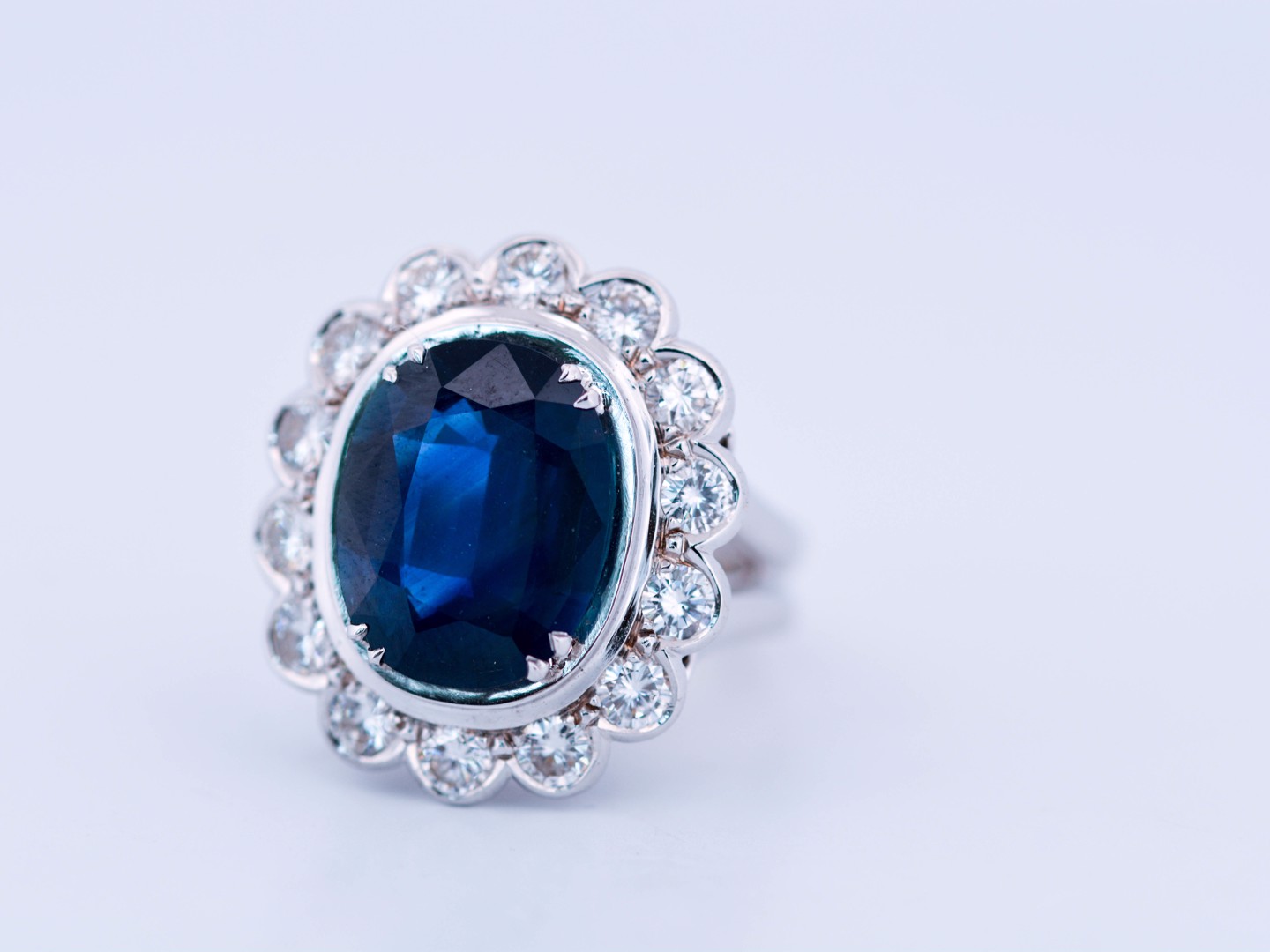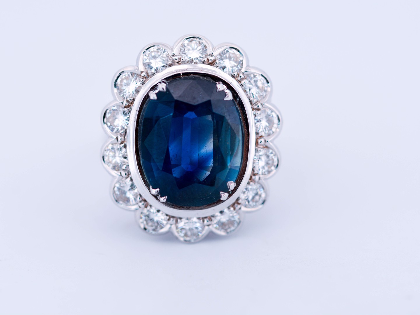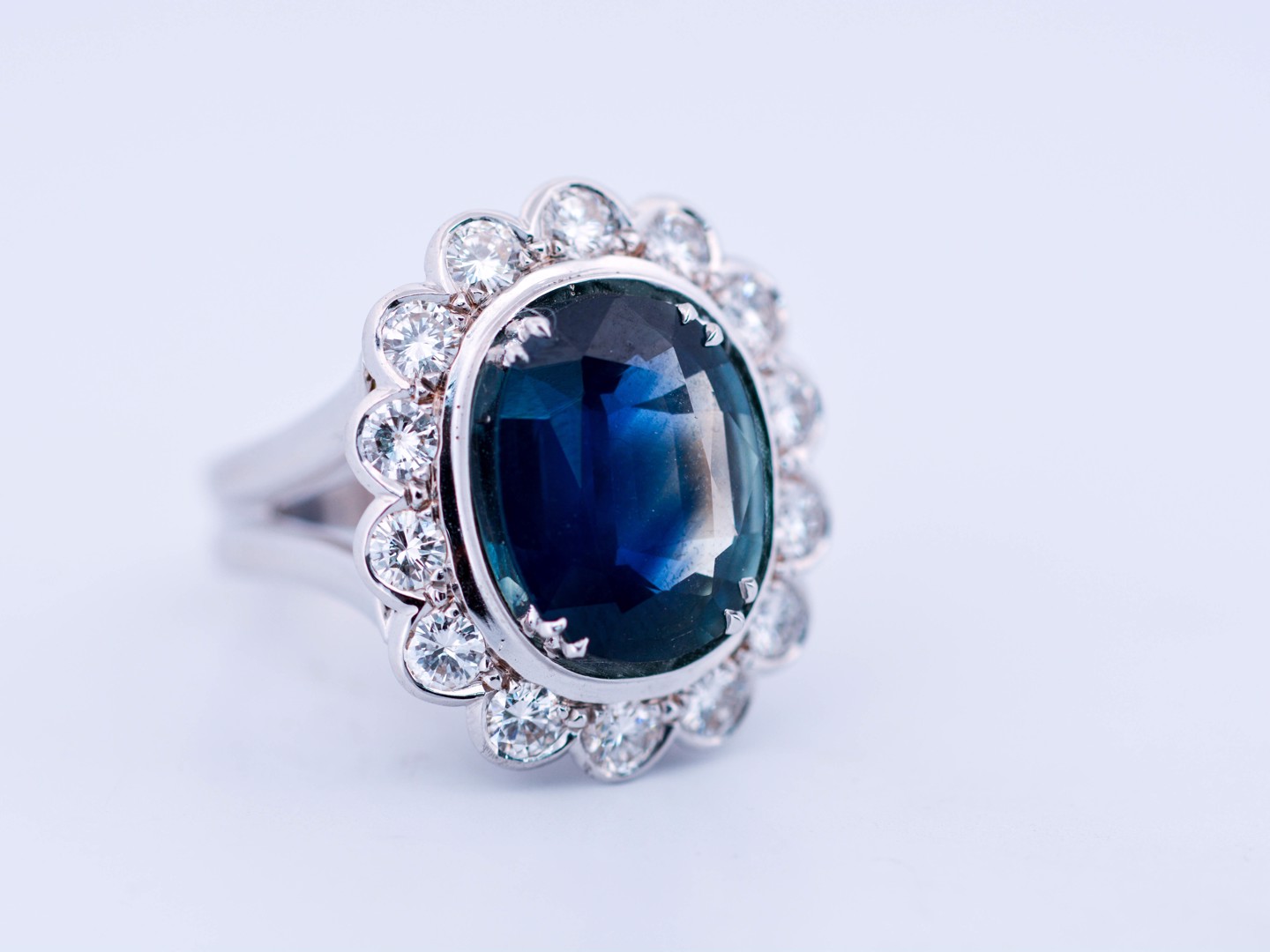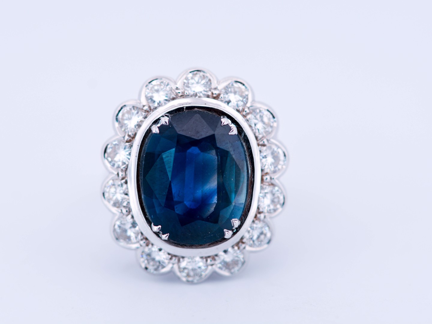 Une bague de qualité en or blanc 18 ct, ornée en son centre d’un saphir exceptionnel d’env. 7,75 ct Intense Blue Siam, Thaïlande. La pierre est accompagnée d’un certificat du Karat Gemological Laboratory. La gemme centrale est entourée de 14 diamants taille brillant totalisant env. 2,20 ct. Taille : 53–55. Dimensions de la tête : env. 24,5 × 21,2 mm. Un bijou exclusif qui associe la rareté d’une pierre précieuse exceptionnelle à une élégance intemporelle.