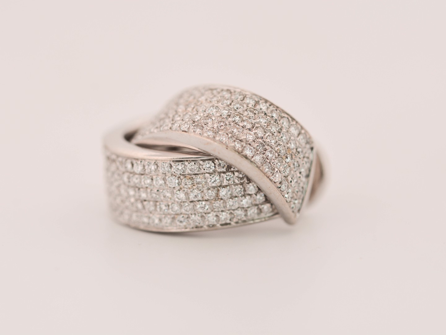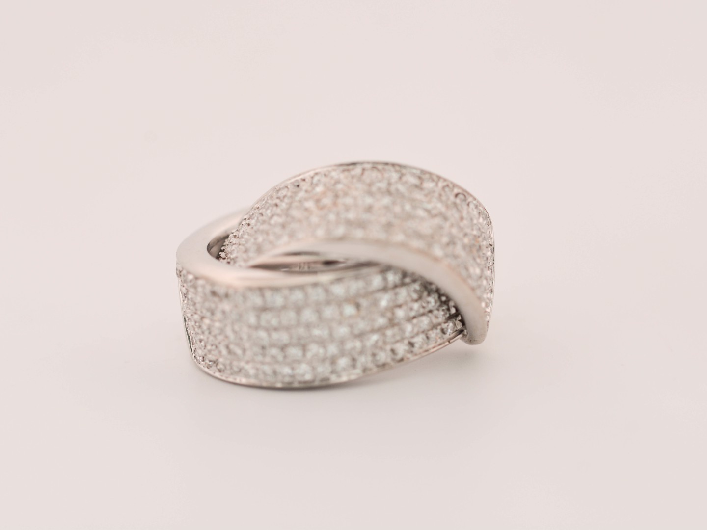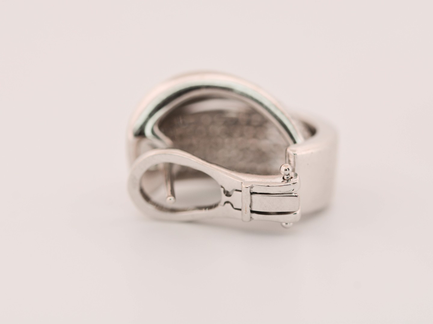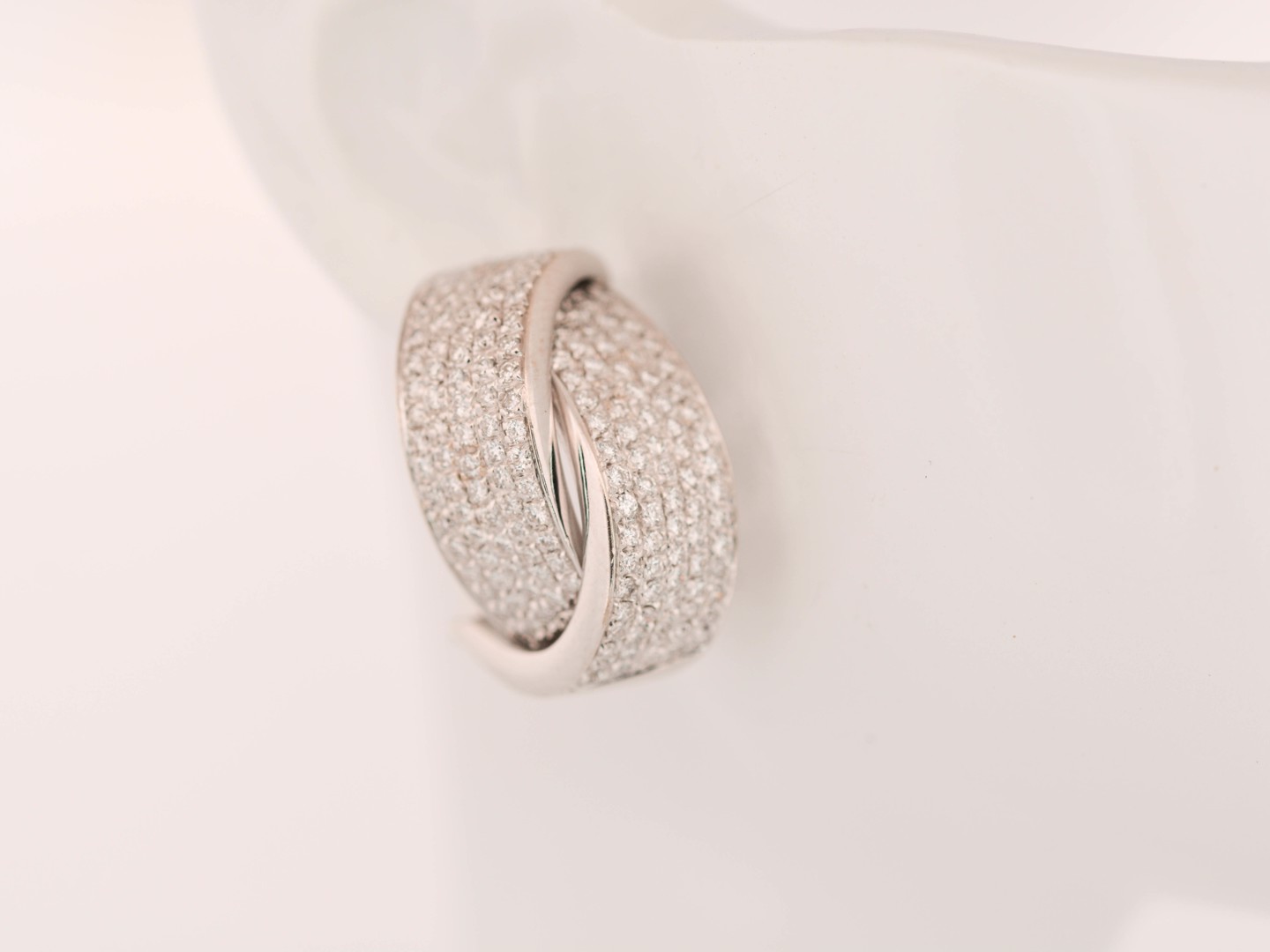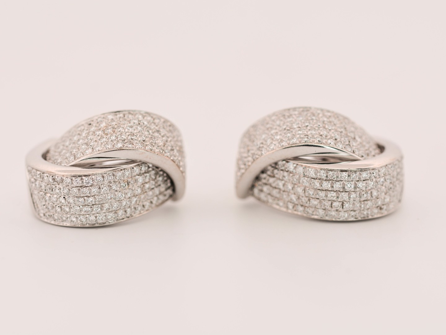 Une paire de boucles d’oreilles de grande qualité en or blanc 18 ct (poinçon 750), somptueusement serties de 326 diamants blancs taille brillant, totalisant env. 3,40 ct (couleur D–F, pureté VS). Dimensions : env. 23 × 14,5 mm. Une création luxueuse qui se distingue par un éclat exceptionnel et une élégance raffinée.