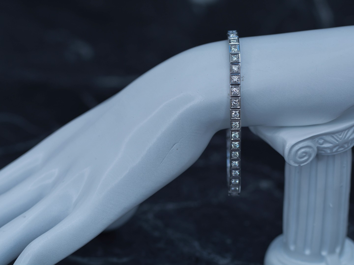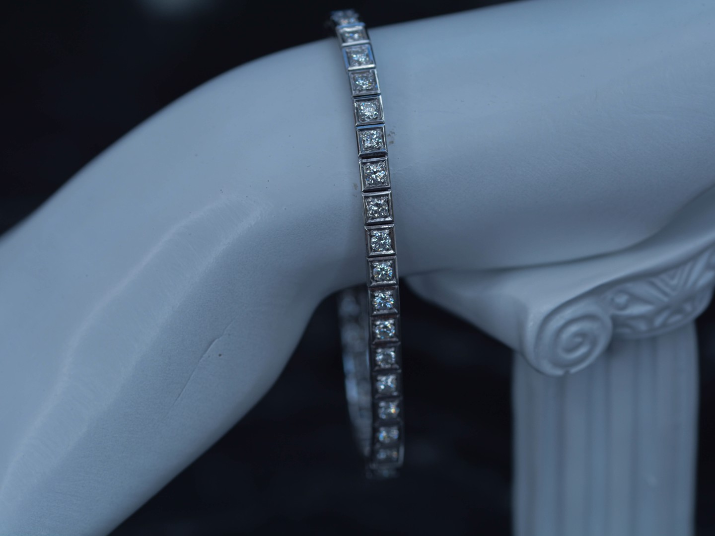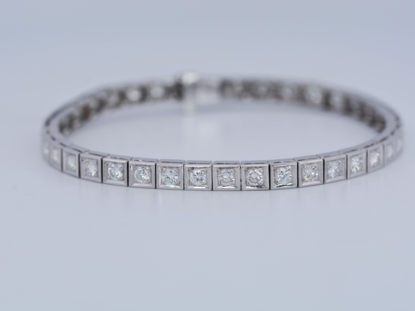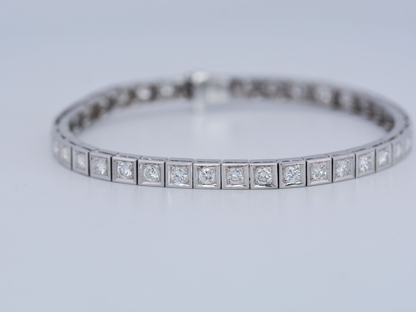 Un bracelet de grande qualité en or blanc 18 ct (poinçon 750), serti de 39 diamants blancs taille brillant totalisant env. 5,00 ct (couleur F, blanc exceptionnel, pureté VS). Longueur : env. 19,5 cm. Poids : 21 g. Une création luxueuse qui associe la qualité exceptionnelle des diamants à une élégance intemporelle.
