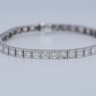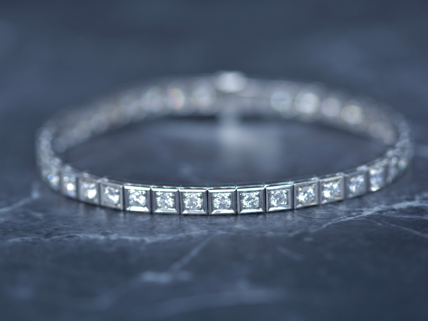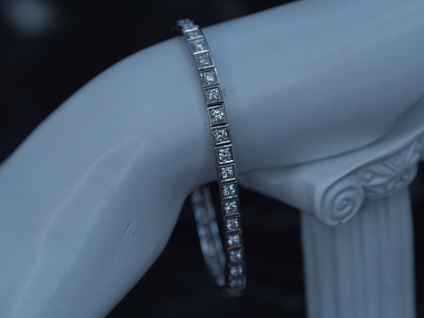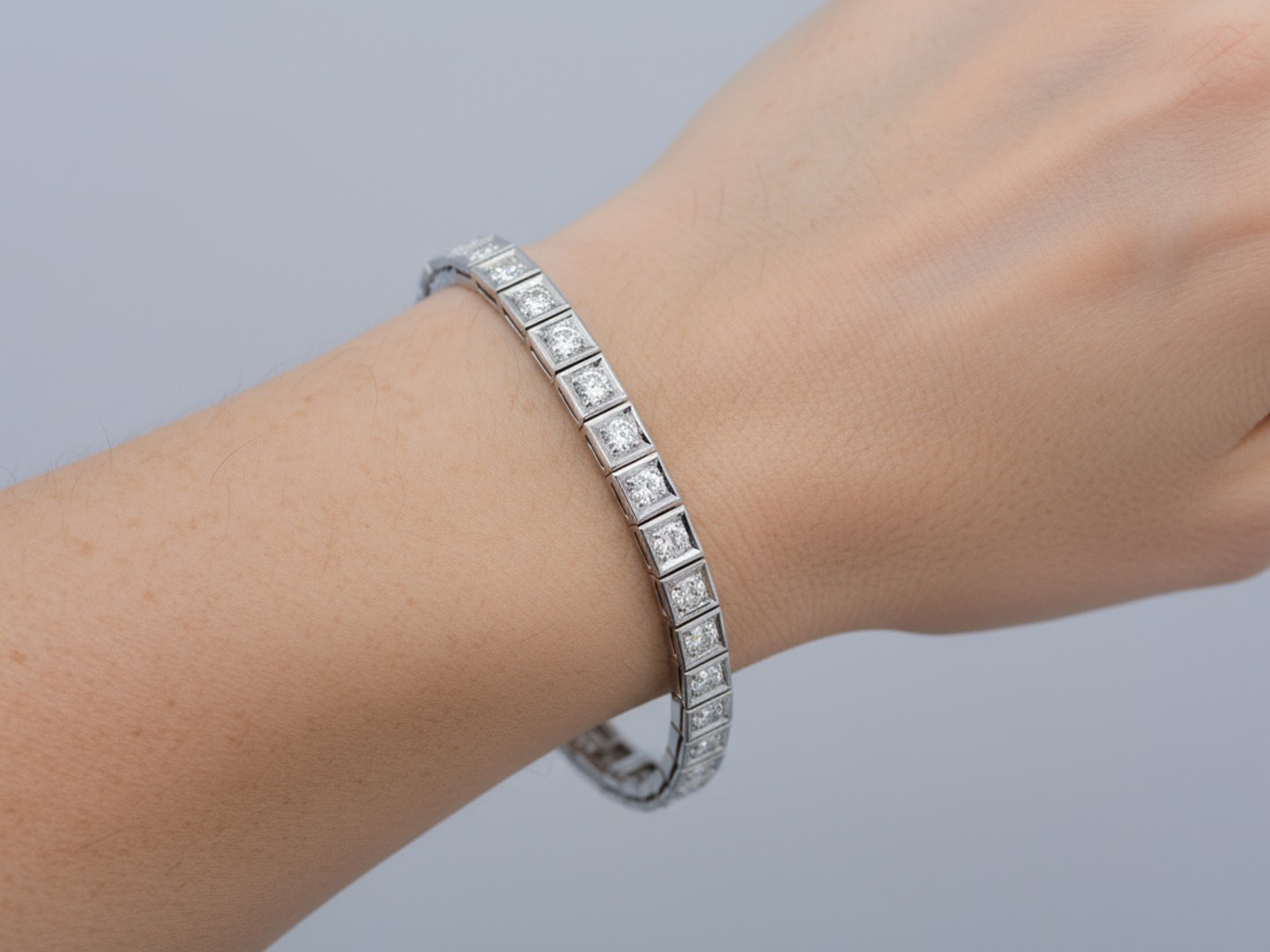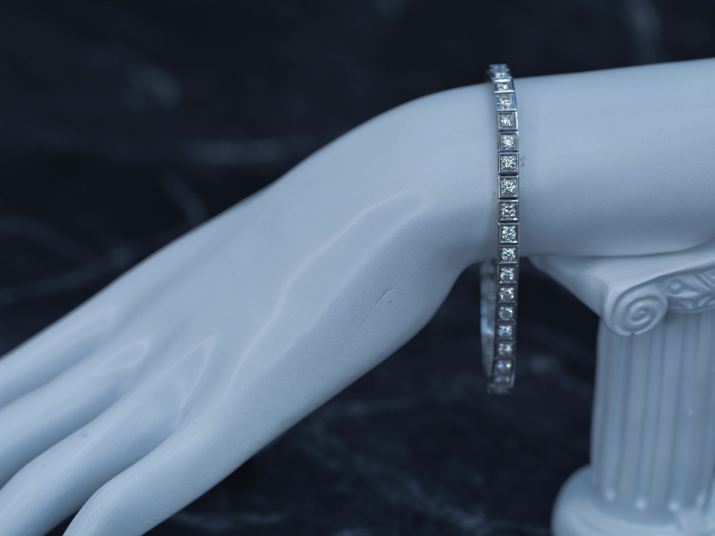 Un bracelet de grande qualité en or blanc 18 ct (poinçon 750), serti de 39 diamants blancs taille brillant totalisant env. 5,00 ct (couleur F, blanc exceptionnel, pureté VS). Longueur : env. 19,5 cm. Poids : 21 g. Une création luxueuse qui associe la qualité exceptionnelle des diamants à une élégance intemporelle.