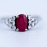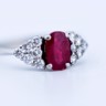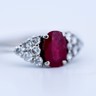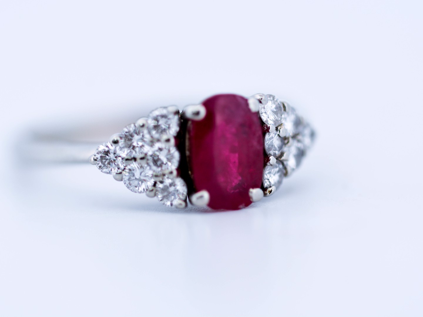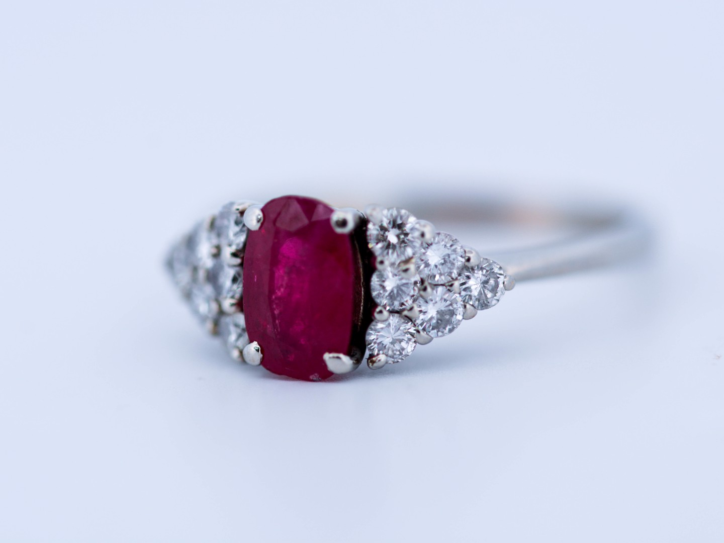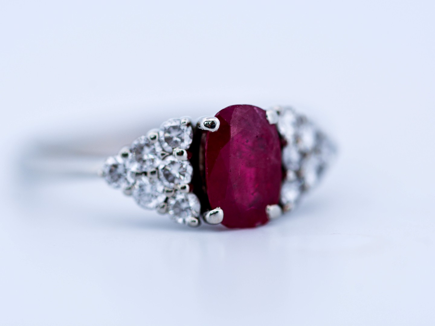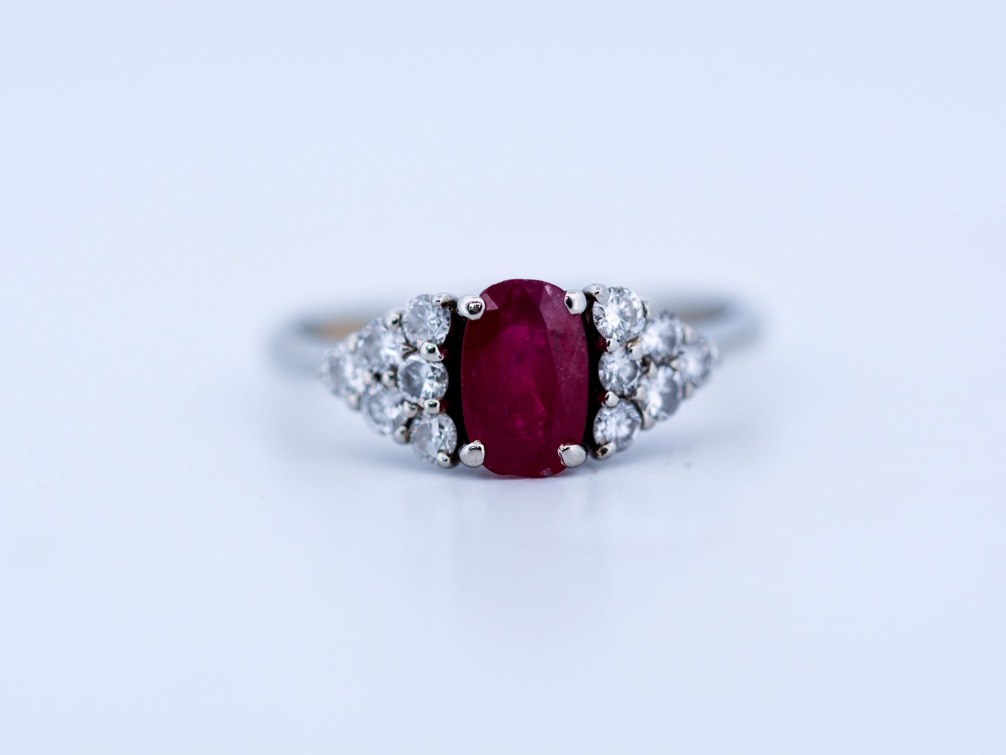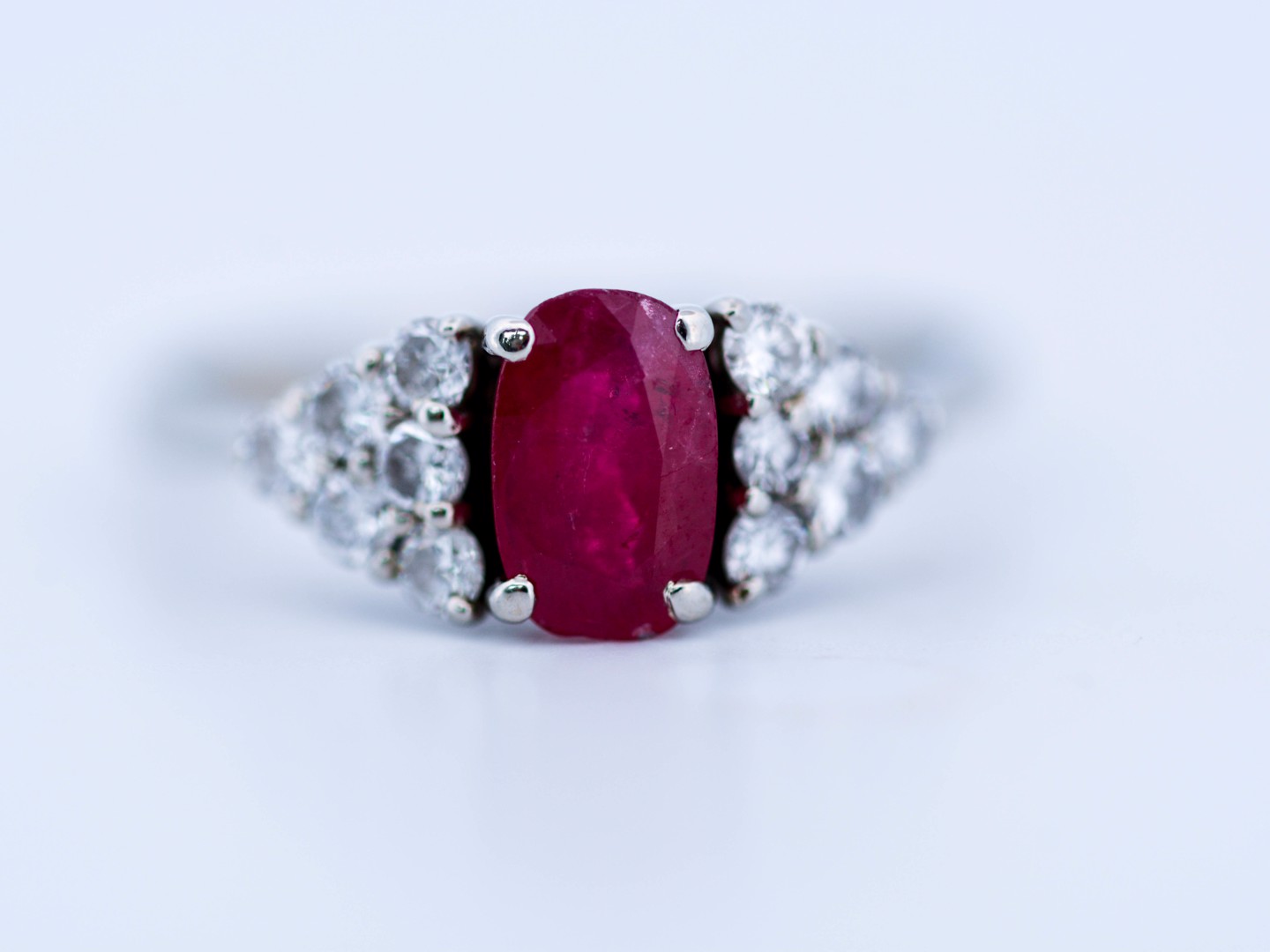 Une bague raffinée en or blanc 18 ct, ornée en son centre d’un rubis d’env. 1,00 ct. La pierre est entourée de 12 diamants taille brillant totalisant env. 0,60 ct (couleur I, pureté VS). Taille : 54–56. Une création élégante où les teintes rouges flamboyantes du rubis contrastent magnifiquement avec l’éclat du diamant.