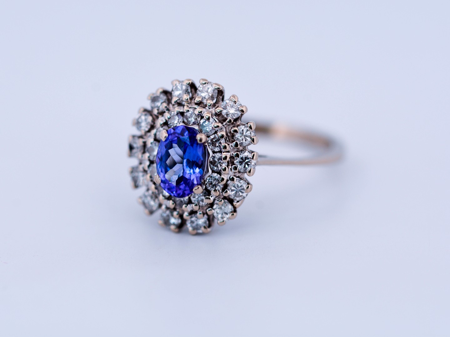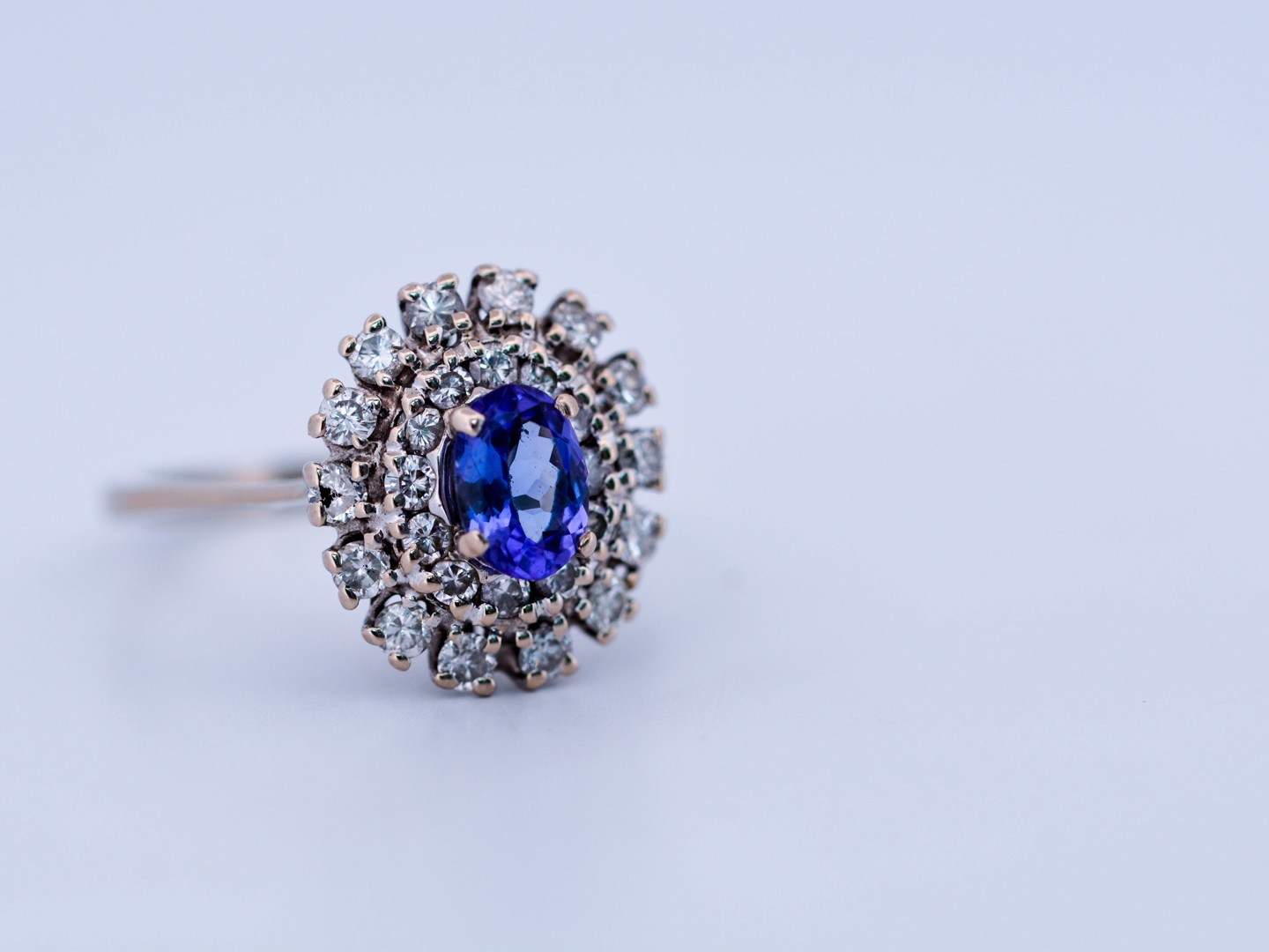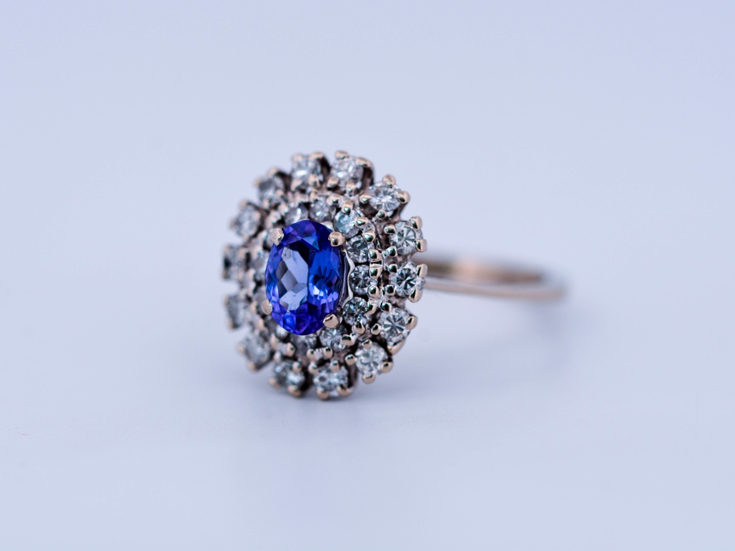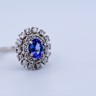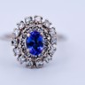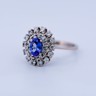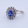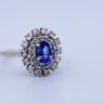 Une bague raffinée en or blanc 18 ct, ornée en son centre d’un saphir de Ceylan ovale d’env. 1,00 ct. La pierre est entourée de 26 diamants taille brillant totalisant env. 1,20 ct (couleur I, pureté VS). Taille : 55–57. Dimensions de la tête : env. 15 × 13 mm. Une création élégante où la beauté rare du saphir de Ceylan est magnifiquement sublimée par l’éclat du diamant.