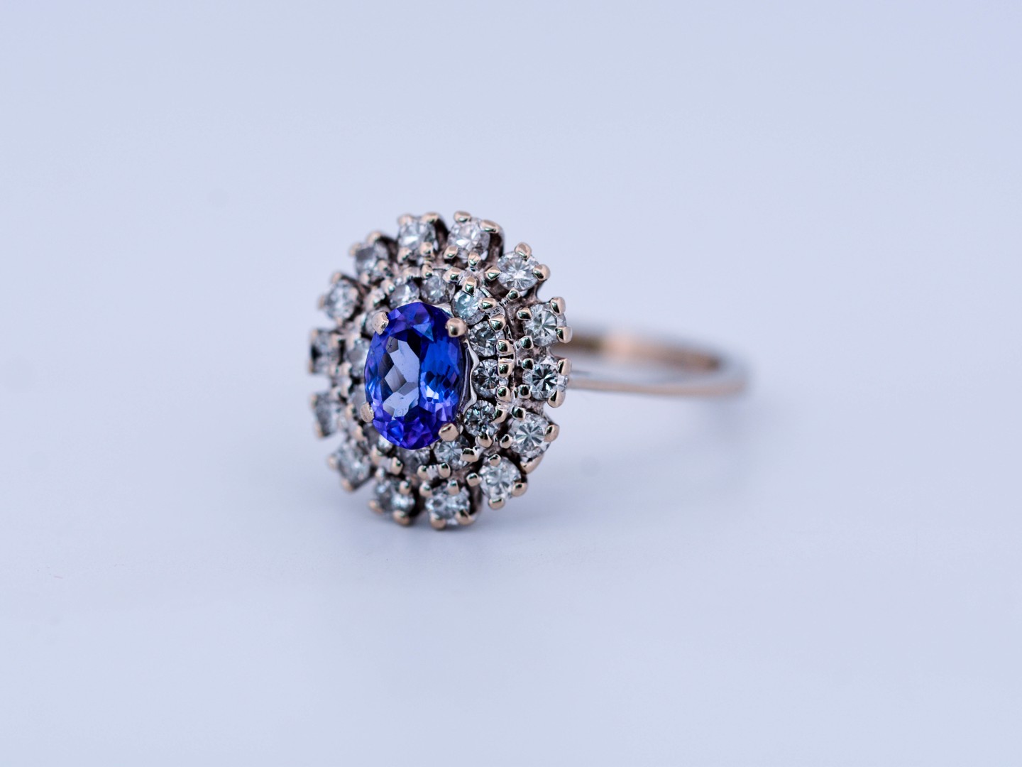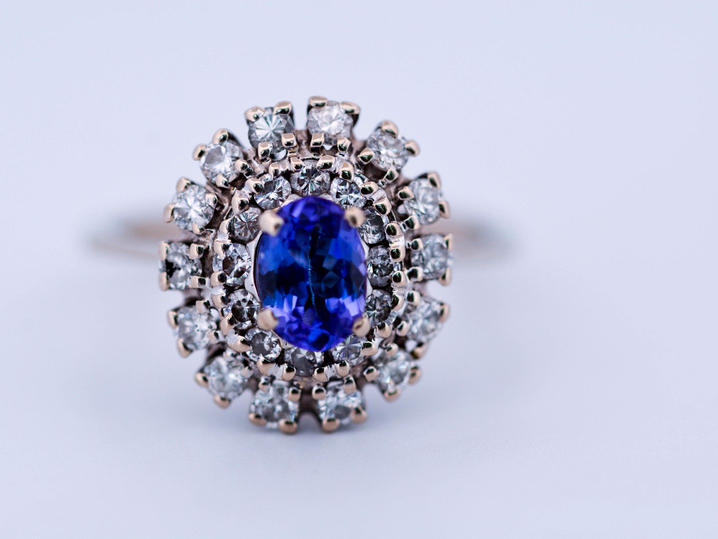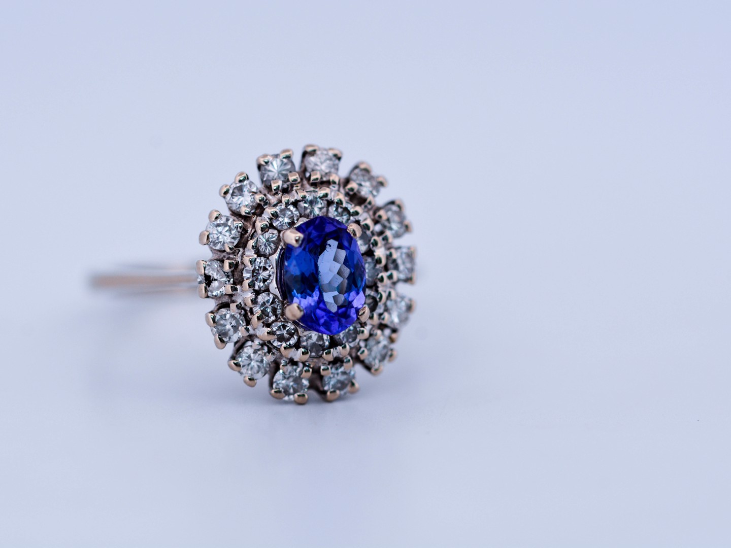 Une bague raffinée en or blanc 18 ct, ornée en son centre d’un saphir de Ceylan ovale d’env. 1,00 ct. La pierre est entourée de 26 diamants taille brillant totalisant env. 1,20 ct (couleur I, pureté VS). Taille : 55–57. Dimensions de la tête : env. 15 × 13 mm. Une création élégante où la beauté rare du saphir de Ceylan est magnifiquement sublimée par l’éclat du diamant.