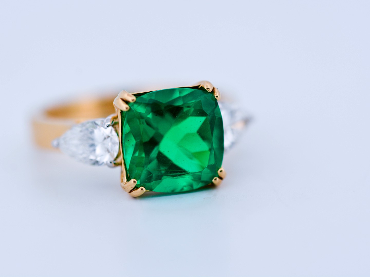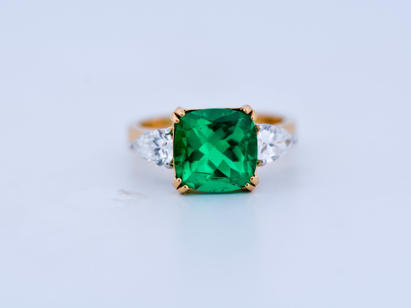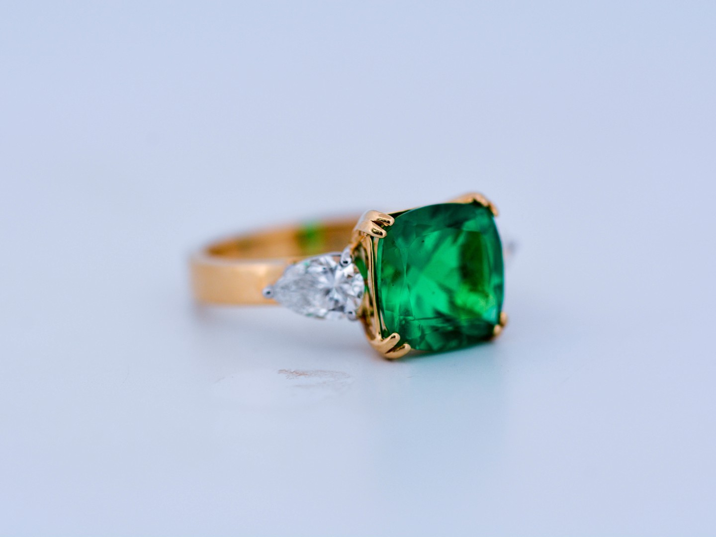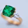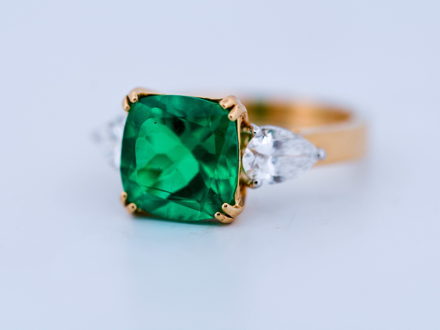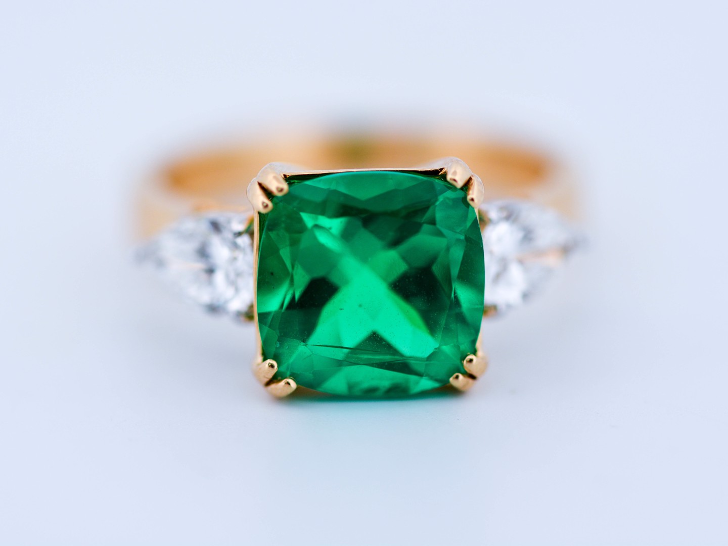 Une bague raffinée en or blanc 18 ct, ornée en son centre d’une émeraude taille princesse d’env. 5,00 ct. La gemme est entourée de 14 diamants taille brillant totalisant env. 1,00 ct (couleur I, pureté VS). Taille : 54–56. Longueur de la tête : env. 15 mm. Un bijou à l’allure royale où le vert intense de l’émeraude se marie magnifiquement à l’éclat du diamant.