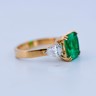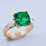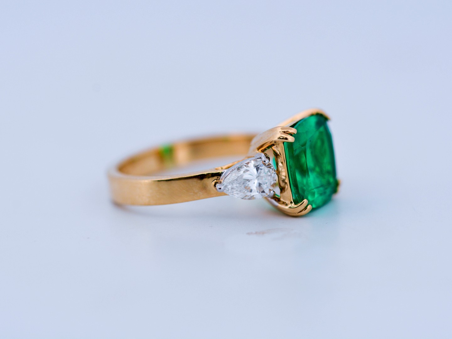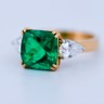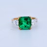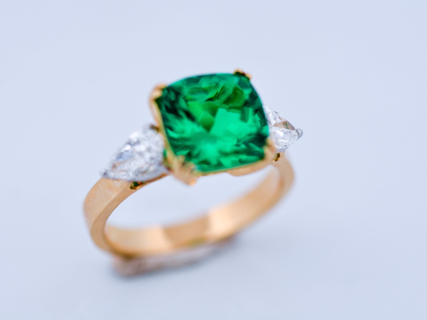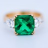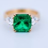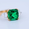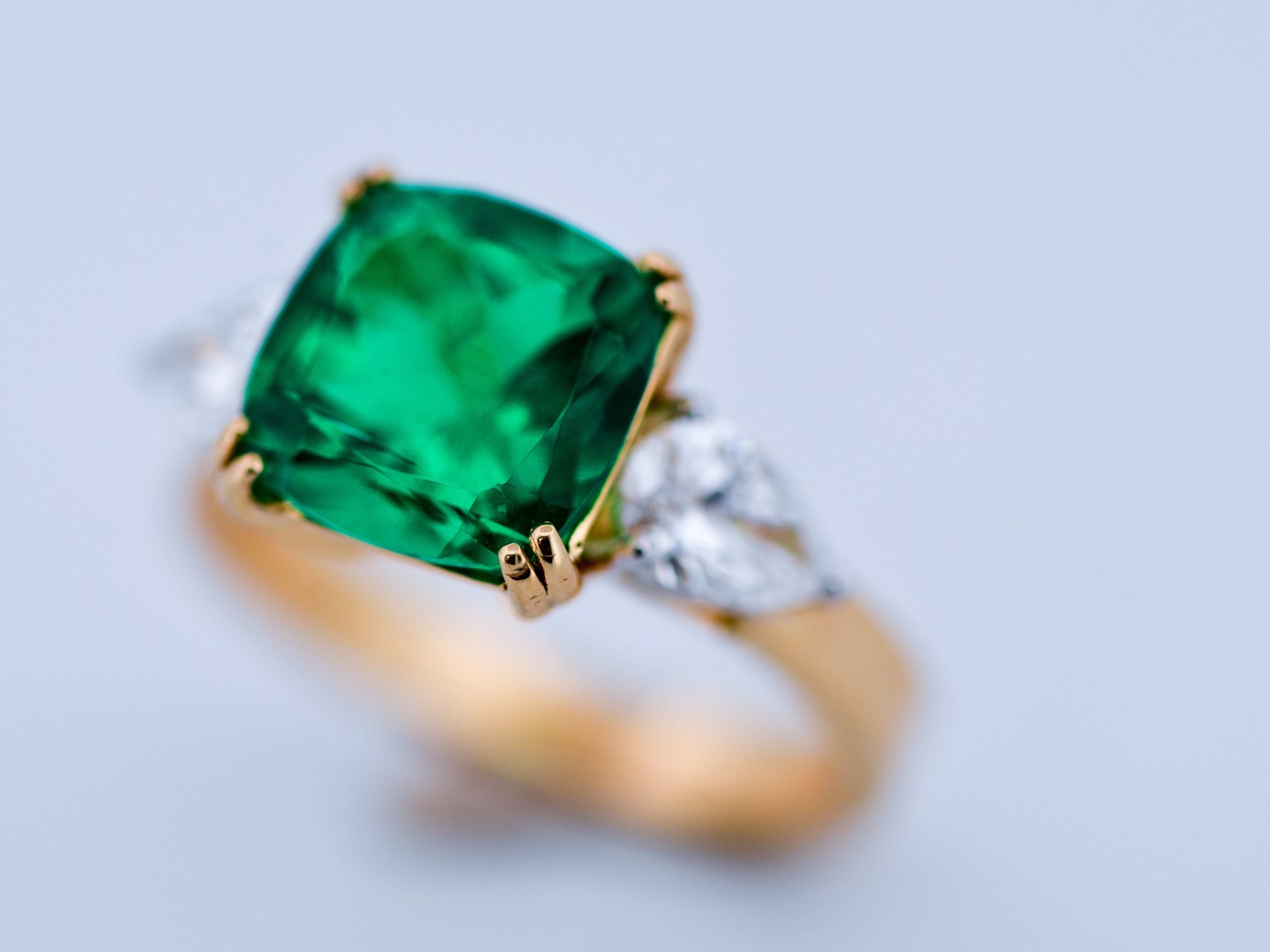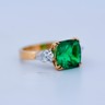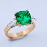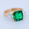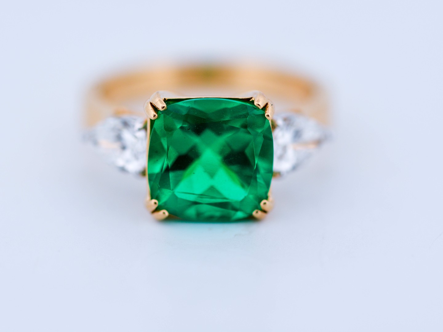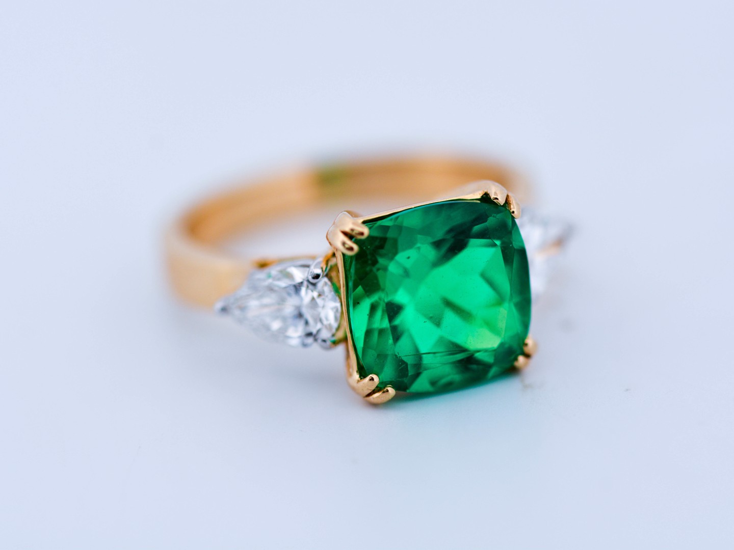 Une bague raffinée en or blanc 18 ct, ornée en son centre d’une émeraude taille princesse d’env. 5,00 ct. La gemme est entourée de 14 diamants taille brillant totalisant env. 1,00 ct (couleur I, pureté VS). Taille : 54–56. Longueur de la tête : env. 15 mm. Un bijou à l’allure royale où le vert intense de l’émeraude se marie magnifiquement à l’éclat du diamant.