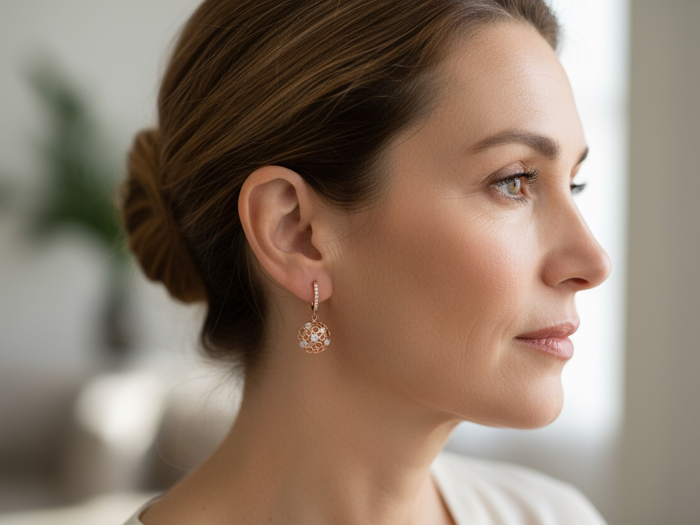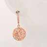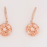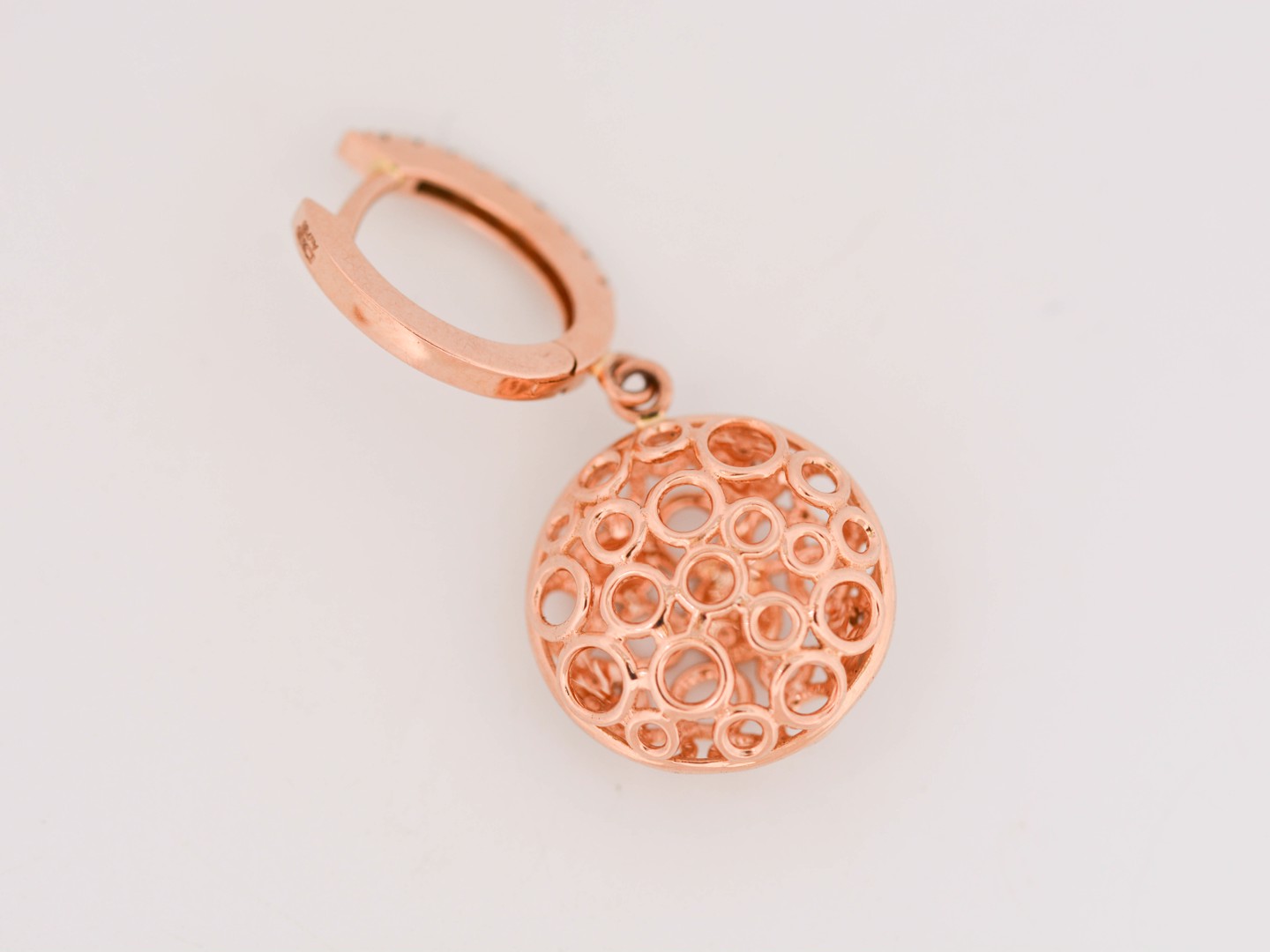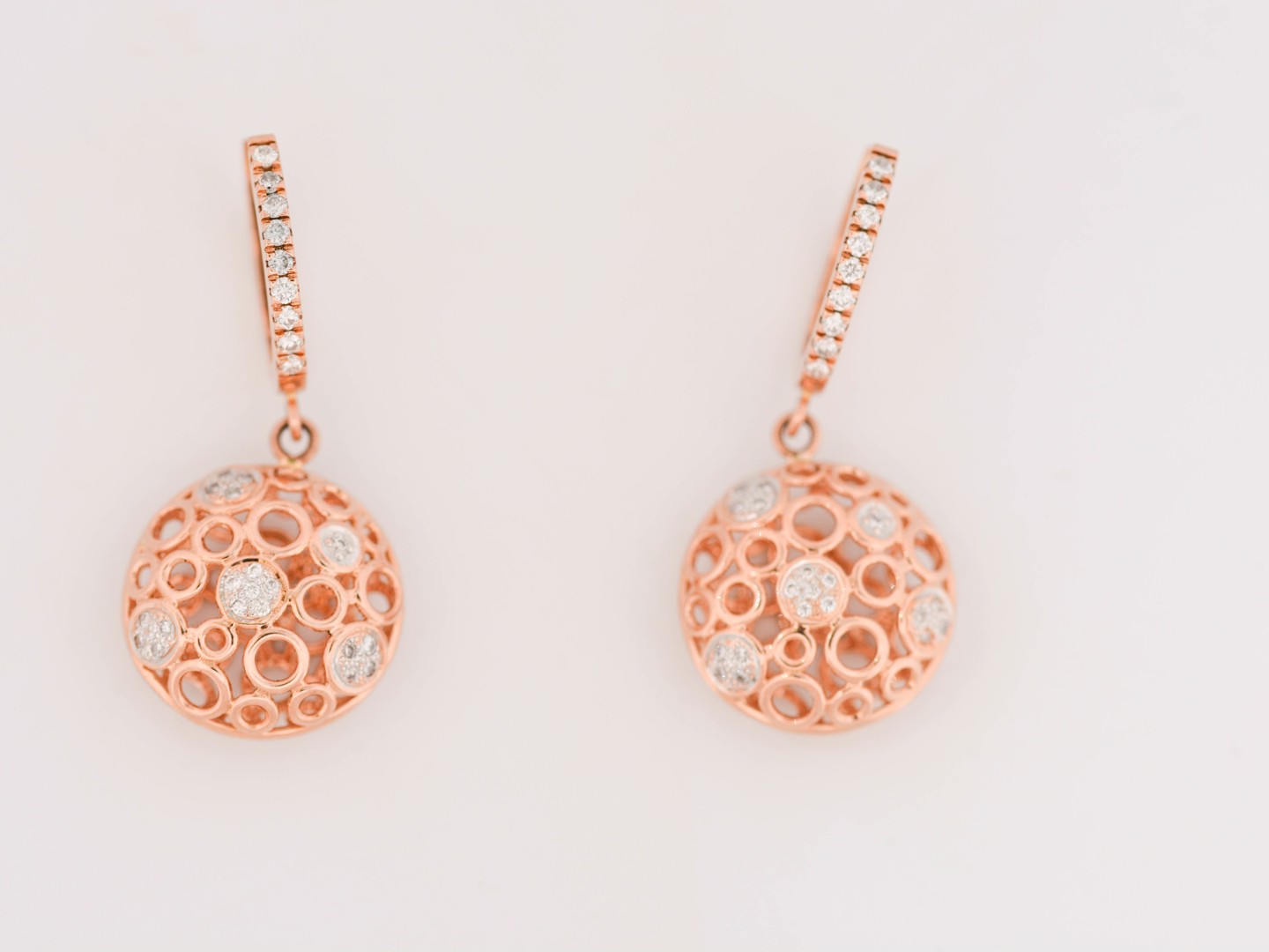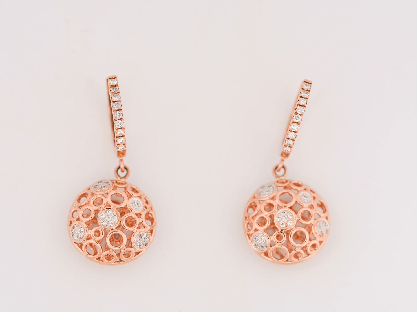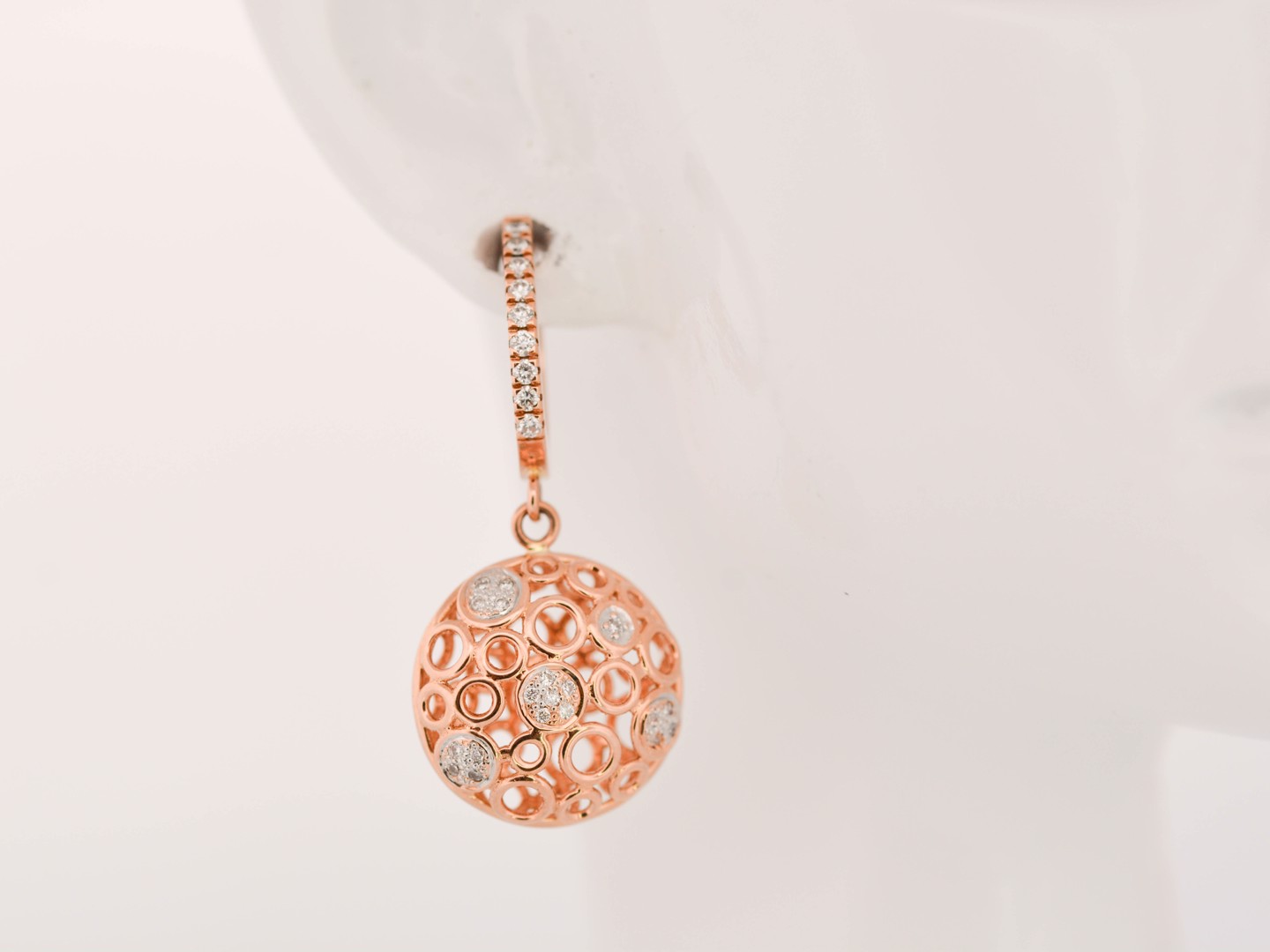 Une paire de boucles d’oreilles élégants en or rose 18 ct (poinçon 750), sertis de 56 diamants taille brillant totalisant env. 0,50 ct (couleur G–H, pureté VS). Longueur : env. 28 mm, diamètre env. 15 mm. Une création gracieuse qui allie éclat subtil et élégance moderne.