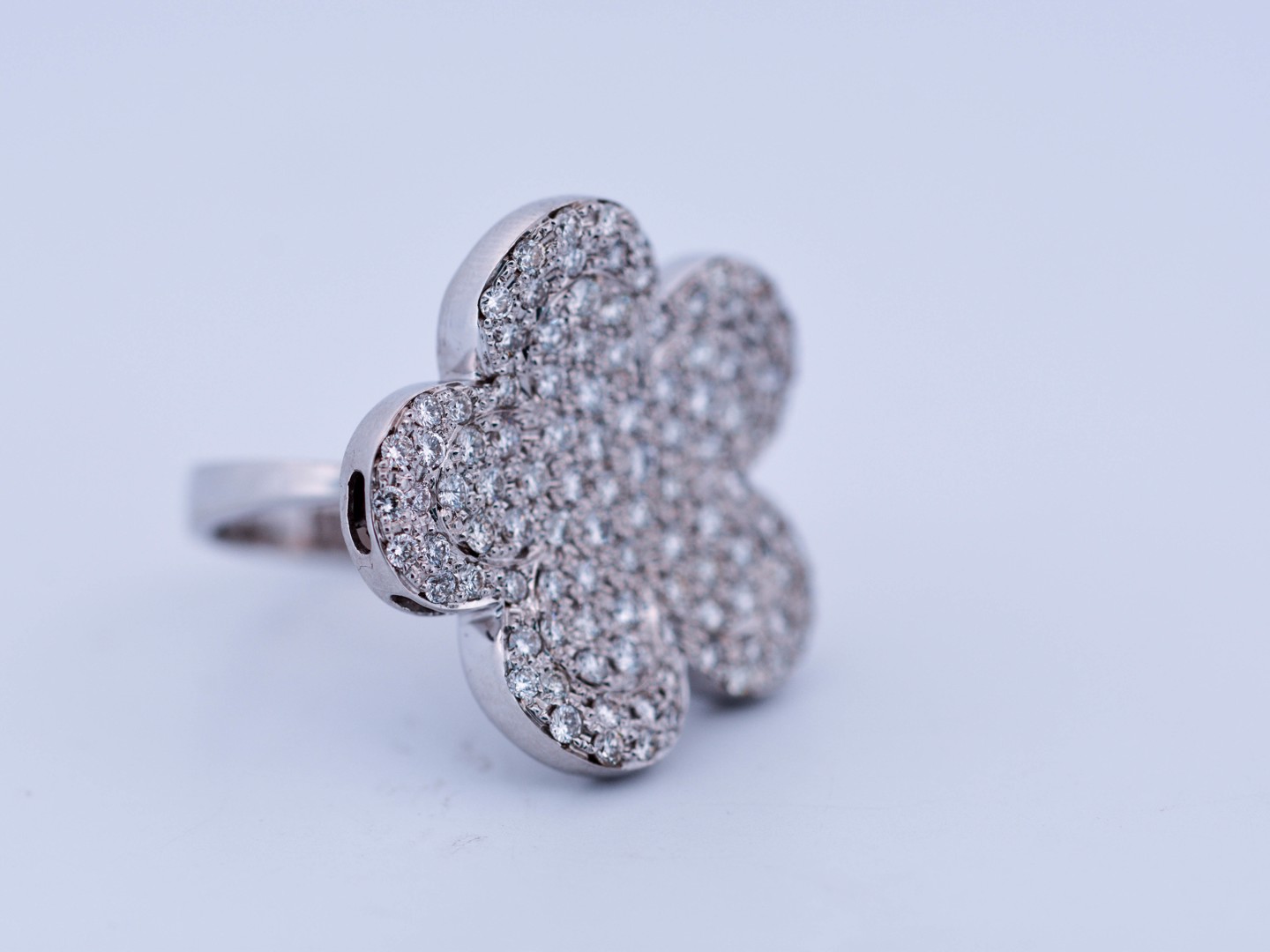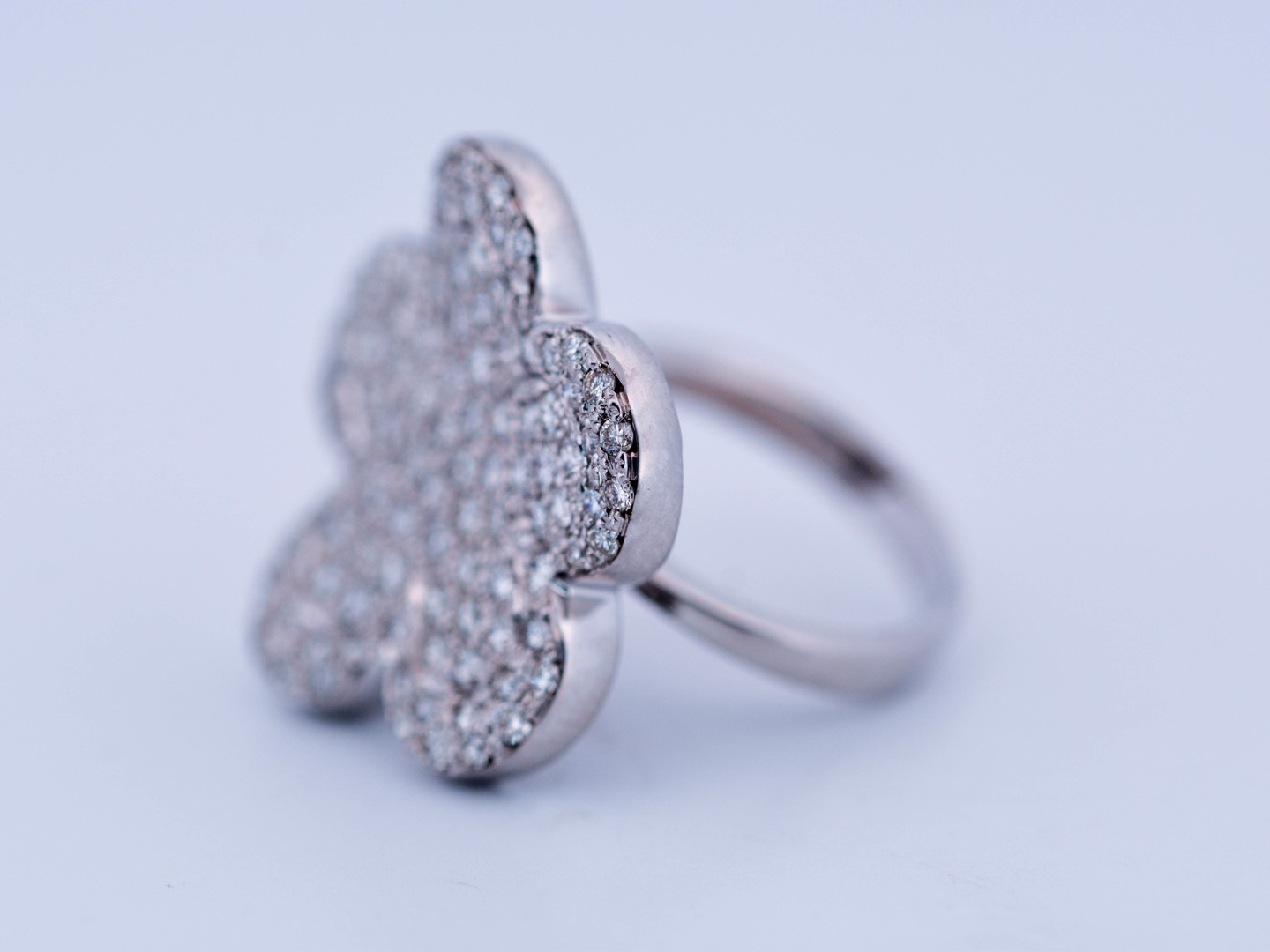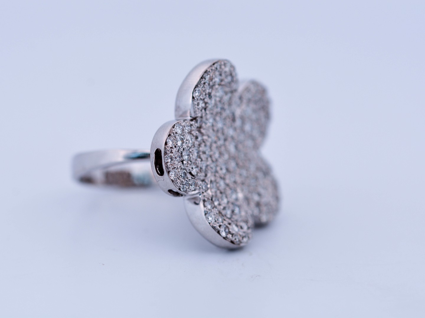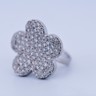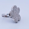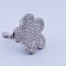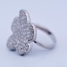 Une bague exclusive inspirée du modèle emblématique de Van Cleef & Arpels, réalisée en or blanc 18 ct (poinçon 750). Sertie d’env. 150 diamants blancs taille brillant, total env. 3,00 ct (couleur I, pureté VS). Taille : 52–54. Diamètre : env. 25 mm. Poids : 12,52 g. Une création luxueuse qui allie le style de la haute joaillerie à une qualité de diamants exceptionnelle.