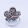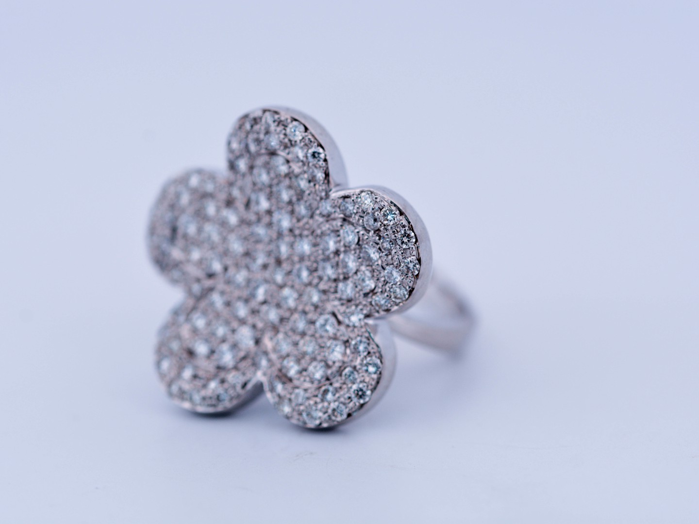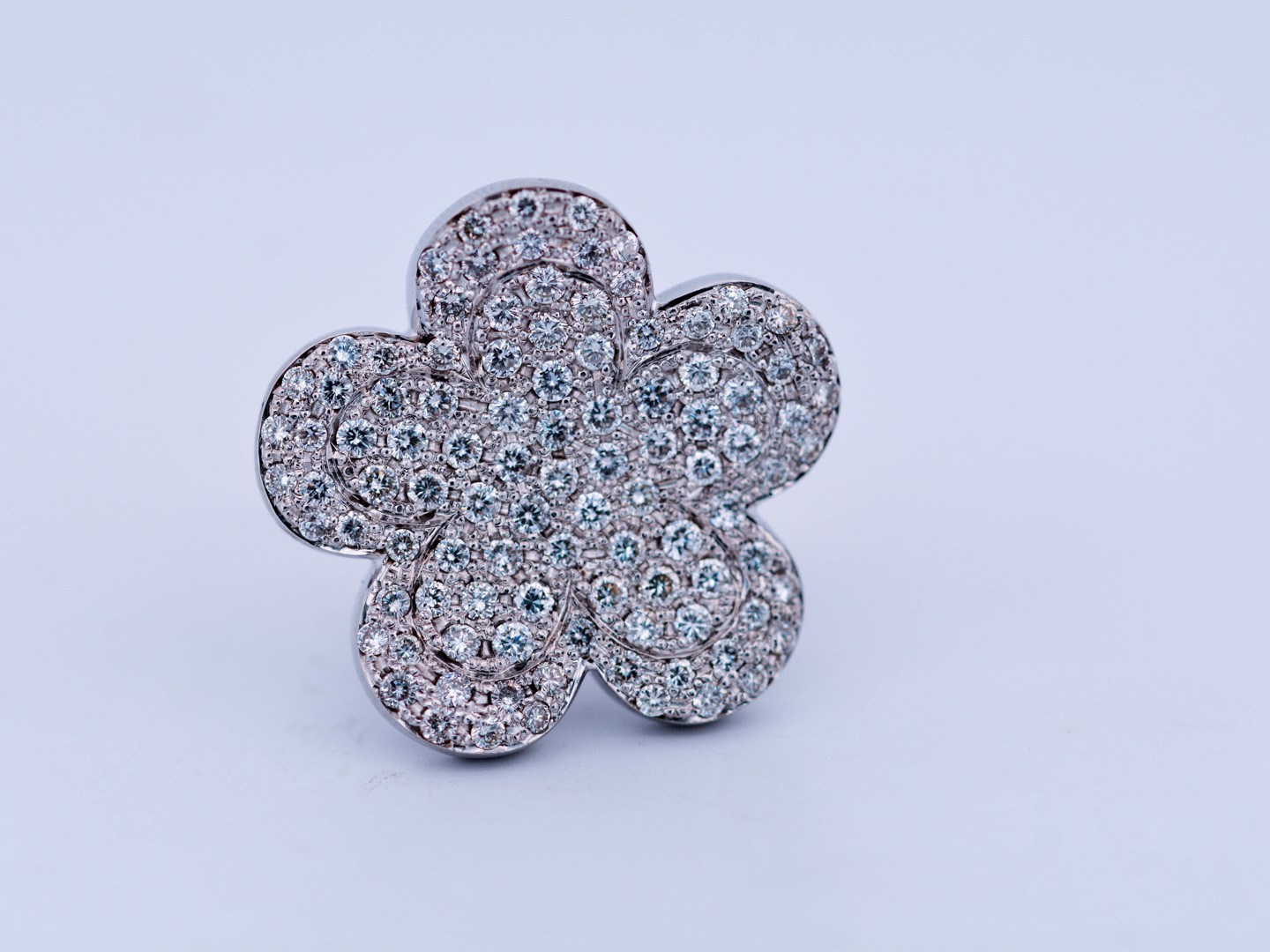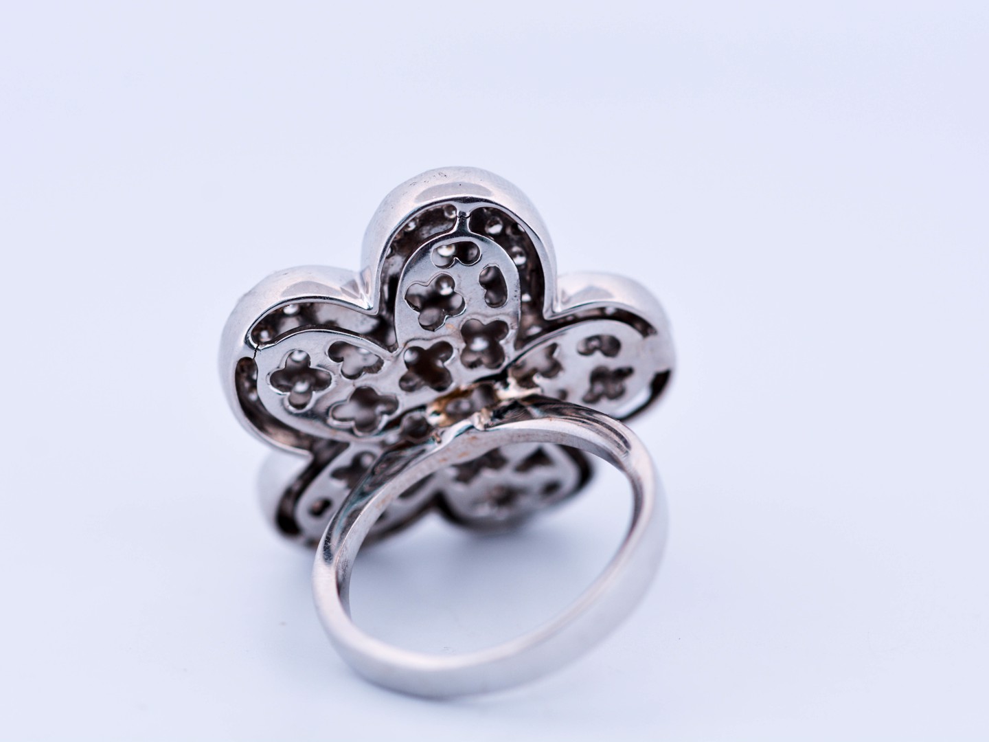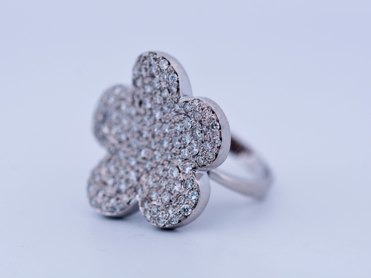 Une bague exclusive inspirée du modèle emblématique de Van Cleef & Arpels, réalisée en or blanc 18 ct (poinçon 750). Sertie d’env. 150 diamants blancs taille brillant, total env. 3,00 ct (couleur I, pureté VS). Taille : 52–54. Diamètre : env. 25 mm. Poids : 12,52 g. Une création luxueuse qui allie le style de la haute joaillerie à une qualité de diamants exceptionnelle.