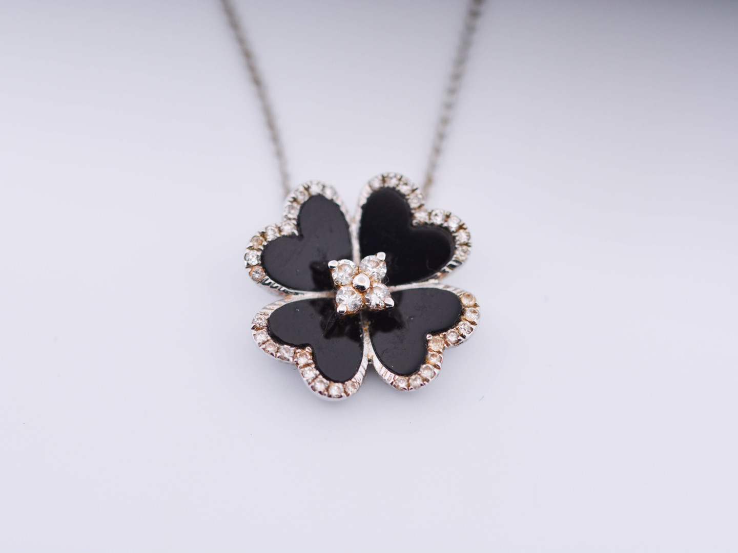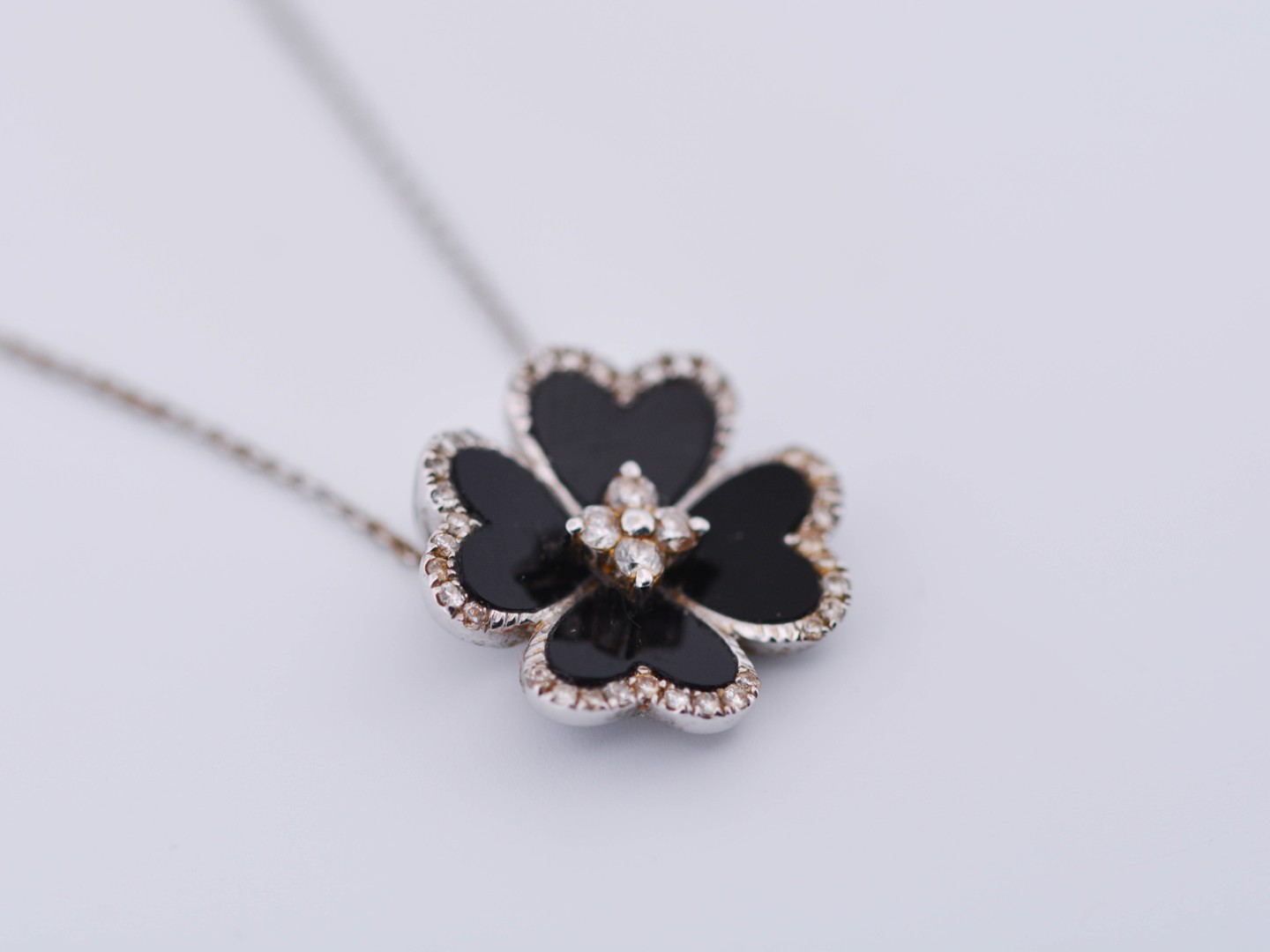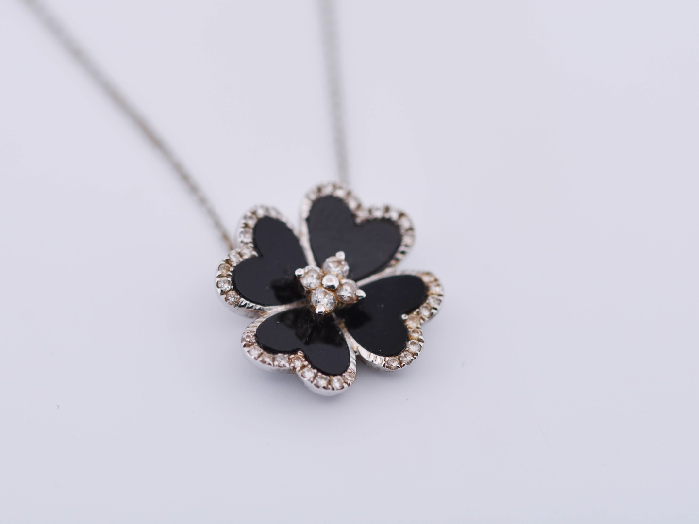 Un collier raffiné orné d’un pendentif serti de quatre onyx noirs en forme de cœur, entourés de 40 diamants taille brillant (0,40 ct au total). Réalisé en or blanc 18 carats, ce bijou allie élégance intemporelle et sophistication délicate. Une pièce précieuse et lumineuse.