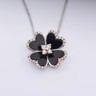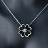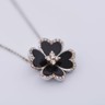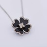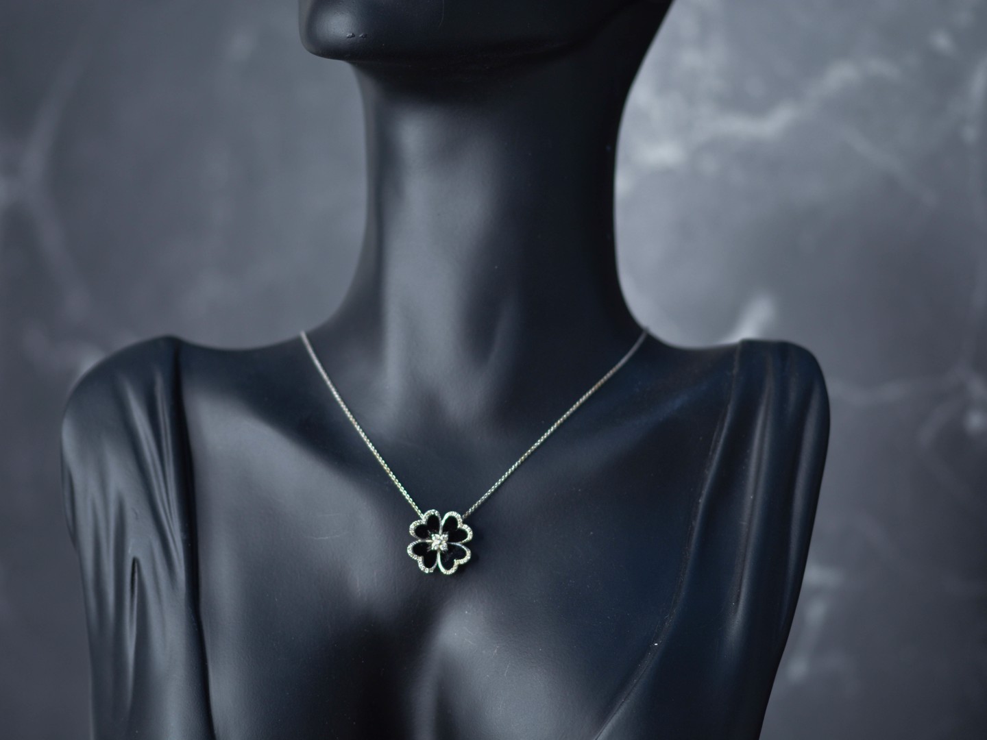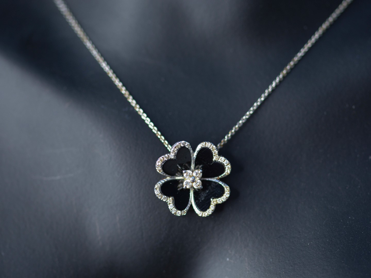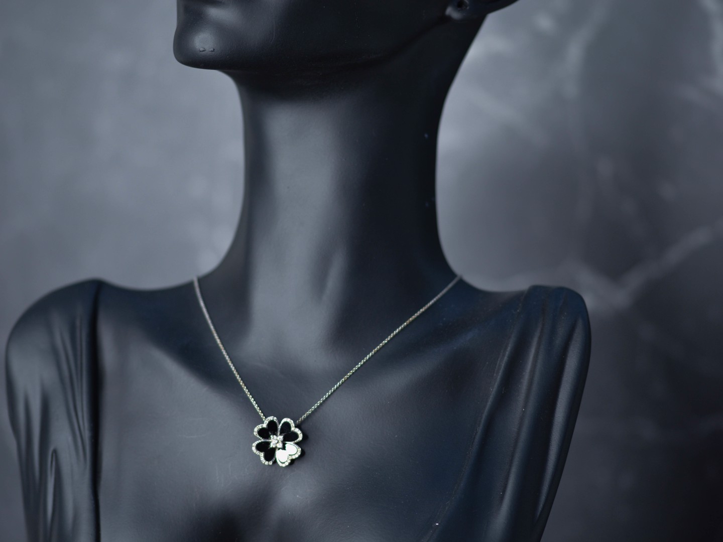 Un collier raffiné orné d’un pendentif serti de quatre onyx noirs en forme de cœur, entourés de 40 diamants taille brillant (0,40 ct au total). Réalisé en or blanc 18 carats, ce bijou allie élégance intemporelle et sophistication délicate. Une pièce précieuse et lumineuse.