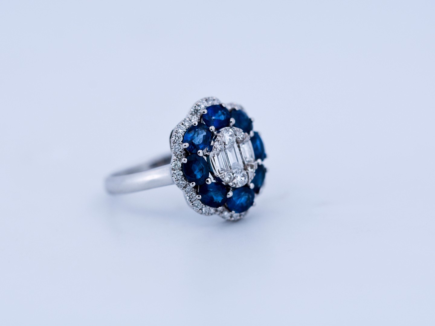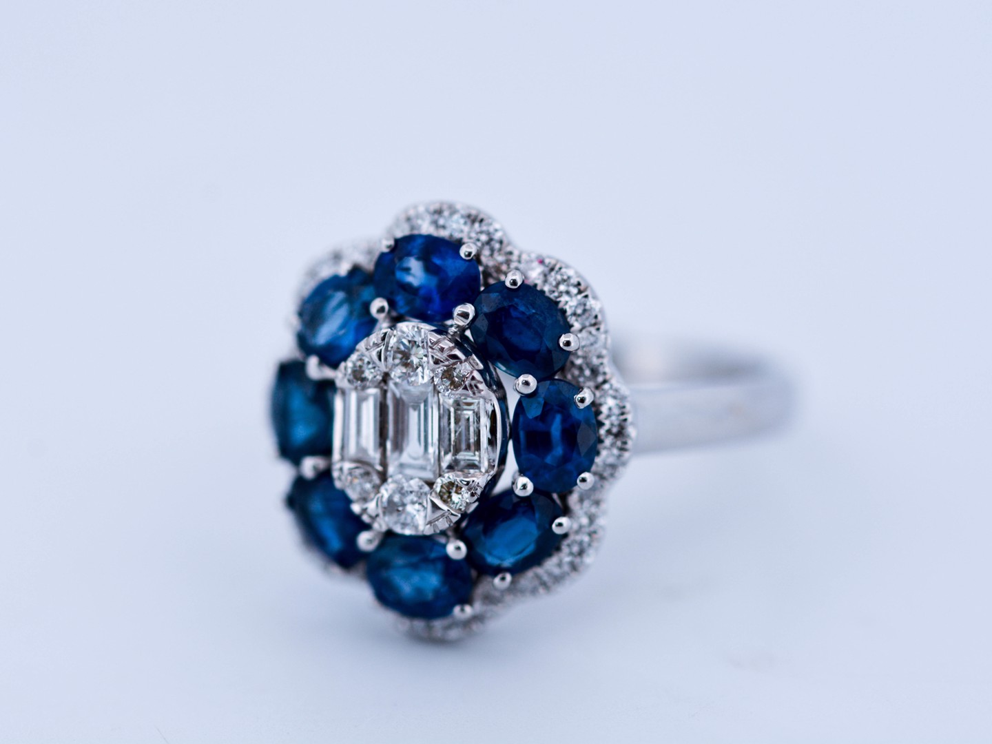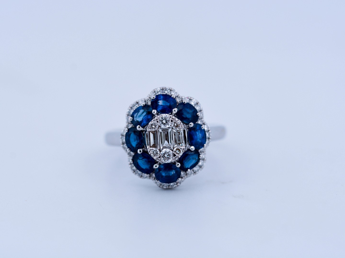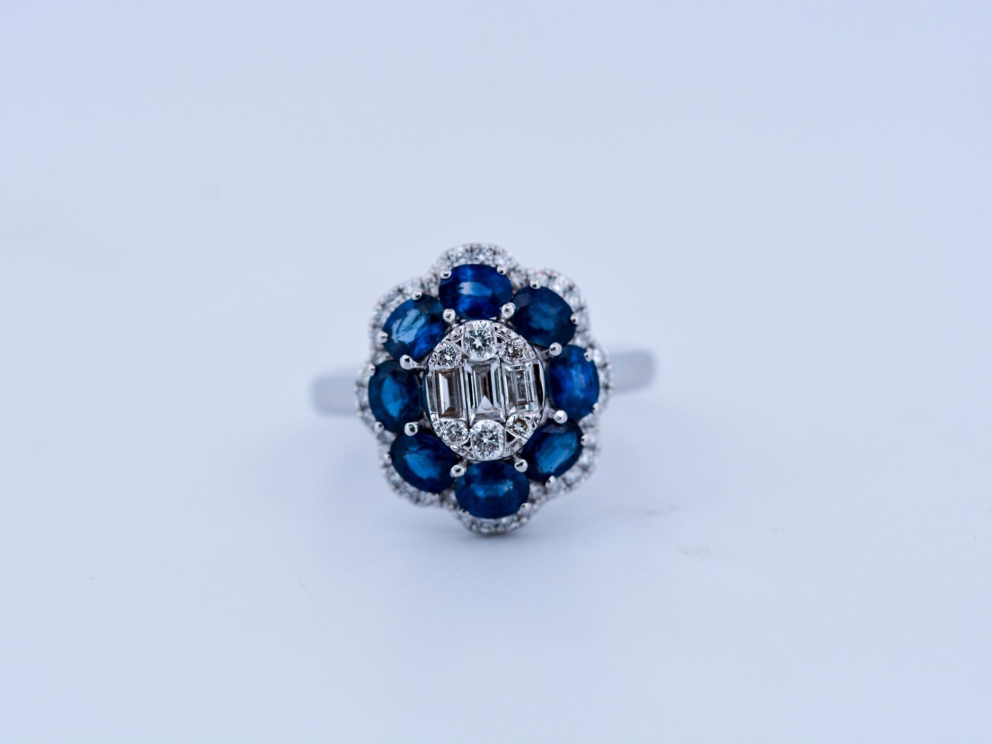 Une bague élégante en or blanc 18 ct (poinçon 750), sertie de 8 saphirs totalisant env. 2,00 ct. Elle est agrémentée de 3 diamants taille baguette et de 46 diamants taille brillant, total env. 0,65 ct (couleur F–G, pureté VS). Taille : 54–56. Dimensions de la tête : env. 17 × 14 mm. Une création luxueuse où le bleu profond des saphirs contraste magnifiquement avec l’éclat lumineux des diamants.