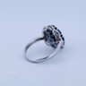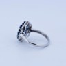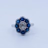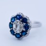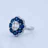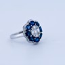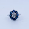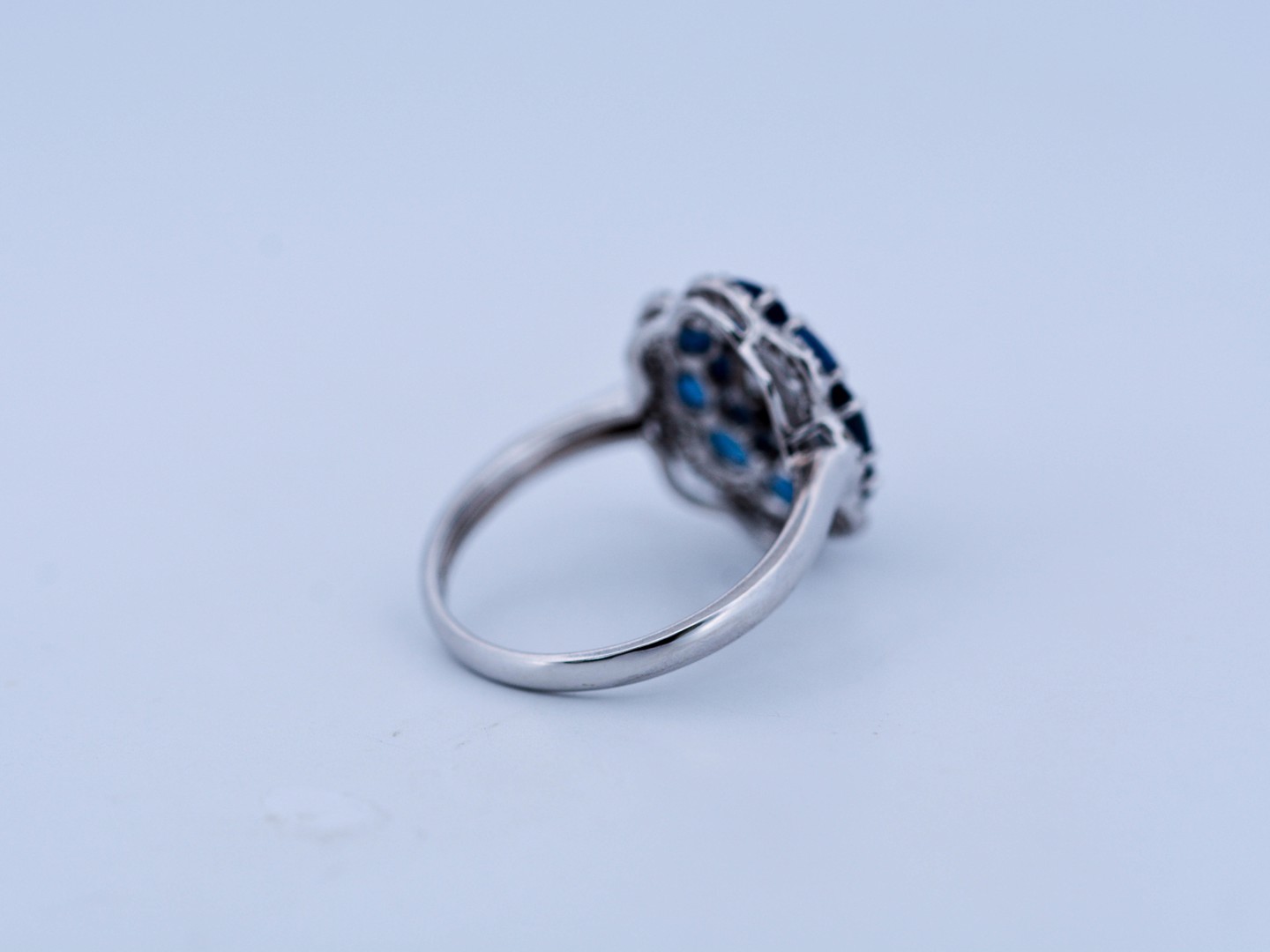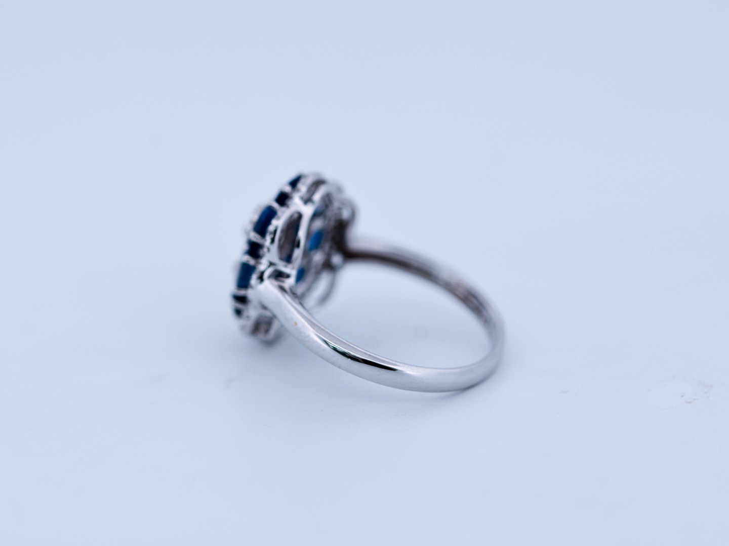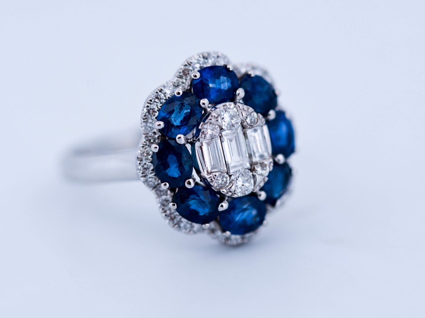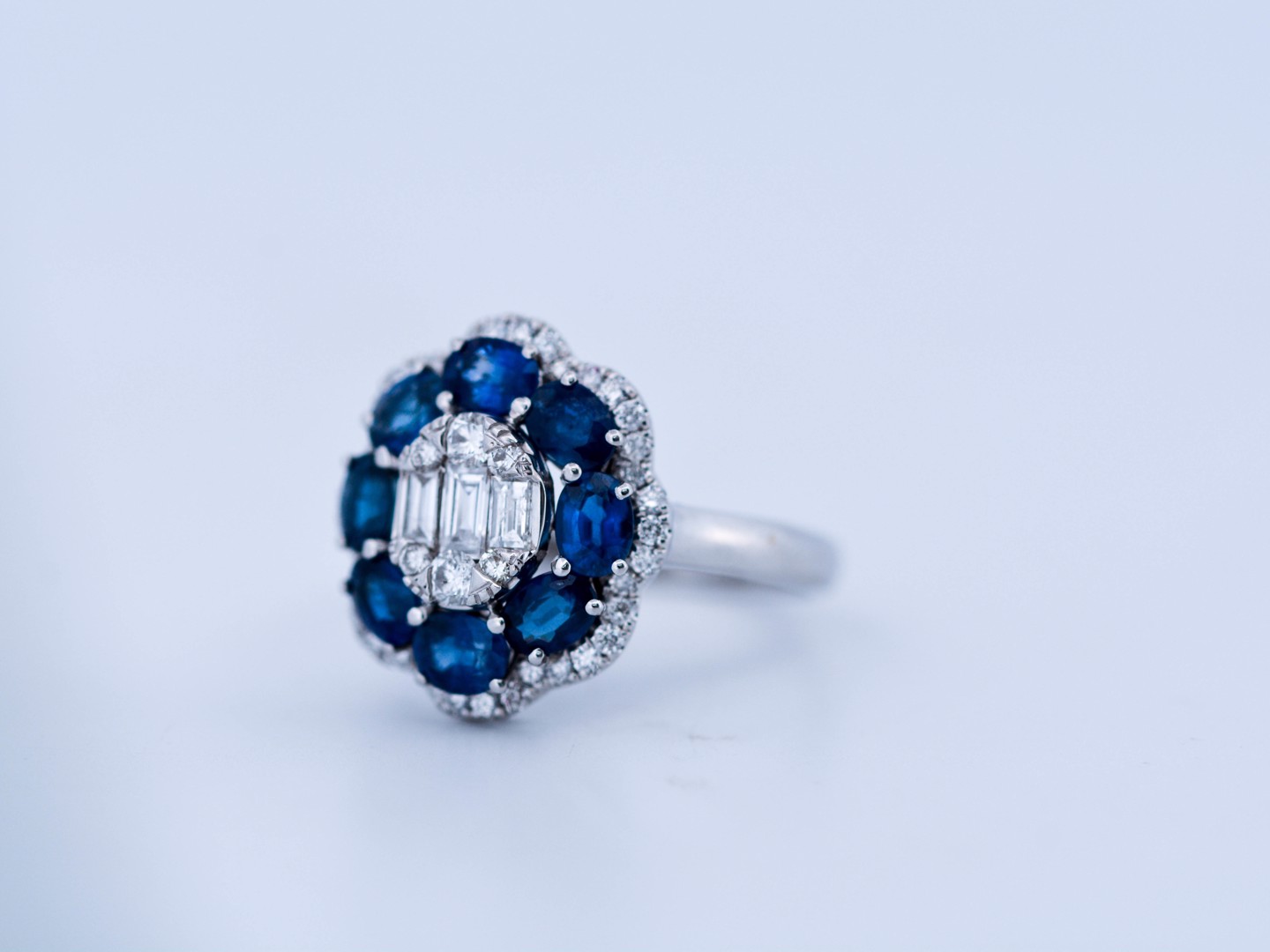 Une bague élégante en or blanc 18 ct (poinçon 750), sertie de 8 saphirs totalisant env. 2,00 ct. Elle est agrémentée de 3 diamants taille baguette et de 46 diamants taille brillant, total env. 0,65 ct (couleur F–G, pureté VS). Taille : 54–56. Dimensions de la tête : env. 17 × 14 mm. Une création luxueuse où le bleu profond des saphirs contraste magnifiquement avec l’éclat lumineux des diamants.