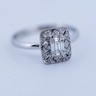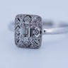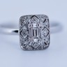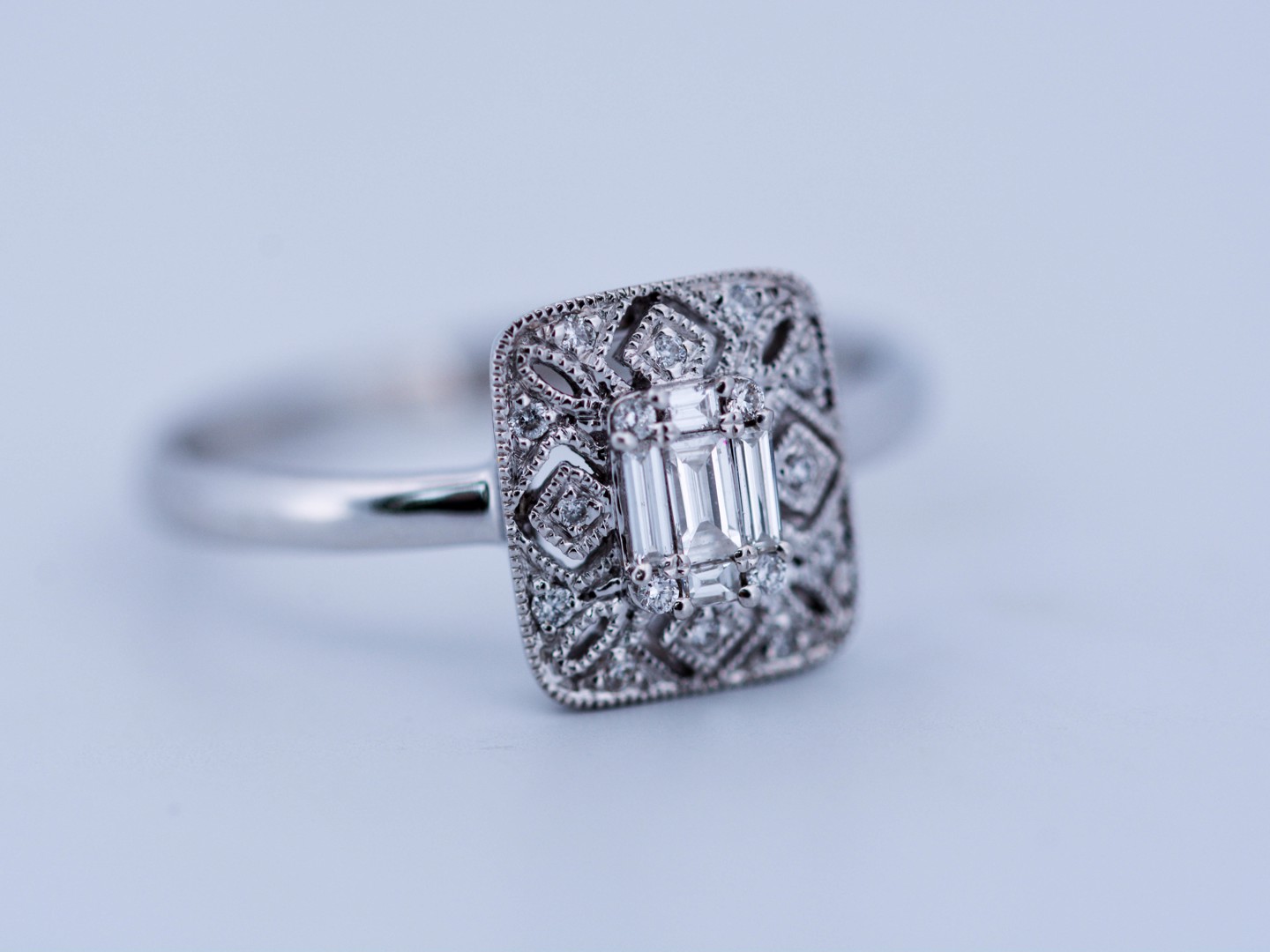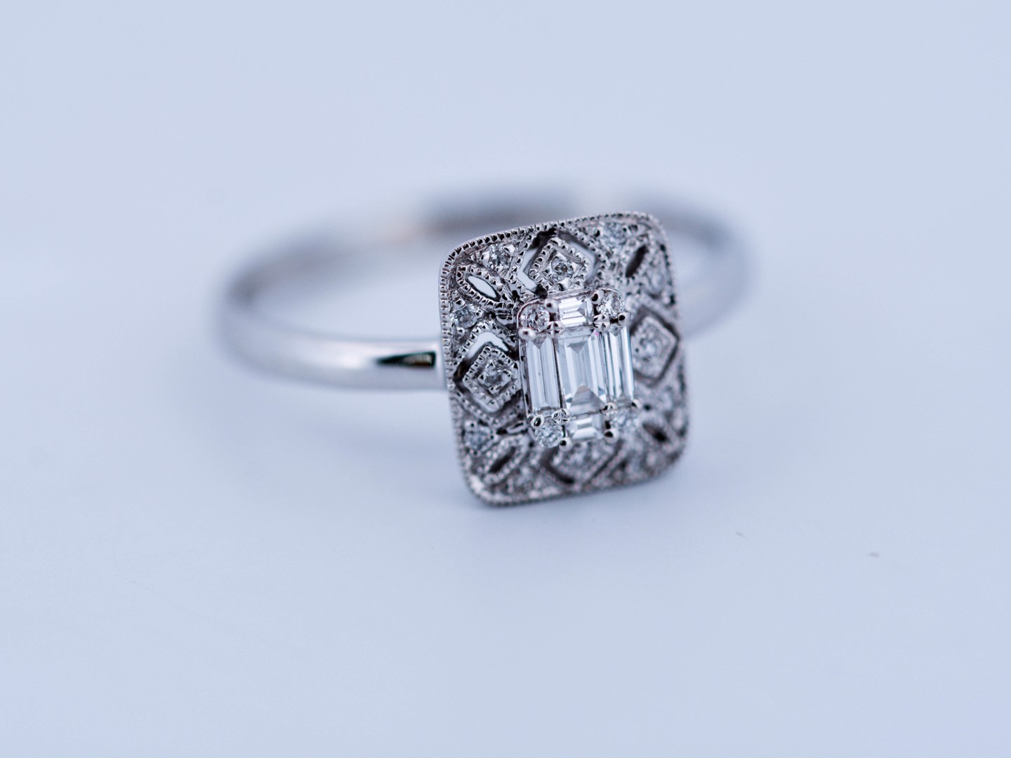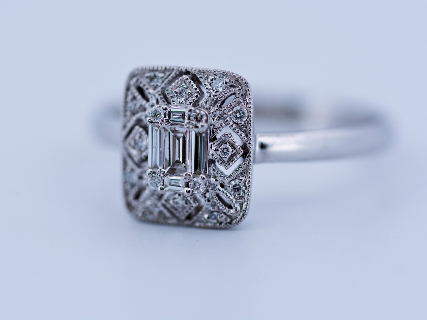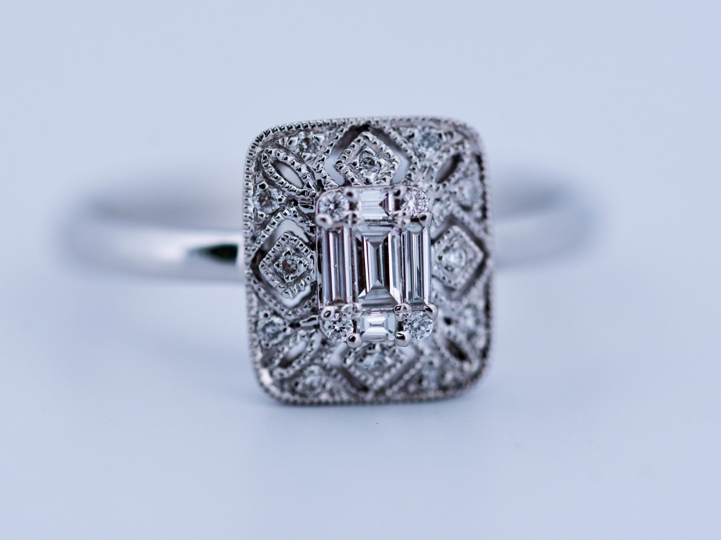 Une élégante bague de style Art Déco, réalisée en or blanc 18 ct (poinçon 750). Sertie de 5 diamants taille baguette et de 16 diamants taille brillant. Taille : 54–56. Une création raffinée où les lignes géométriques de l’Art Déco s’unissent à l’éclat des diamants.