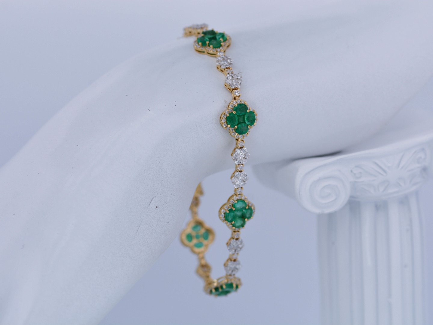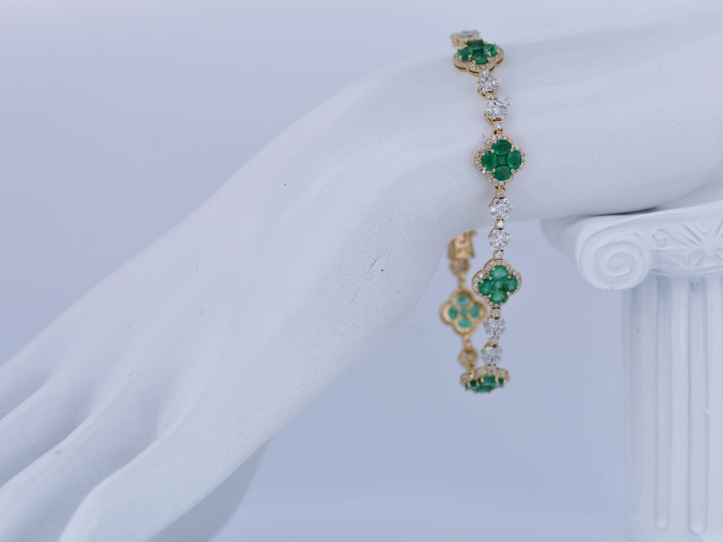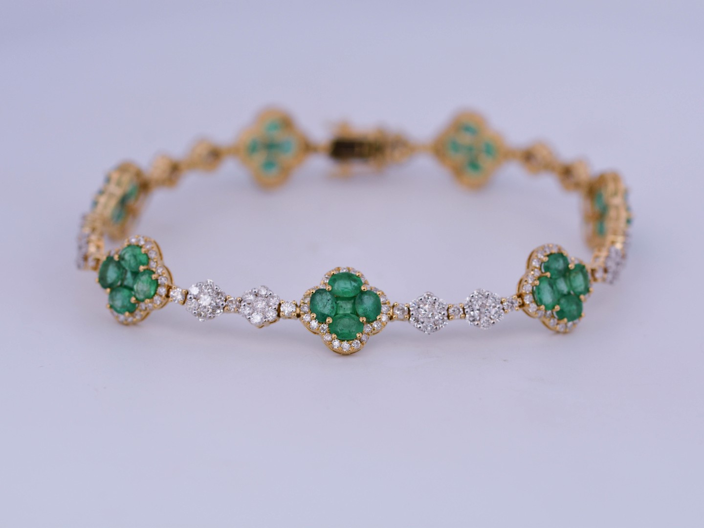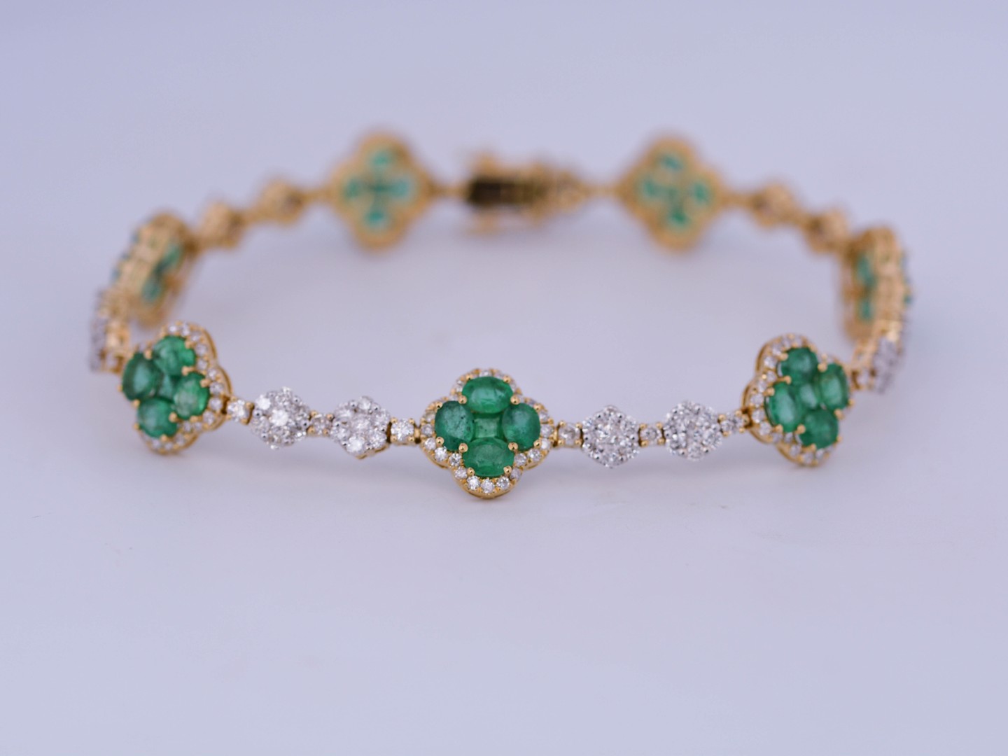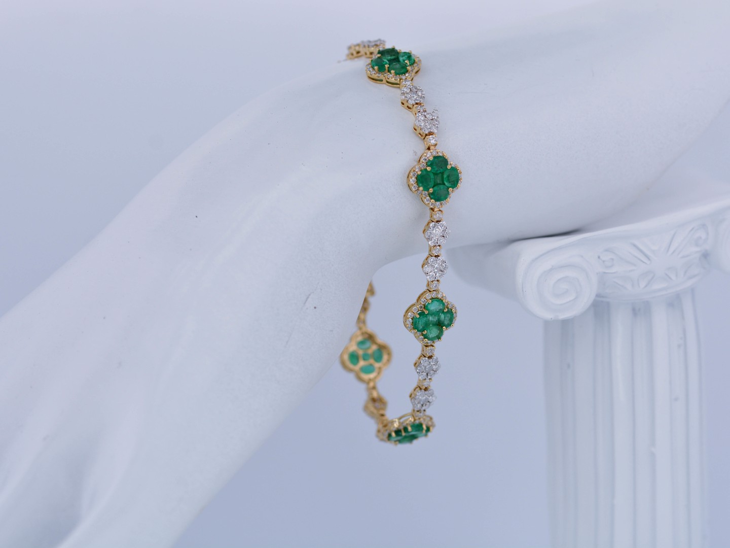 Sublime bracelet orné de 35 émeraudes : +-5.00CT, entouré de +-280 diamants : +-3.60CT (marqué), couleur : G-H et pureté : VS. monté en or jaune 18kt (marqué 750). Longueur : 18,50 cm