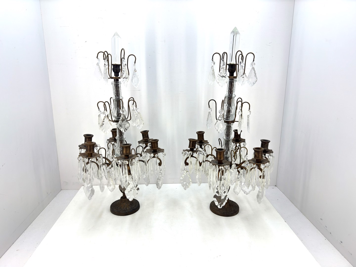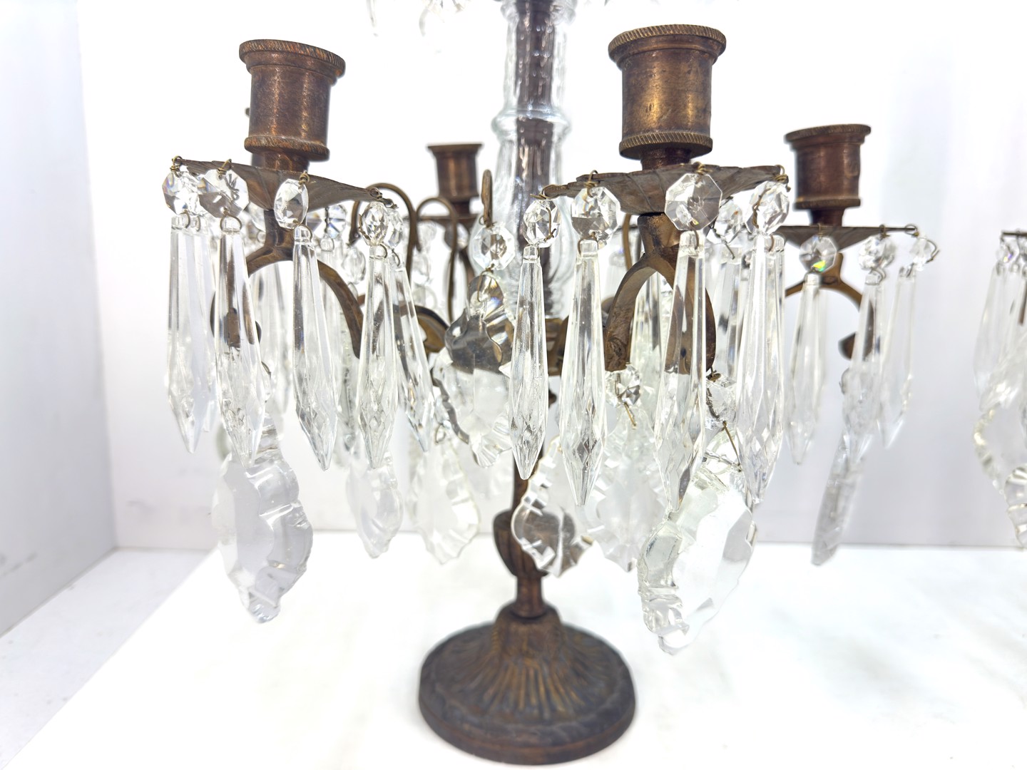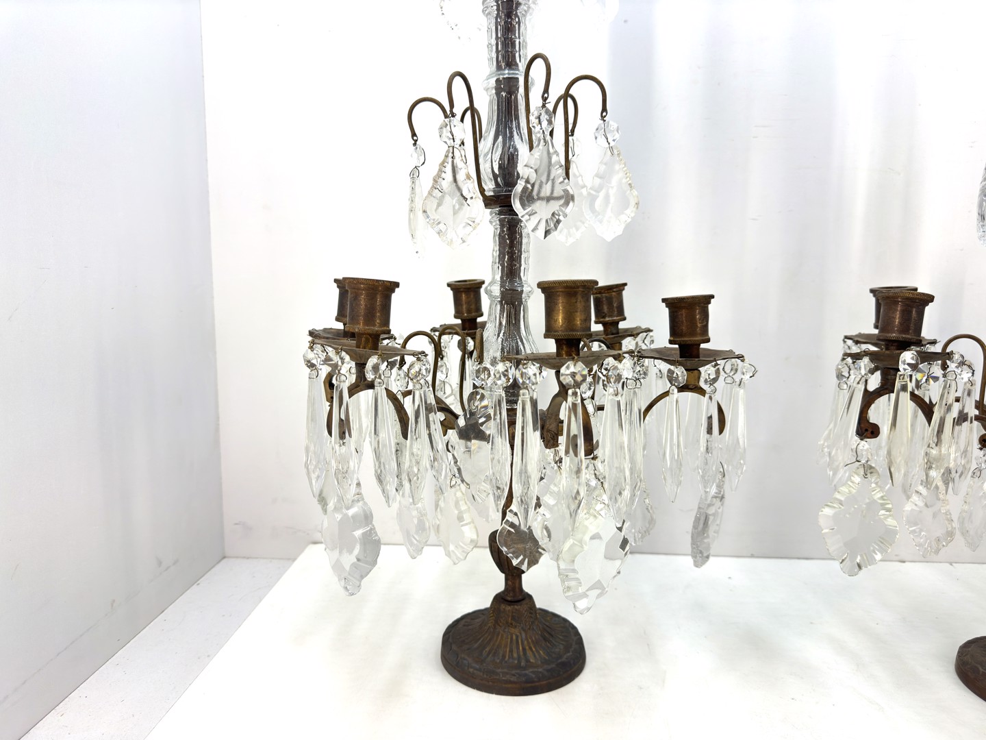 Quelques chandeliers en bronze avec des pendentifs en cristal. Hauteur : 64 cm