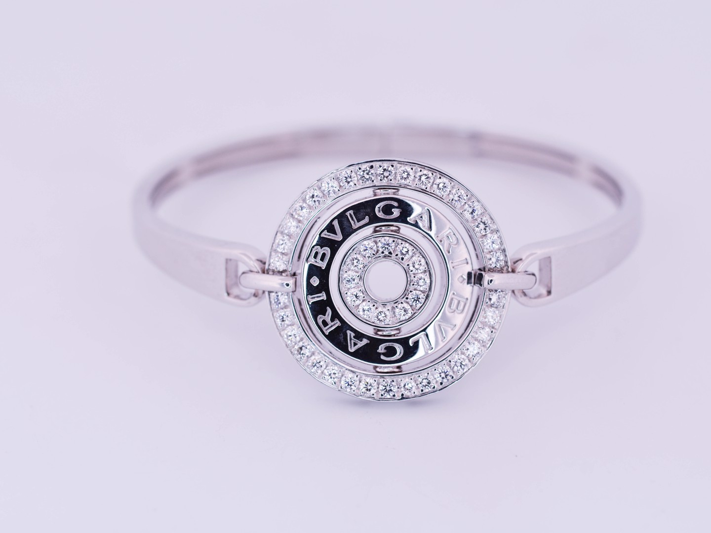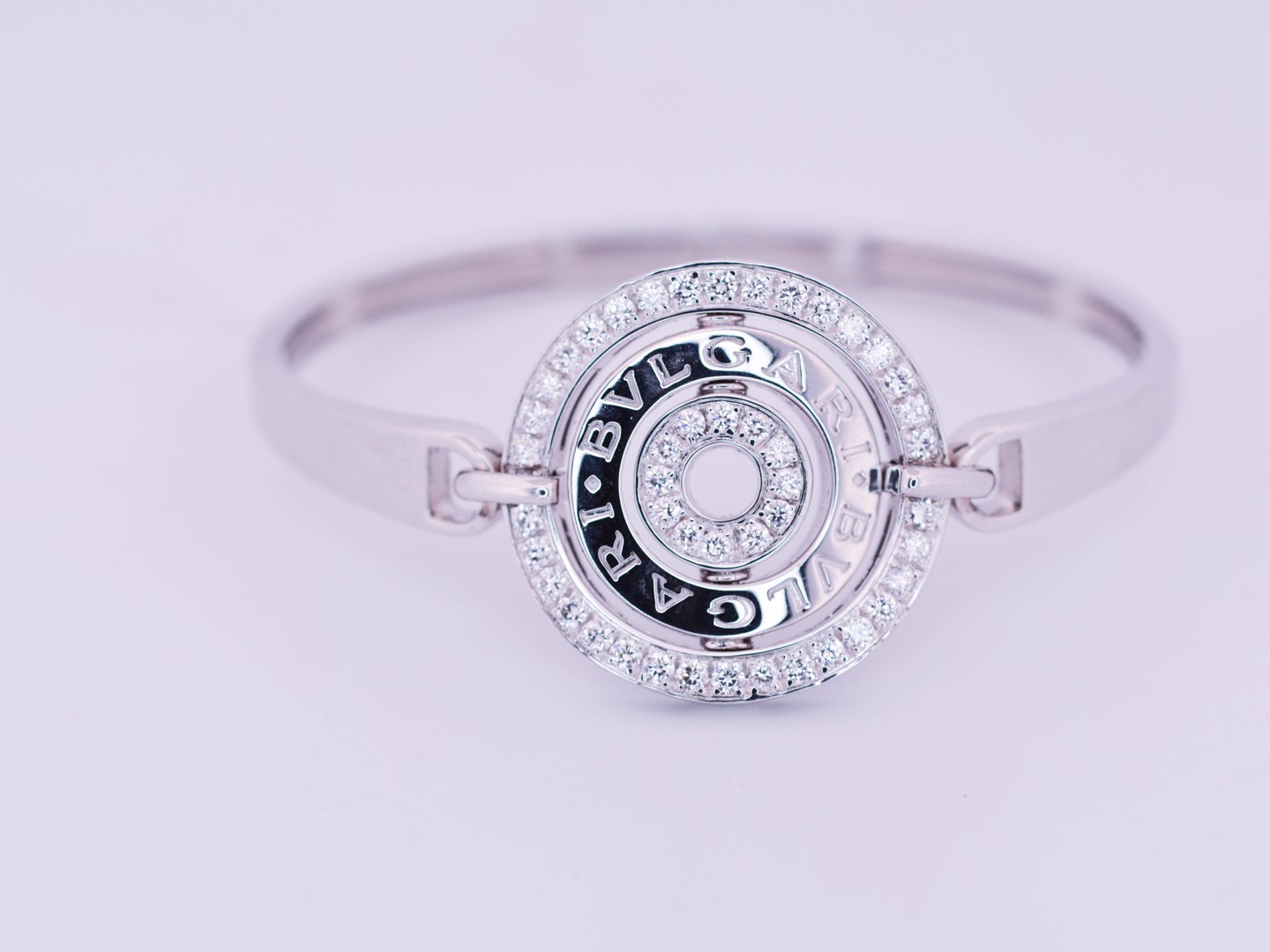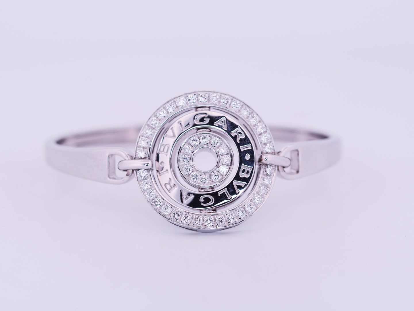 Somptueux bracelet signé Bulgari, réalisé en or blanc 18 carats (poinçon 750), serti de 46 diamants taille brillant pour un poids total d’environ 1 carat.