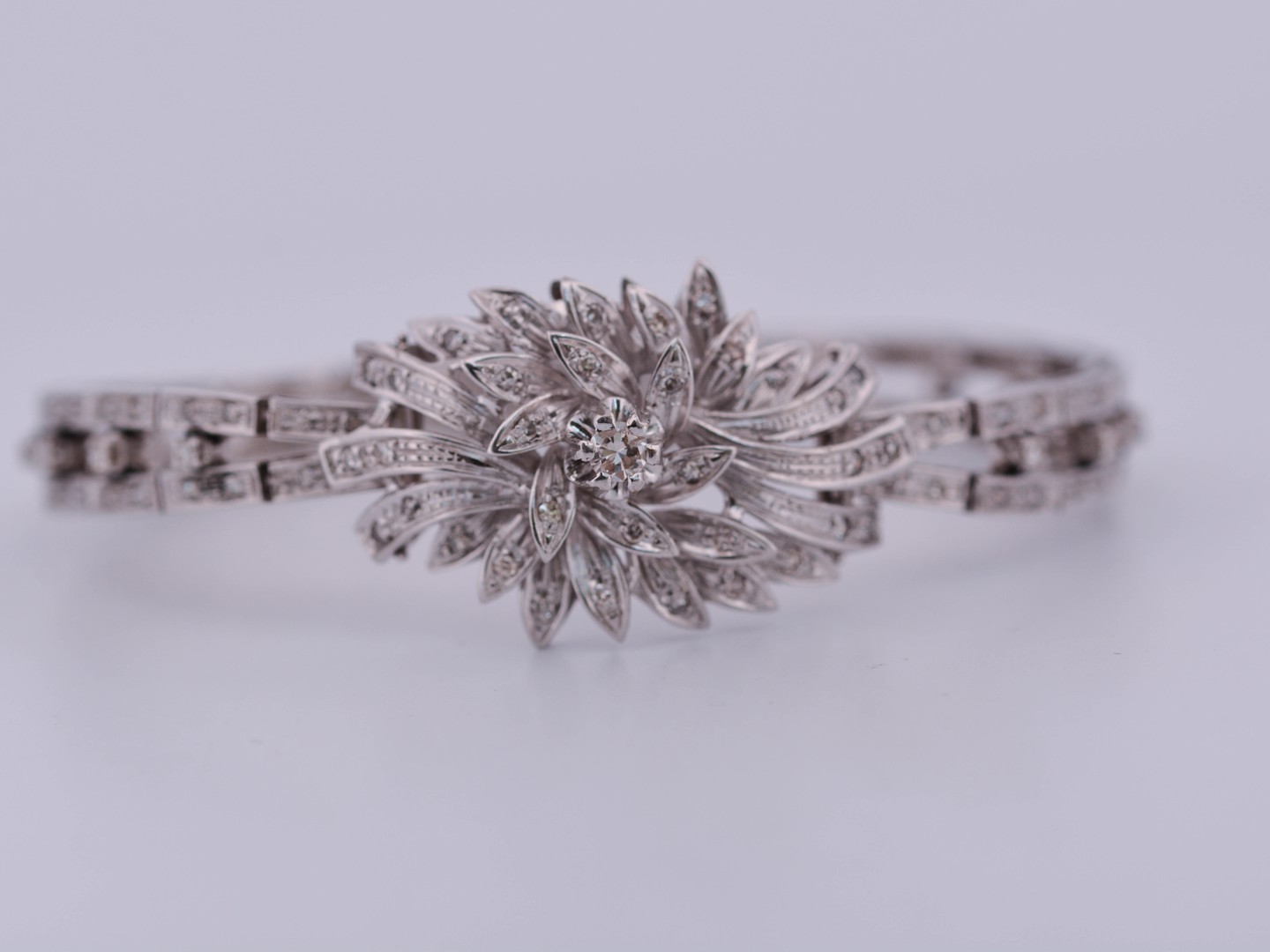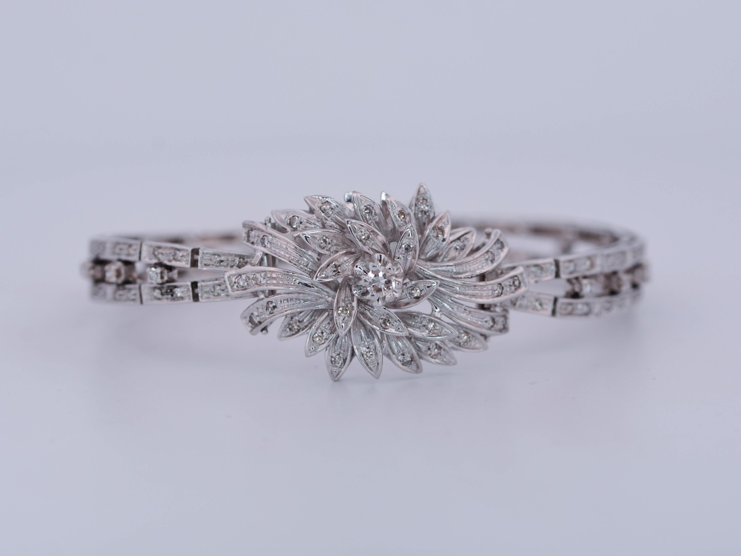 Sertie d’environ 400 diamants taille brillant, totalisant près de 6 carats, de couleur G–H et de pureté VS à SI, la parure rayonne d’une lumière intemporelle. Les boucles d’oreilles mesurent 70 mm, le bracelet 18 cm, pour un poids total de 86,5 grammes.