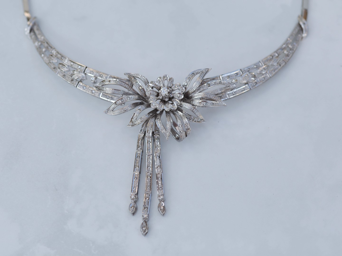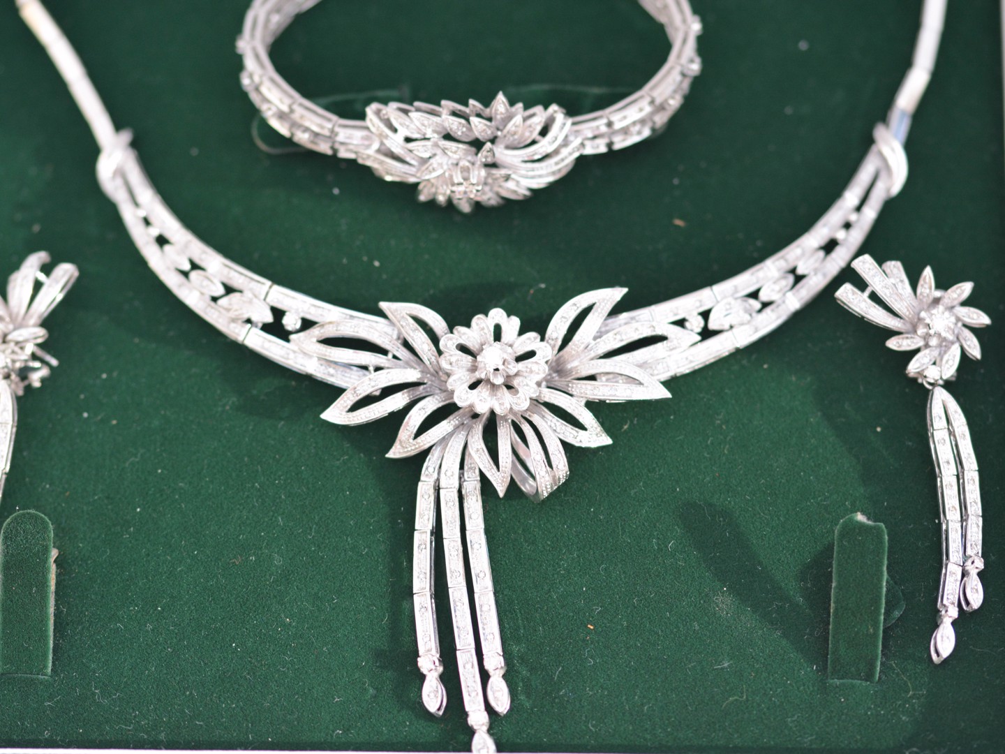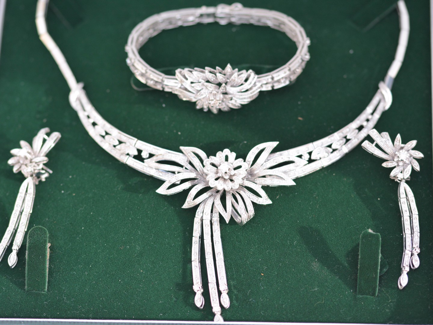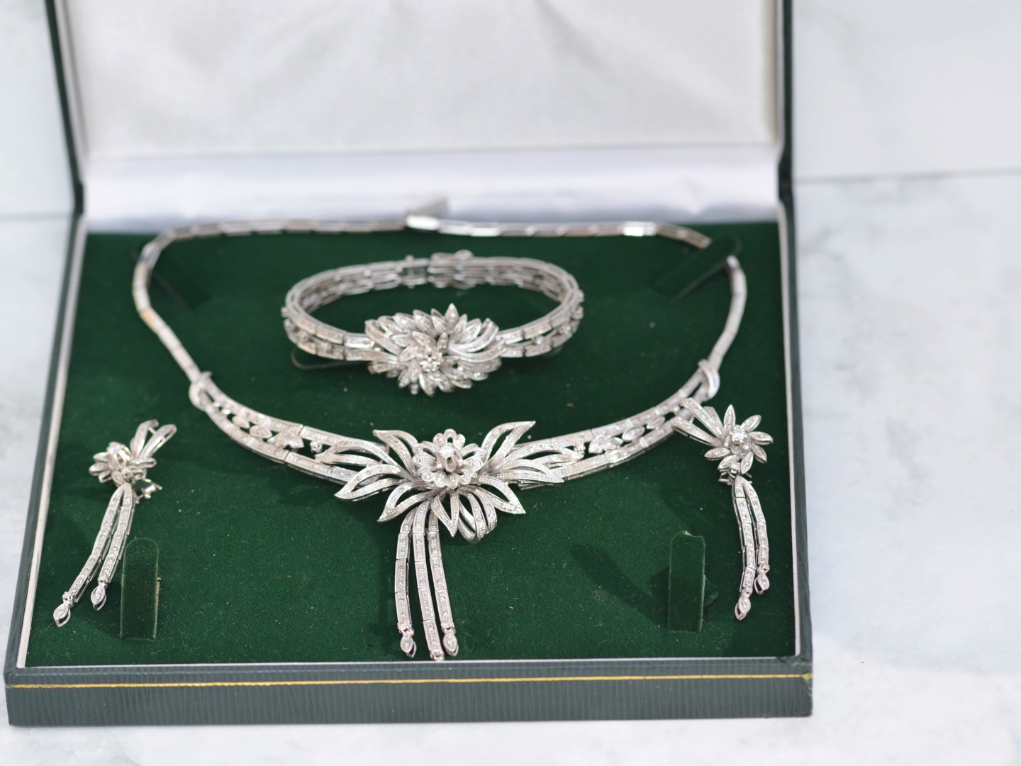 Exceptionnelle parure datant d’environ 1930, comprenant un collier, un bracelet et une paire de boucles d’oreilles, réalisée en or blanc 18 carats. Ce magnifique ensemble incarne l’élégance raffinée et le savoir-faire de la joaillerie du début du XXe siècle.