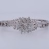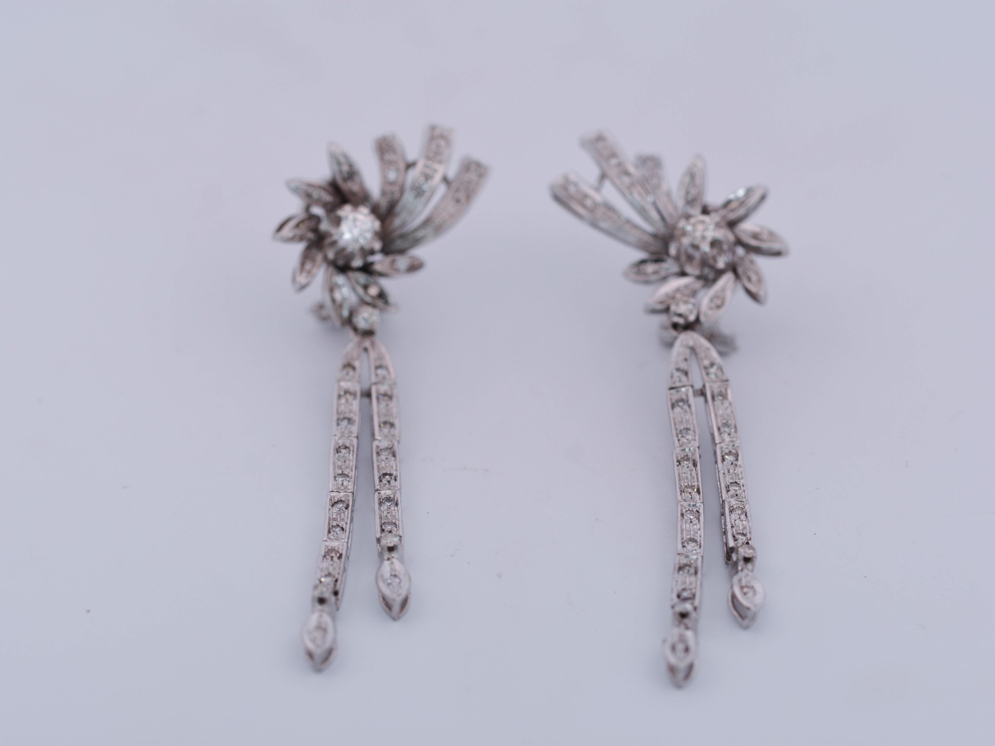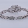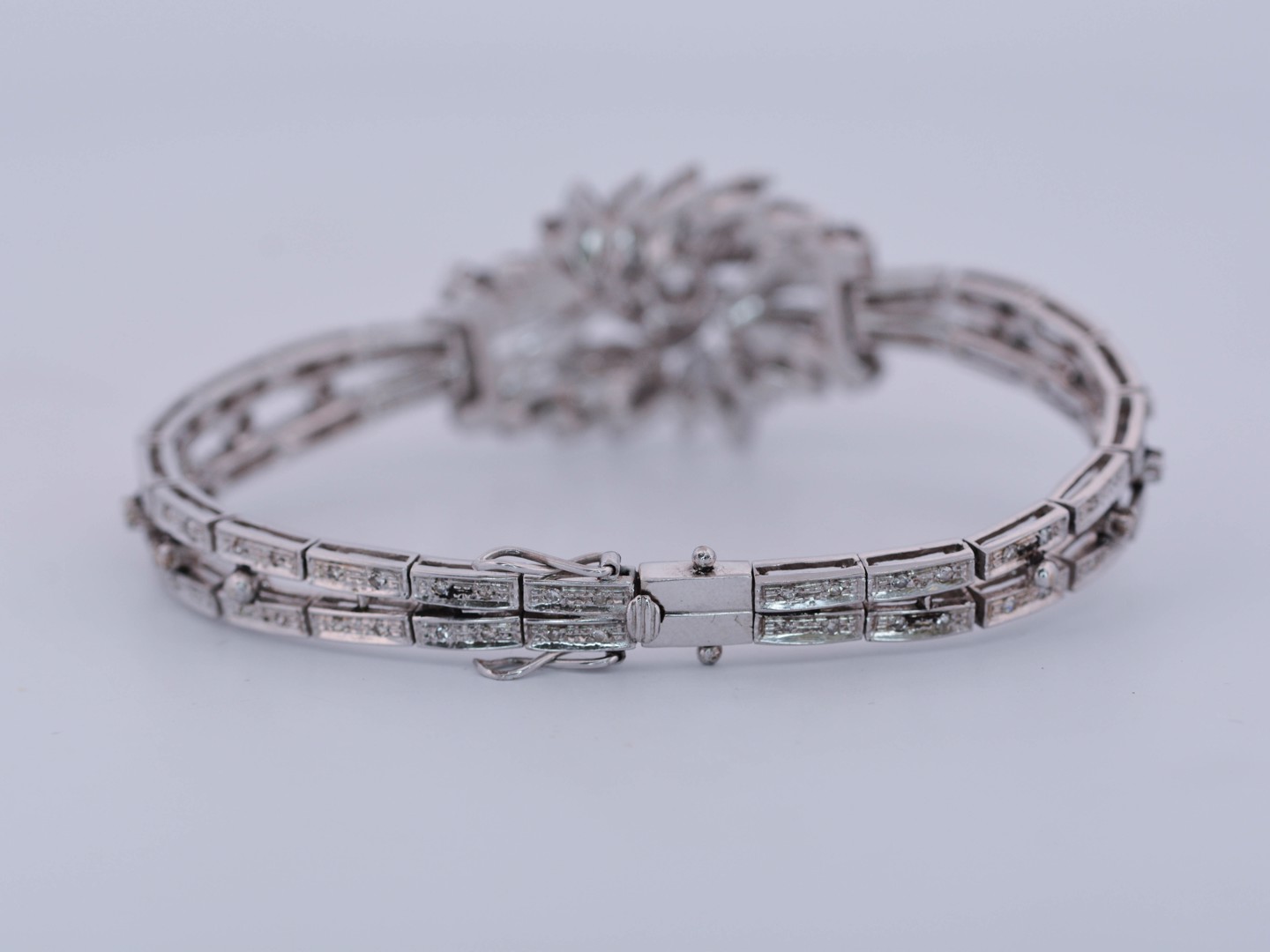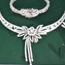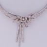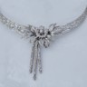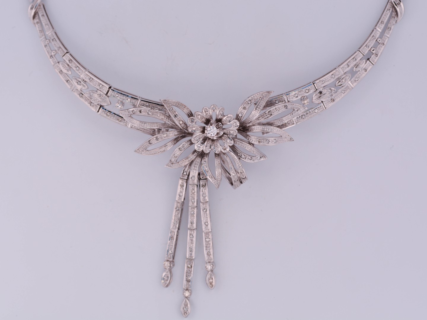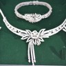 Exceptionnelle parure datant d’environ 1930, comprenant un collier, un bracelet et une paire de boucles d’oreilles, réalisée en or blanc 18 carats. Ce magnifique ensemble incarne l’élégance raffinée et le savoir-faire de la joaillerie du début du XXe siècle.