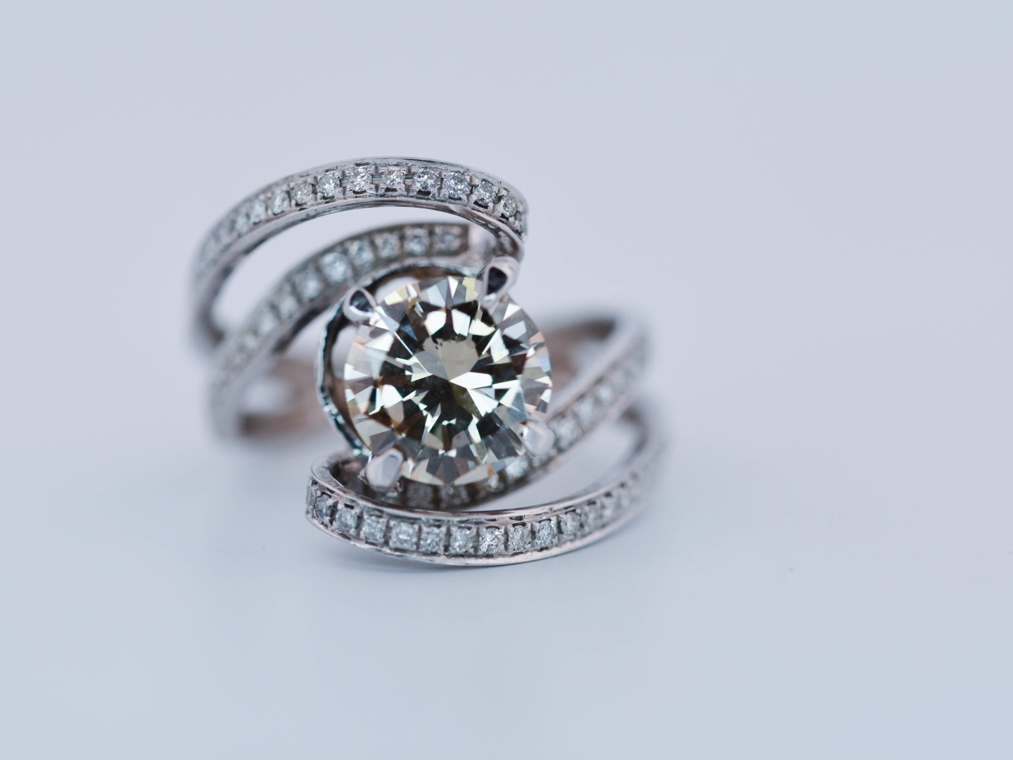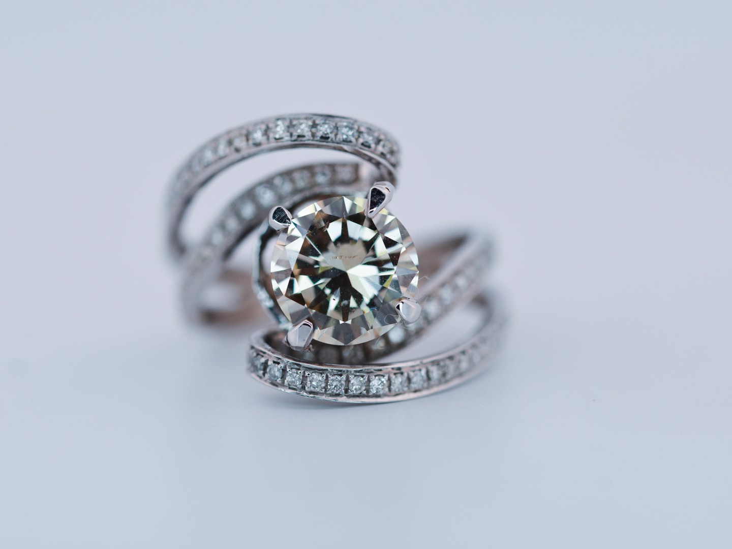 Superbe bague en or blanc 18 carats, ornée d’un diamant taille brillant d’environ 2 carats, de teinte rare Fancy Light Yellow, d’une pureté VS.