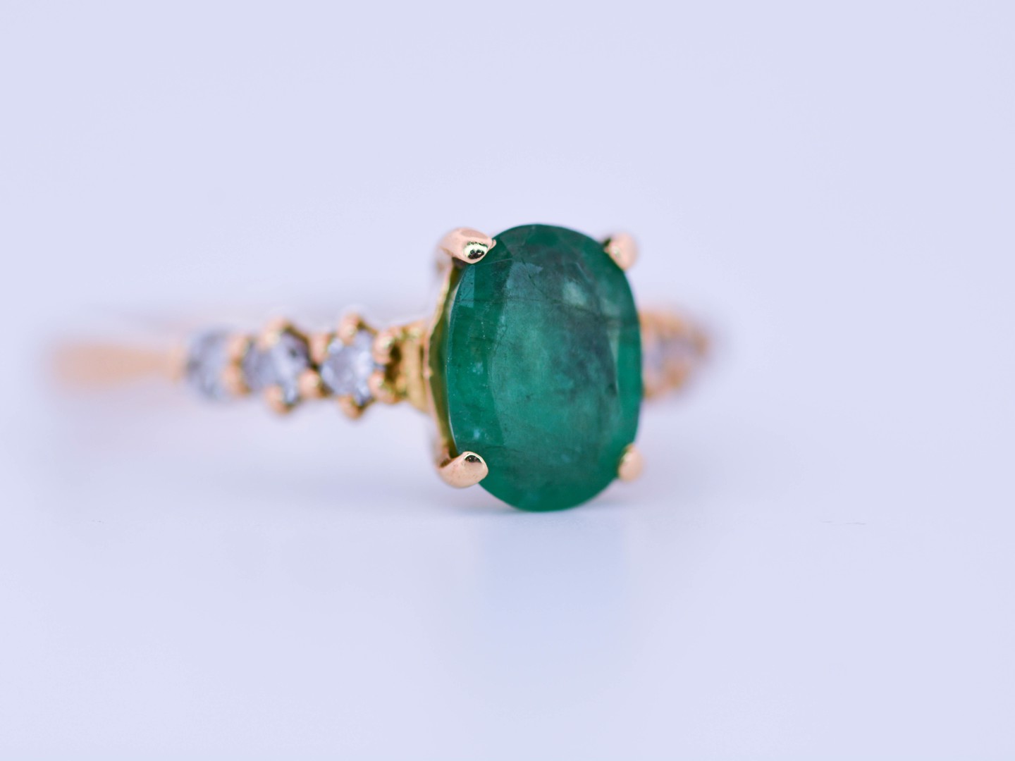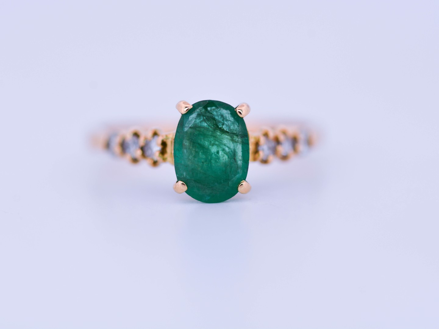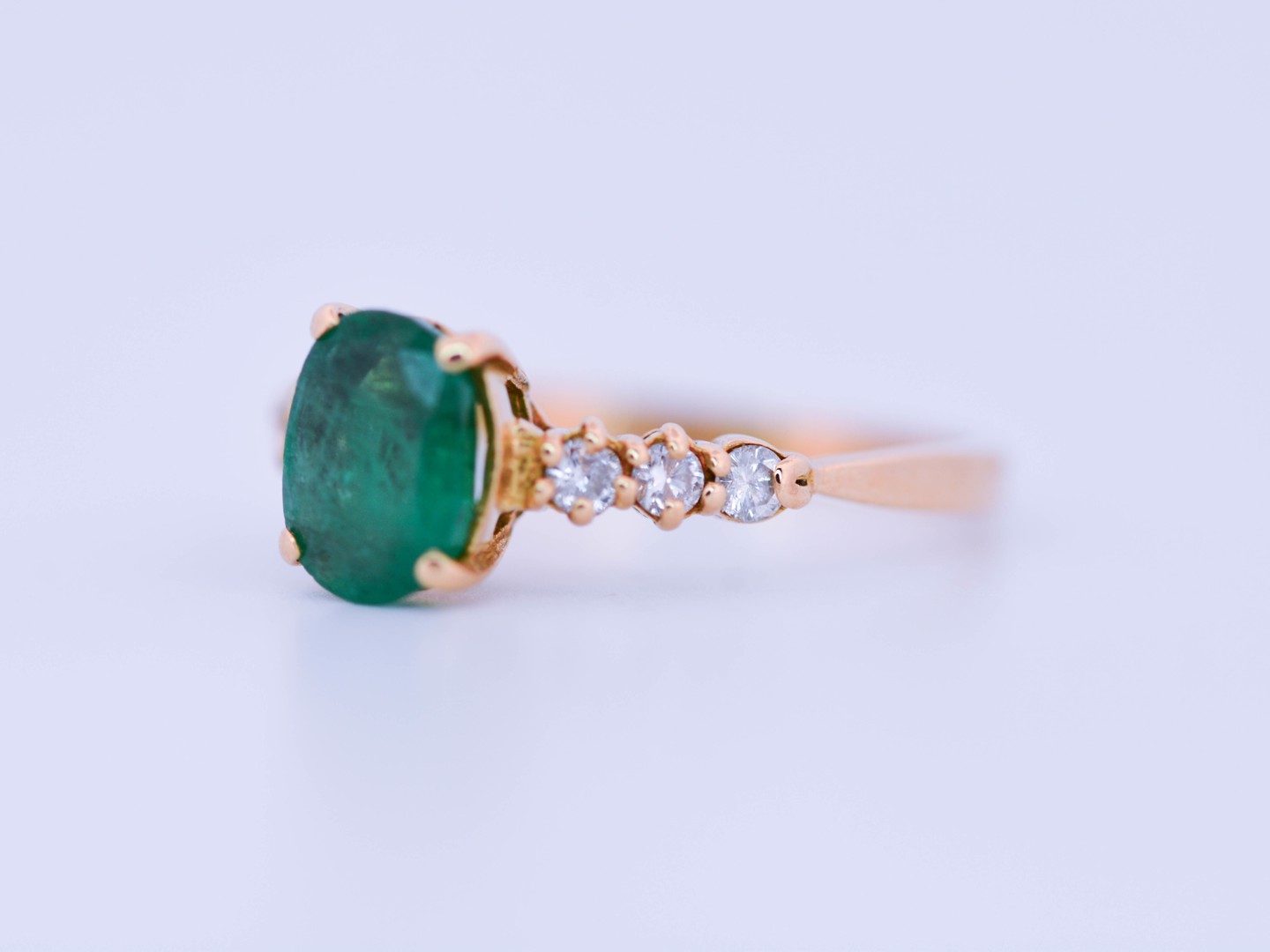 Bague en or jaune 18 carats, sertie d’une émeraude de Colombie d’environ 0,70 carat, réputée pour son vert intense et lumineux. La pierre centrale est délicatement entourée de six diamants taille brillant, de couleur I et de pureté VS, qui soulignent la beauté naturelle de l’émeraude.