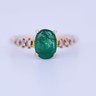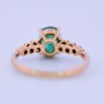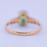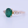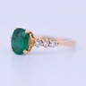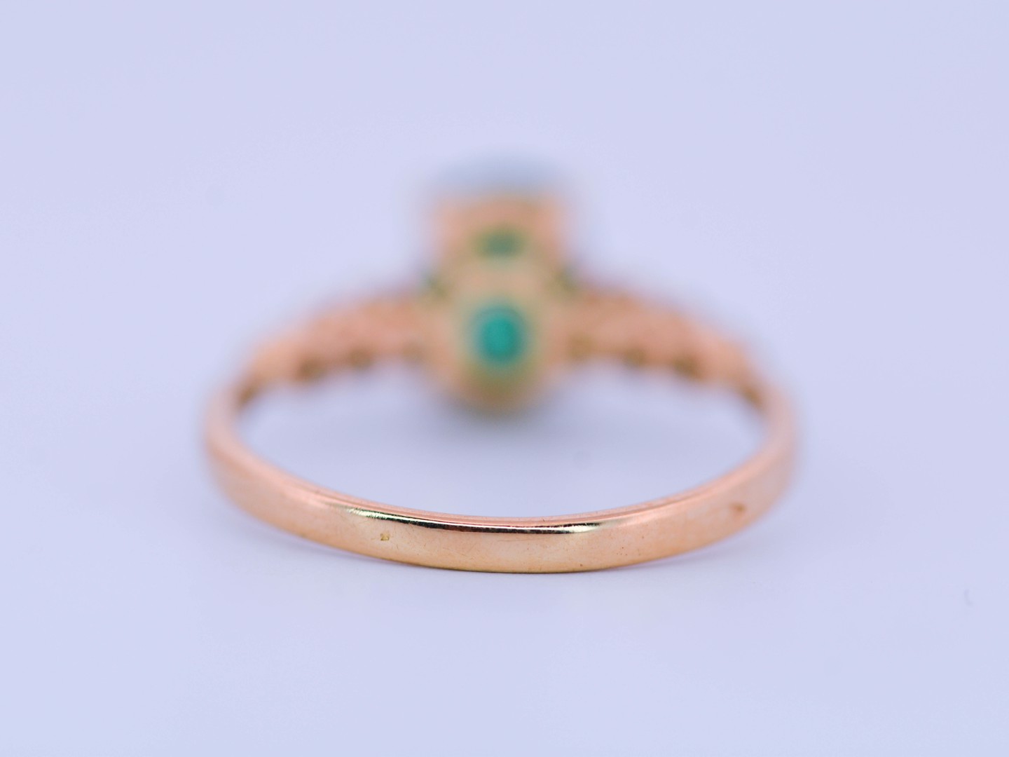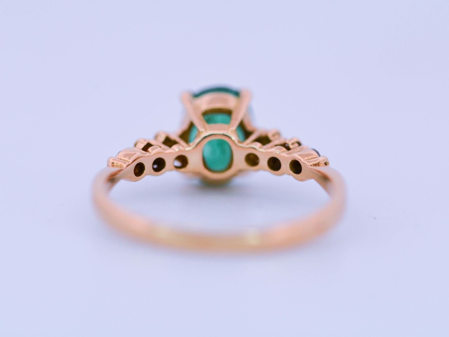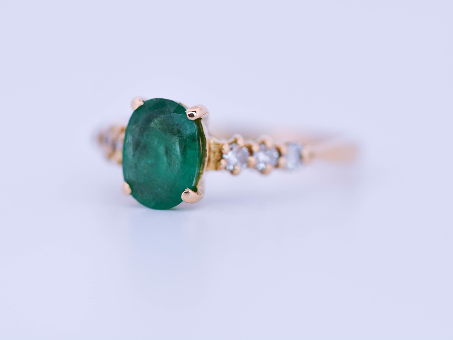 Bague en or jaune 18 carats, sertie d’une émeraude de Colombie d’environ 0,70 carat, réputée pour son vert intense et lumineux. La pierre centrale est délicatement entourée de six diamants taille brillant, de couleur I et de pureté VS, qui soulignent la beauté naturelle de l’émeraude.