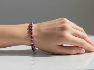 Bracelet rivière serti de 28 rubis : +-12,30CT (marqué) + 56 petits diamants blancs : +-0,55CT
