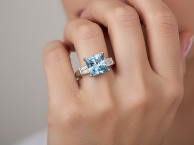 Bague de Qualité avec Diamant Bleu Taille Princesse de 4,5 ct et 0,40 ct de Diamants Blancs Taille Baguette