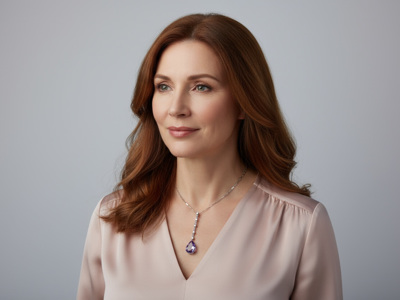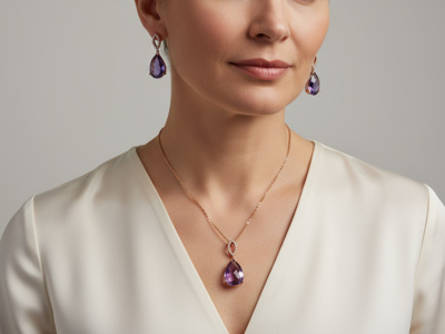 Collier avec pendentif et boucles en or roze serti de diamants et améthystes