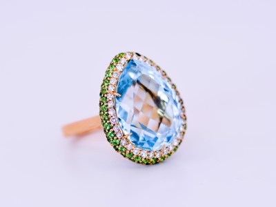 Grande bague exclusive en or rose avec topaze bleue, tourmalines et diamants – env. 17,00 ct