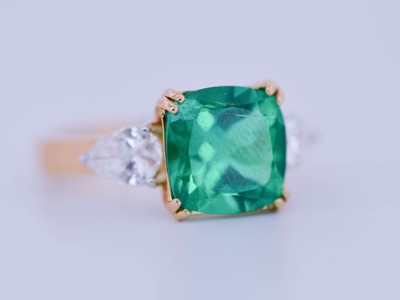 Bague de qualité avec 1 émeraude + 2 diamants taille poire