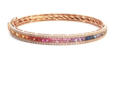 Enige armband color stones, bezet met saffier, robijn, ametyst, peridot en citrine stenen, totaal: +-4.50ct, omringd door 2 rijen briljanten