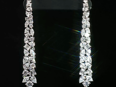 Sublieme lange oorhangers bezet met witte diamanten: 20 peer + 10 smaragd + 10 marquise + 28 briljant geslepen, totaal: +-8.80ct