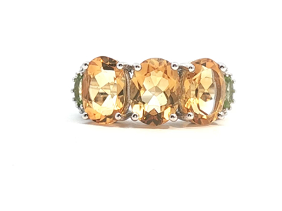 Modieuze ring bezet met 3 gele citrines: +-3.00ct + 2 kleine groene peridot stenen + 16 kleine witte briljanten