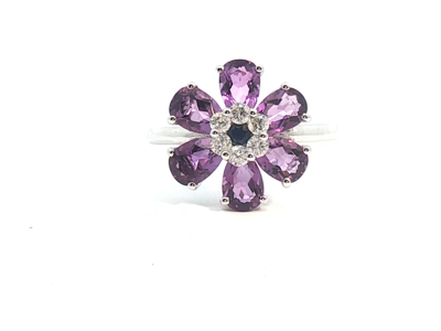 Elegante ring bezet met 6 amethysten: 1.90ct (gemerkt) + 1 kleine saffier + 6 witte briljanten