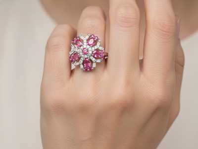 Modieuze ring bezet met 16 robijnen: 1.30ct (gemerkt). Omringd door witte diamanten: 10 baguette + 20 briljant geslepen
