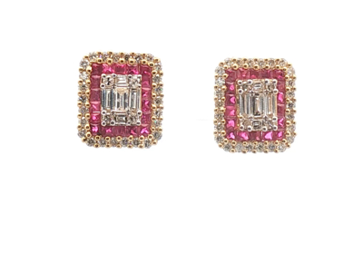 Paar elegante oorbellen bezet met 36 robijnen prinses geslepen: 0.90ct (gemerkt) + witte diamanten: 8 baguette + 68 briljant geslepen
