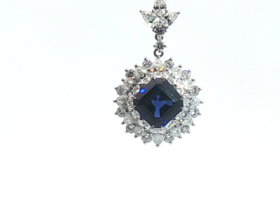 Halsketting-hanger bezet met 1 London blue saffier van +-3.00ct. Omringd door witte diamanten, briljant en peer geslepen