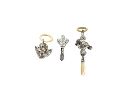 Lot van 2 antieke rammelaars in zilver + papierhouder in zilver