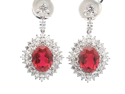 Paar elegante oorhangers bezet met 2 robijnen: +-5.00ct vivid red transparant, omringd door 2 rijen briljanten