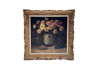 Schilderij olie op doek getekend: Dindale-Etienne, circa 1950. 'Bloemstilleven'